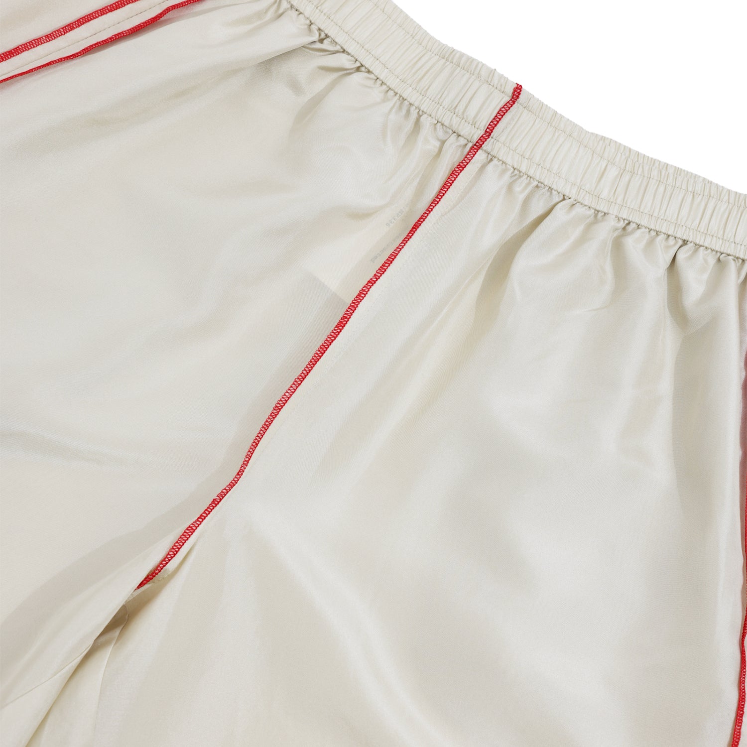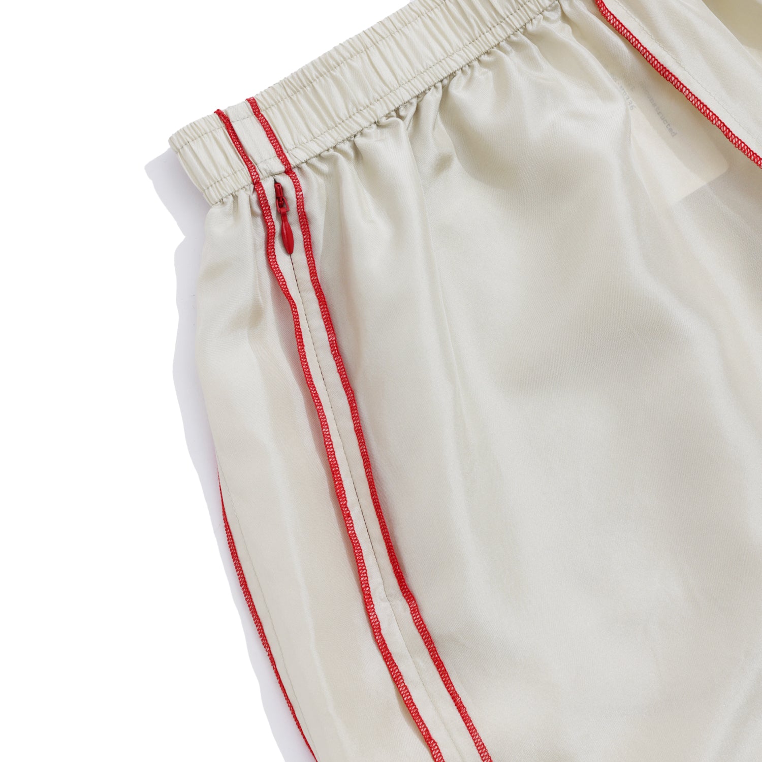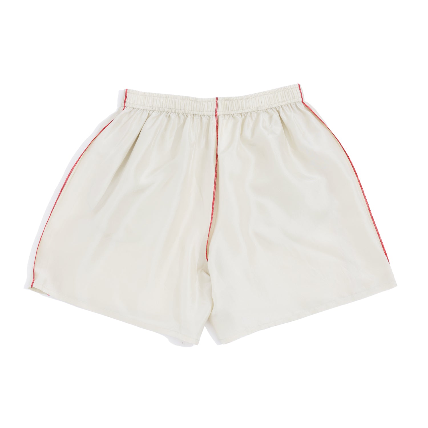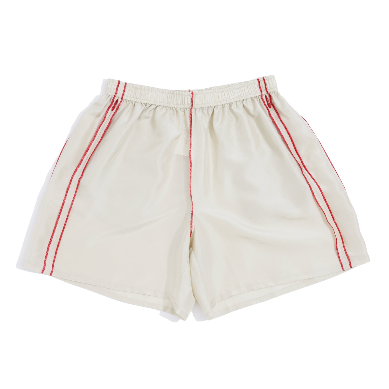 Pull-on short cut in a lightweight silk habotai. Deconstructed contrast marrow stitch detail on side and middle seams. Hidden, side zipper pockets. Full leg opening that falls mid-thigh. Easy, comfortable and cool.