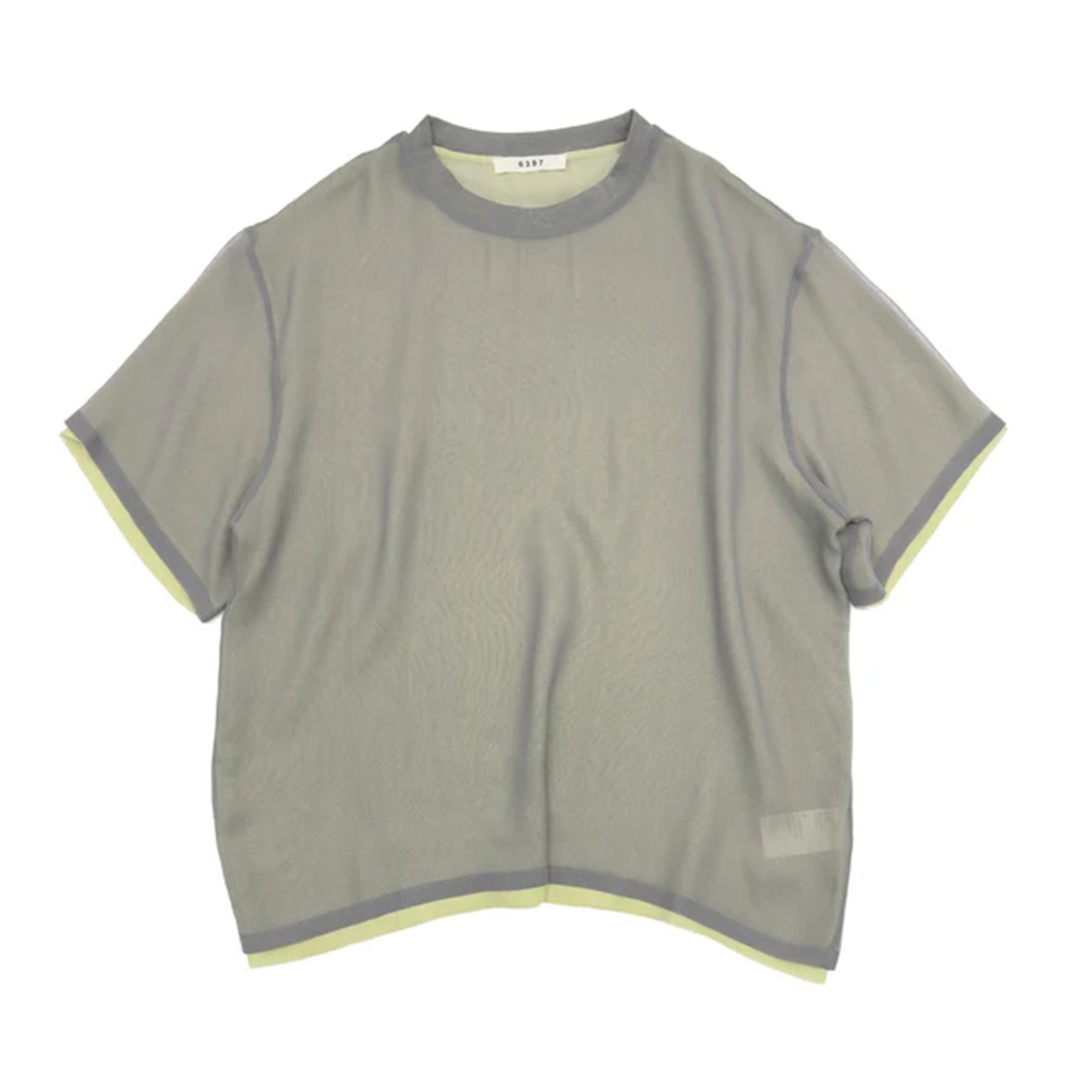 Our Double Layer T-Shirt is cut in a silk chiffon. It has boxy proportions with a contrast, cotton rib trim at neckline. Loose, billowing sleeve and slightly dropped shoulder.