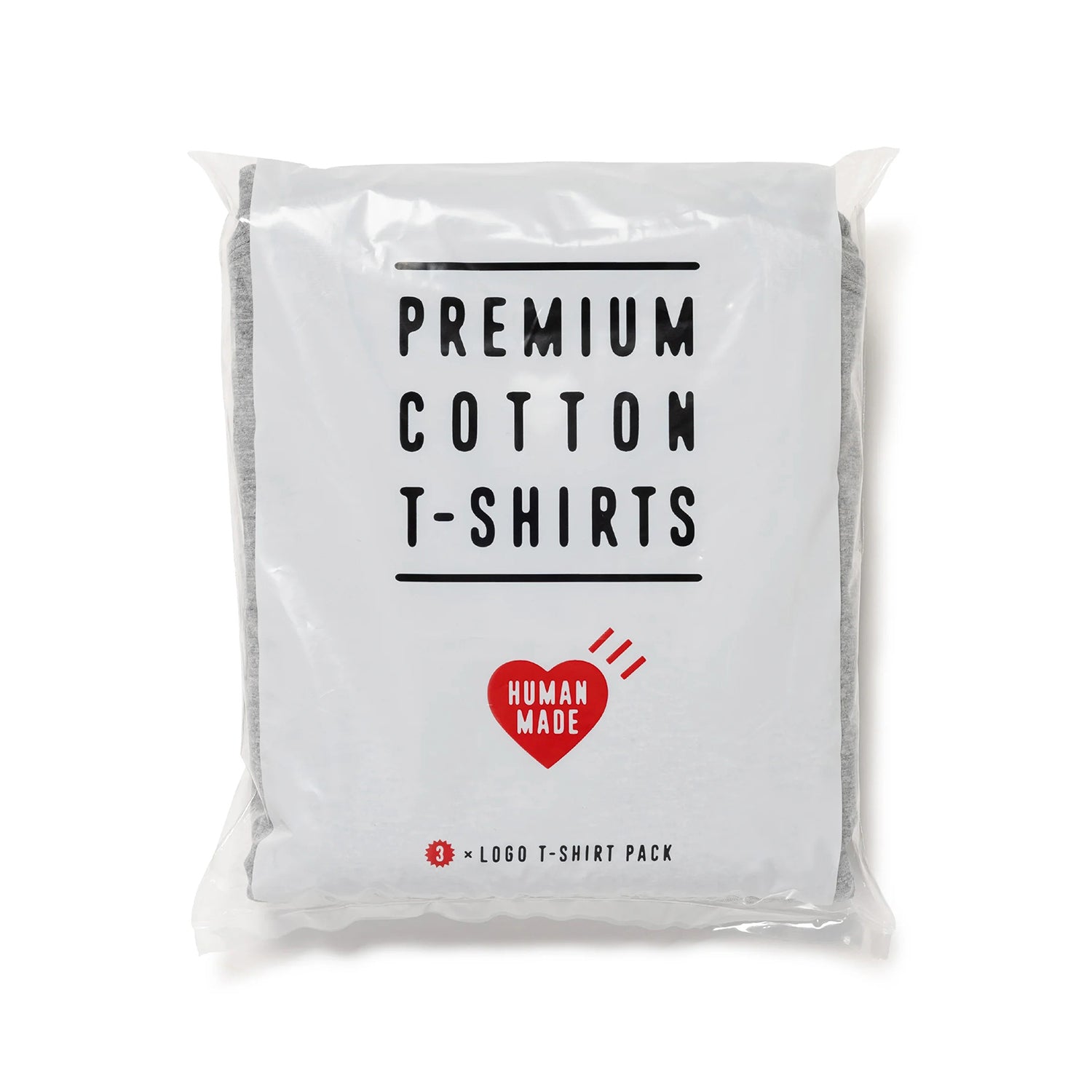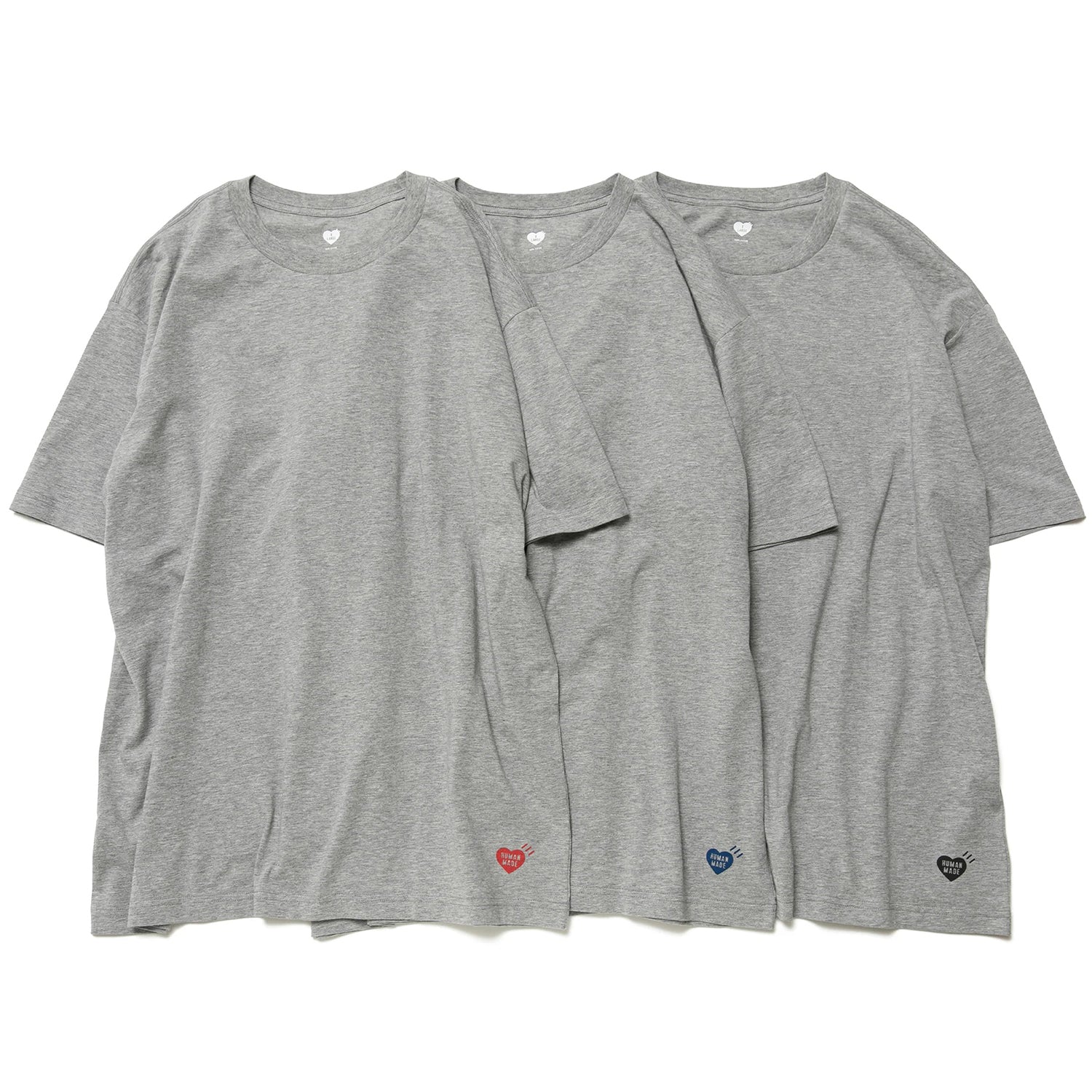 Set of three T-shirts, each with a different colored heart logo printed on the left hem.