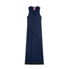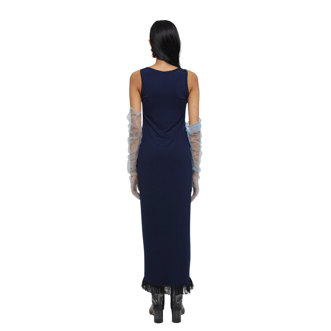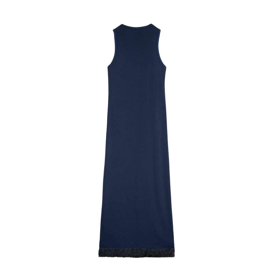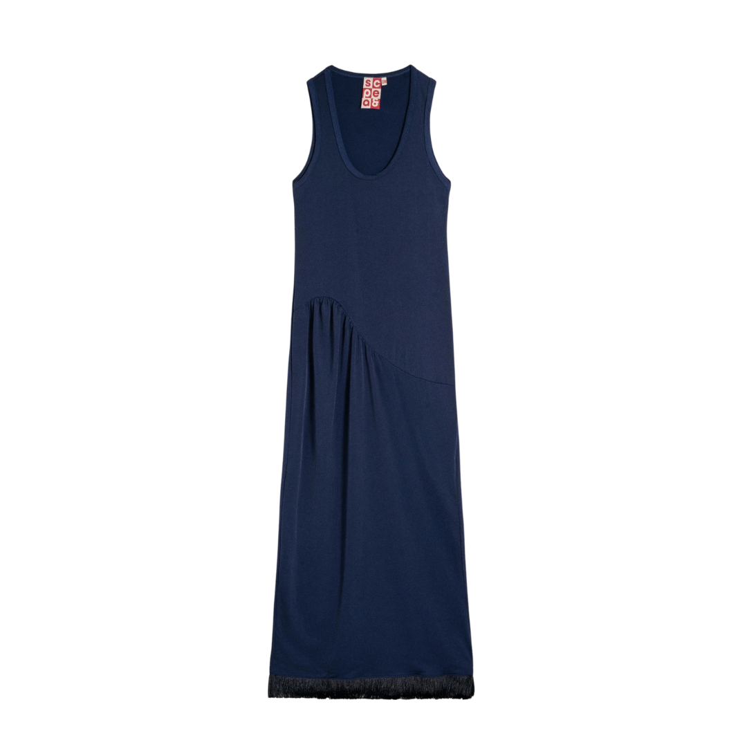 Maxi-length dress with a scoop neckline and fringe detailing along the bottom hem.