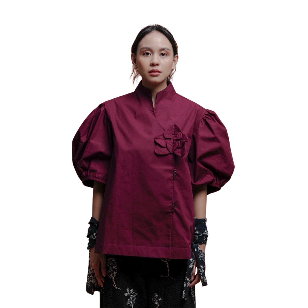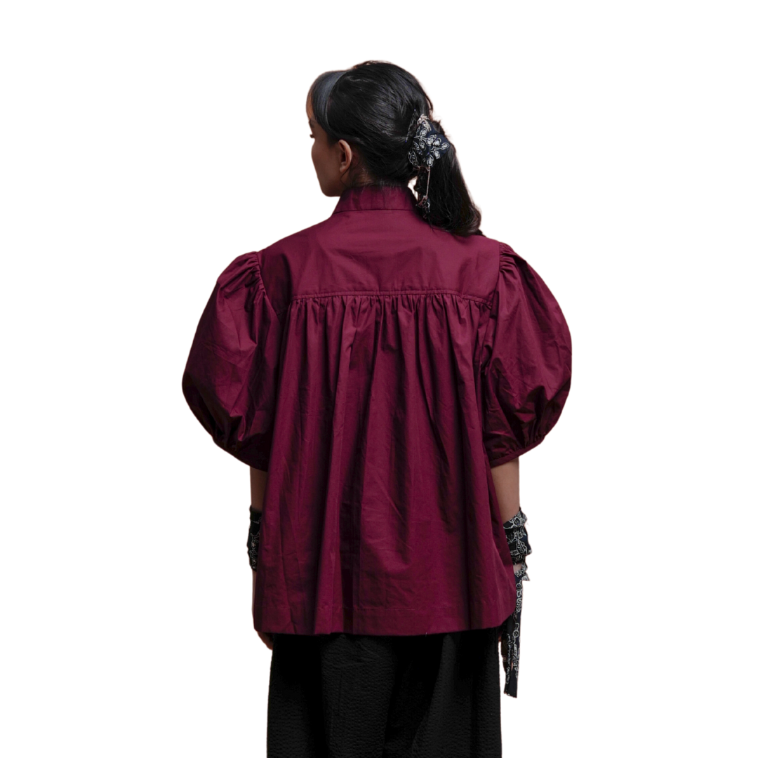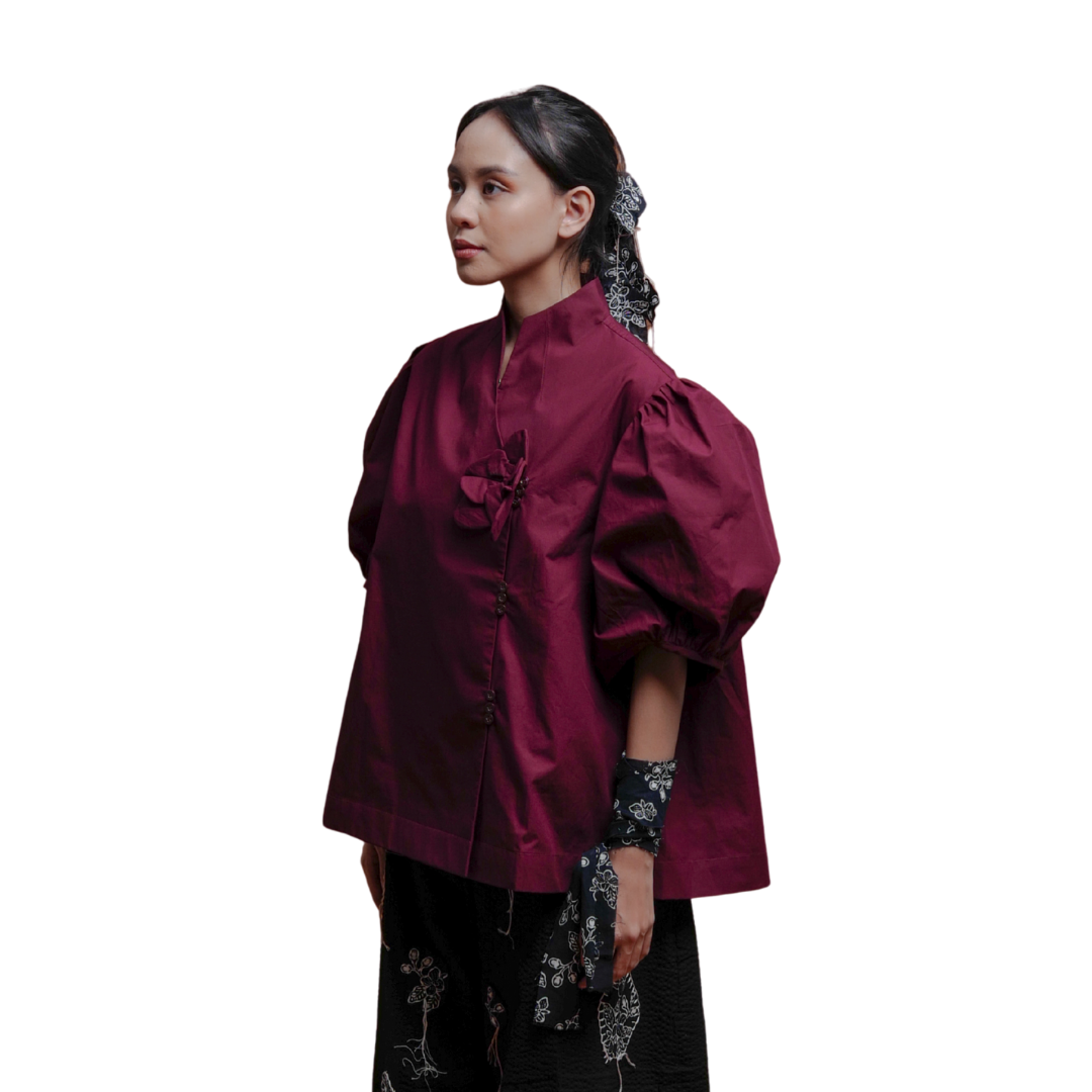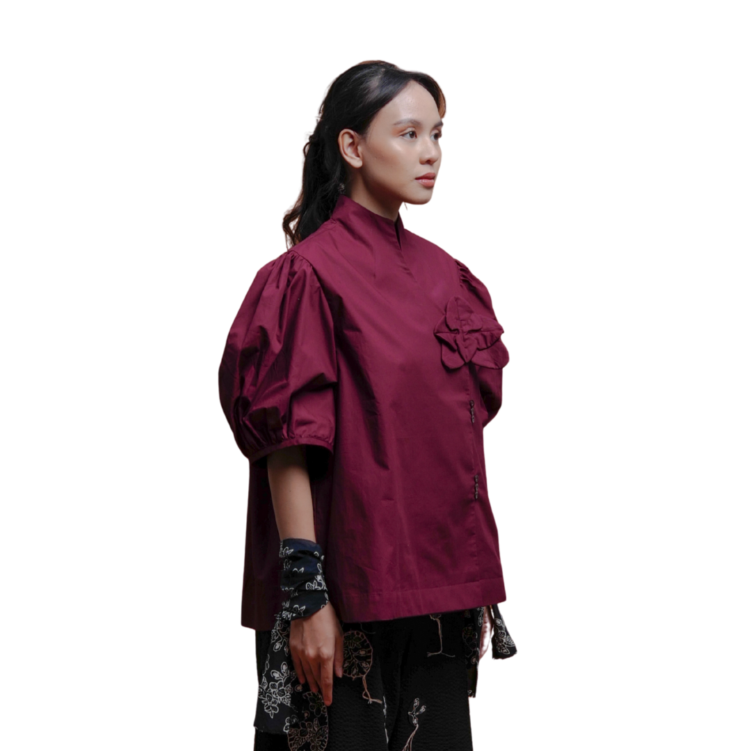 "Aru" means "to exist" in Japanese—a quiet nod to presence, to simply being. Designed with a boxy silhouette, long puff sleeves, and ruffle detailing along the back, the Aru Shirt blends historical references with everyday ease. Its cheongsam-inspired front opening and mandarin-style collar add a refined touch rooted in tradition.