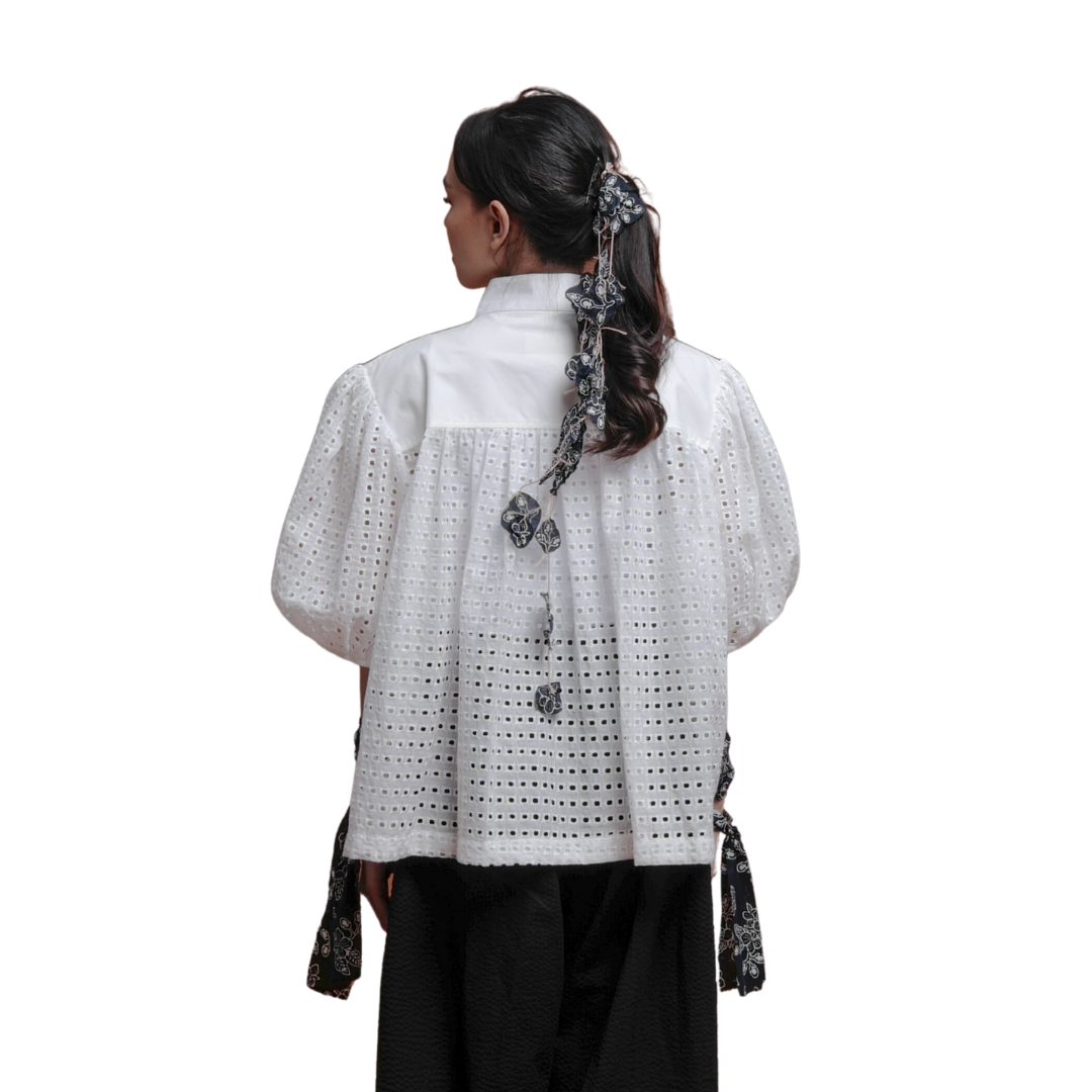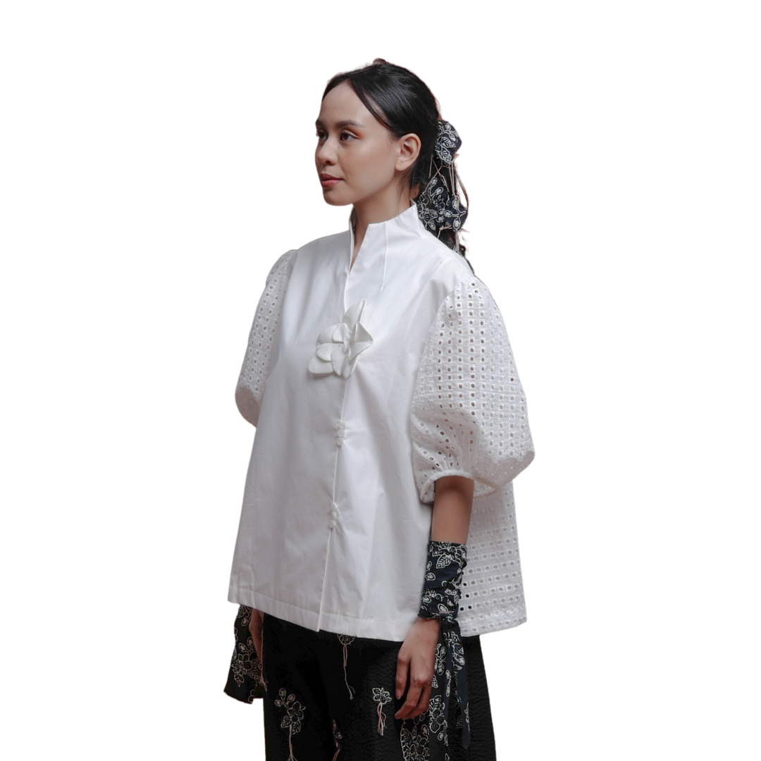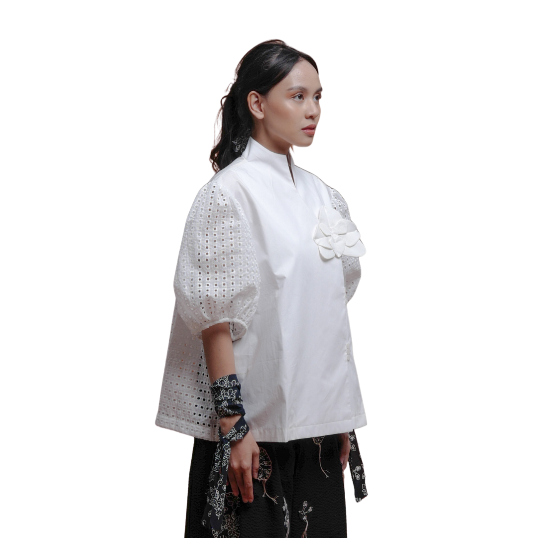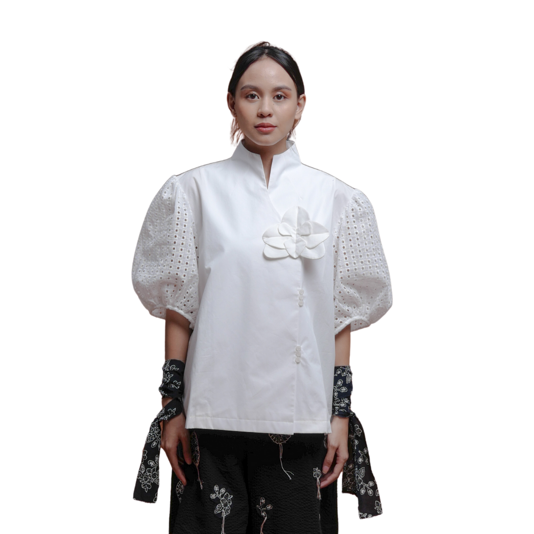 "Aru" means "to exist" in Japanese—a quiet nod to presence, to simply being. Designed with a boxy silhouette, long puff sleeves, and ruffle detailing along the back, the Aru Shirt blends historical references with everyday ease. Its cheongsam-inspired front opening and mandarin-style collar add a refined touch rooted in tradition.