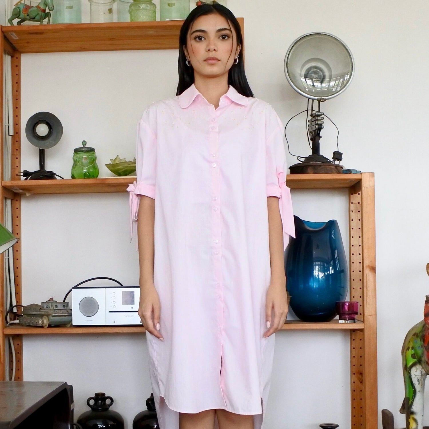 Shirtdress made from !00% Cotton Poplin fabric made in oversized fitting. Adorned with subtle hand-beaded embellishments on the sleeves, neatly finished with Mote Mote’s buttons.
