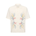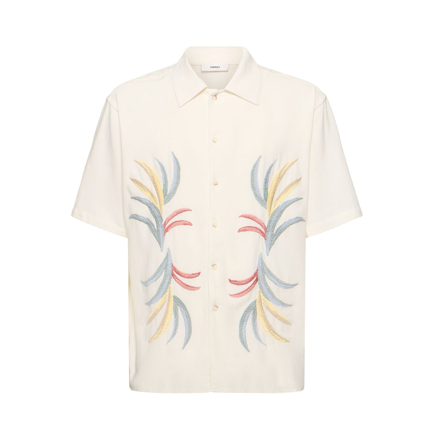 A boxy button-up shirt crafted from a linen-cotton blend, featuring a palm motif embroidery.