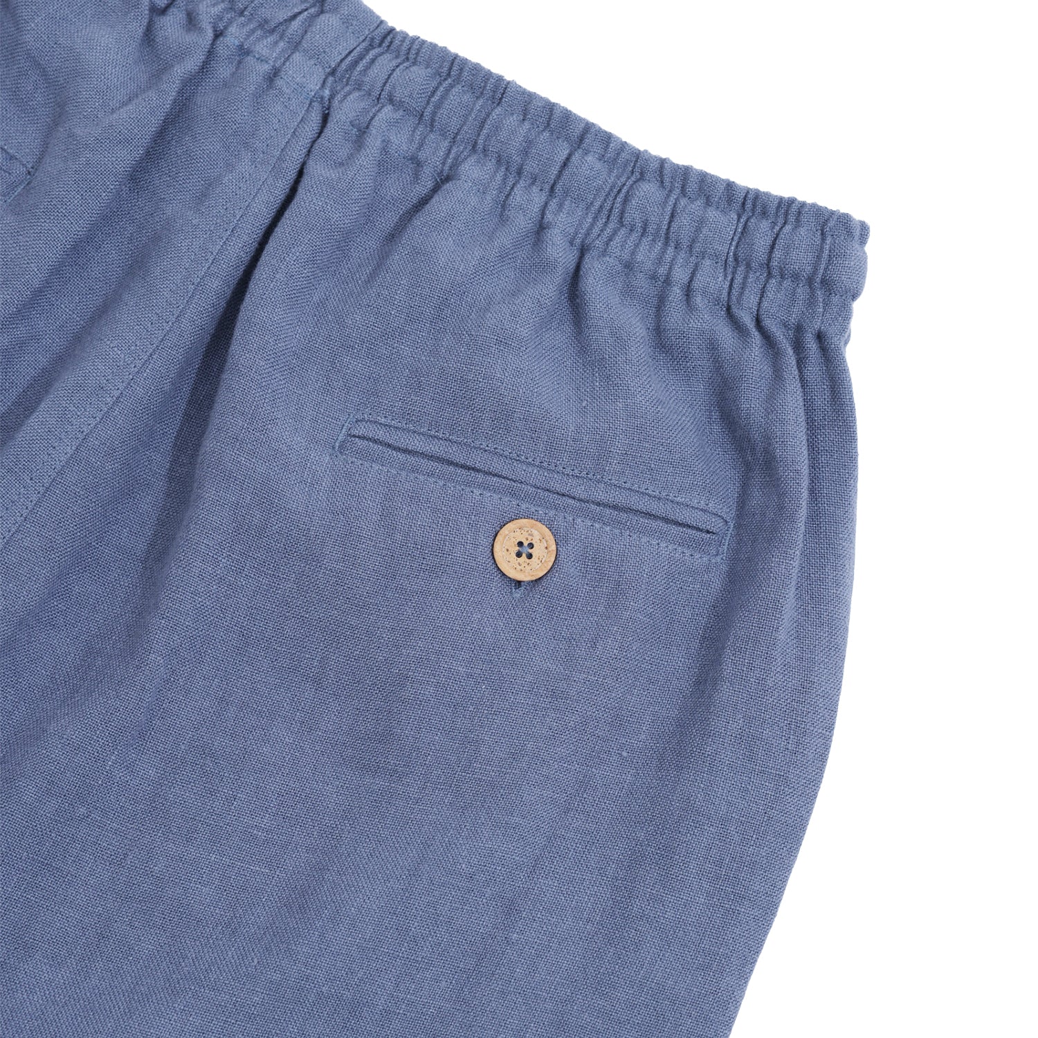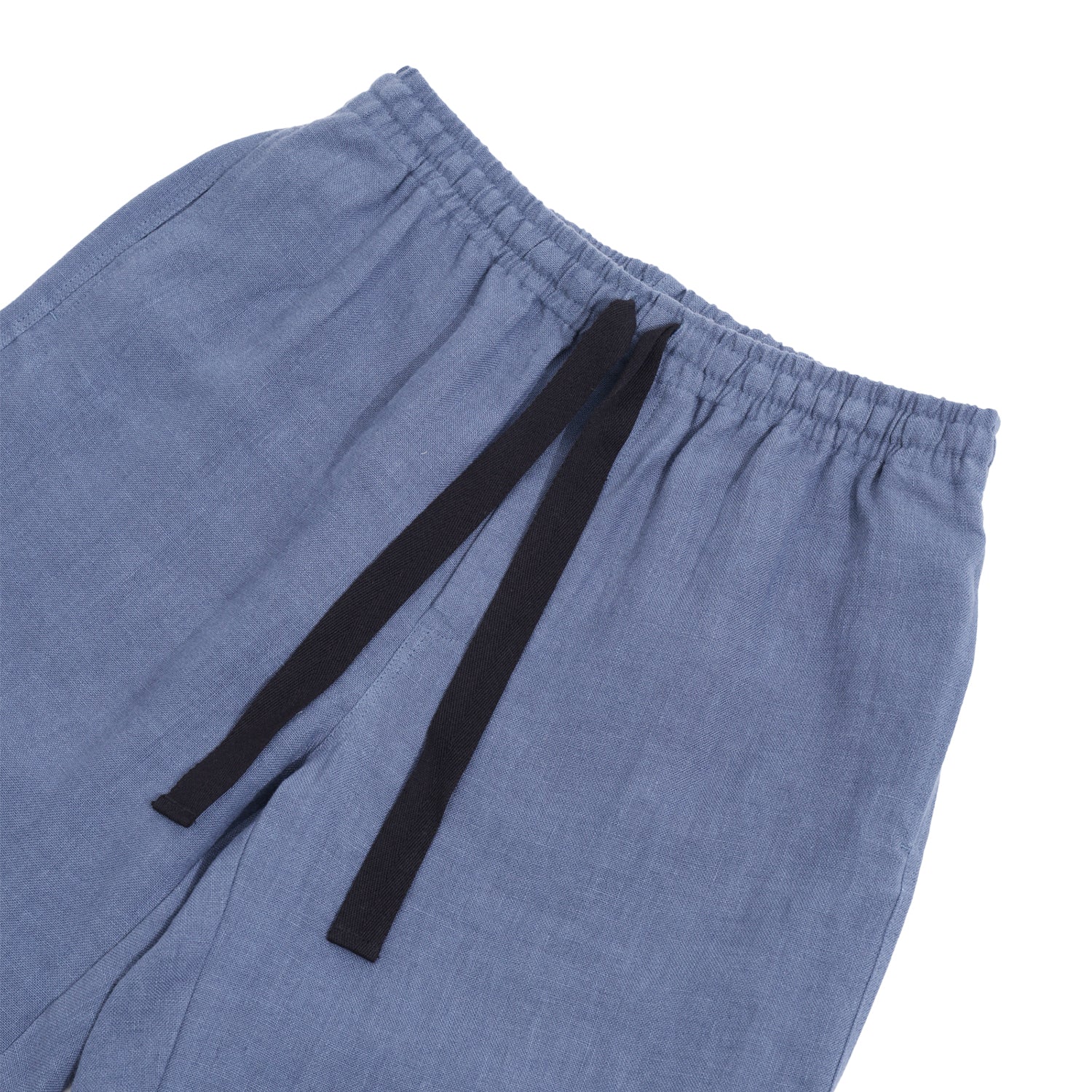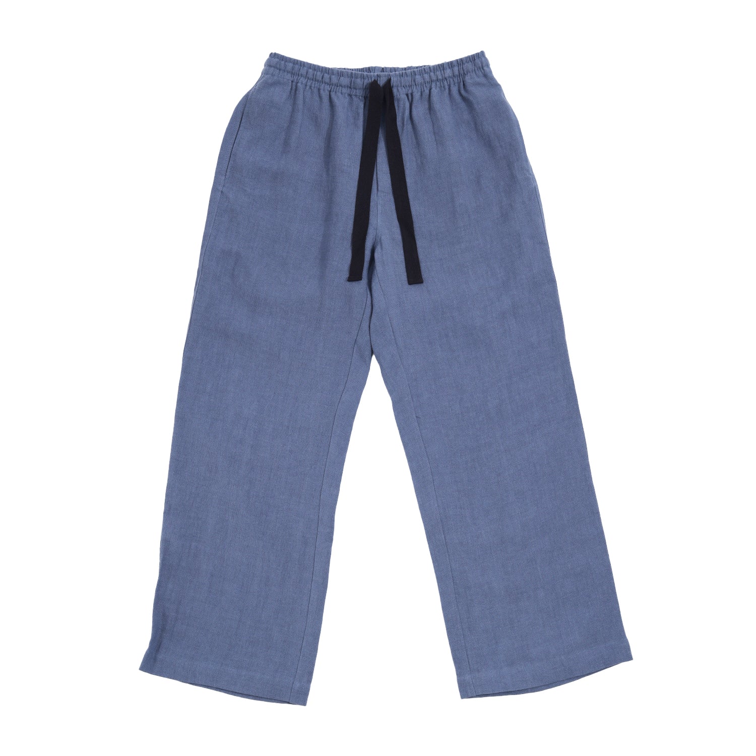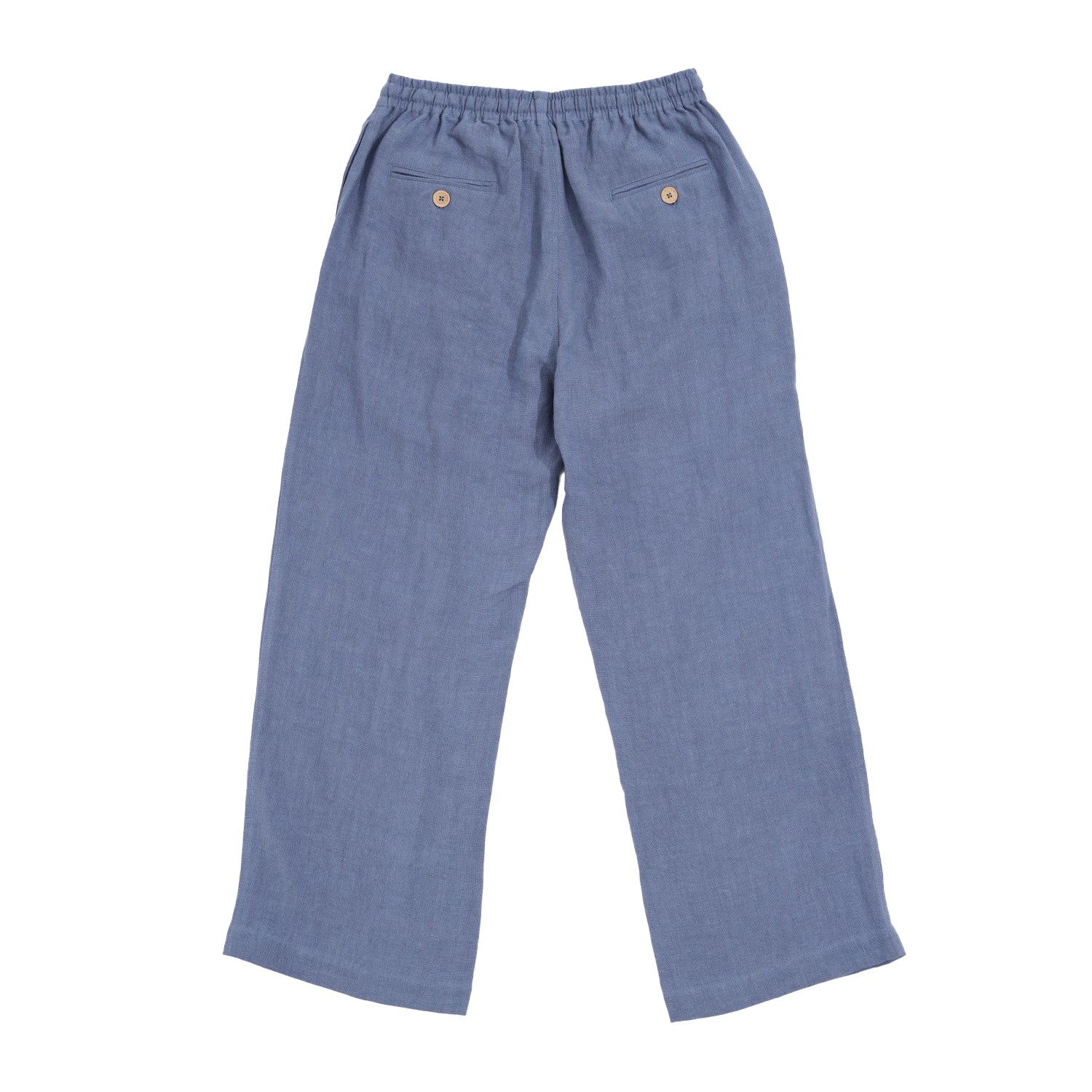Wide leg linen trousers featuring an elasticised waistband and herringbone drawstring.