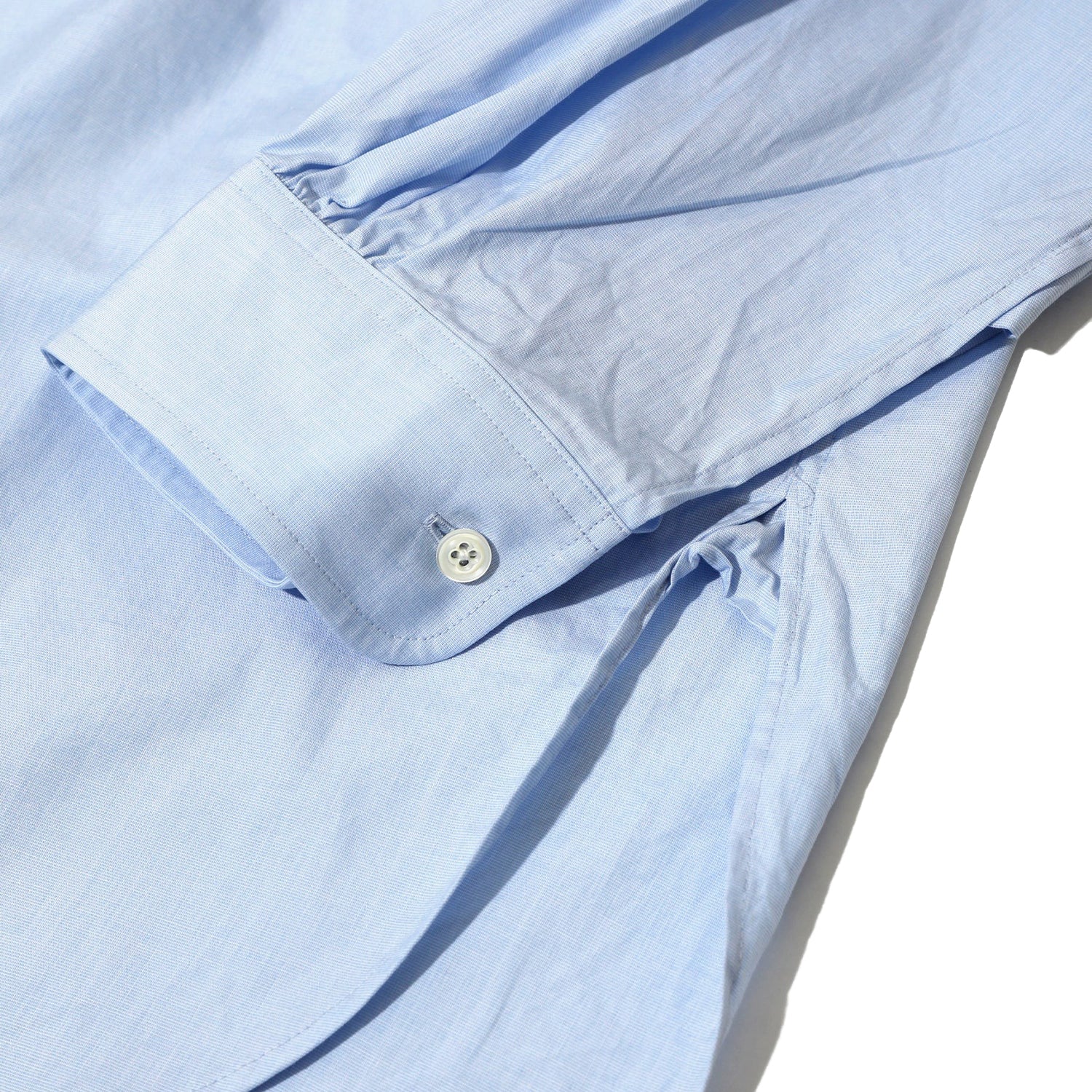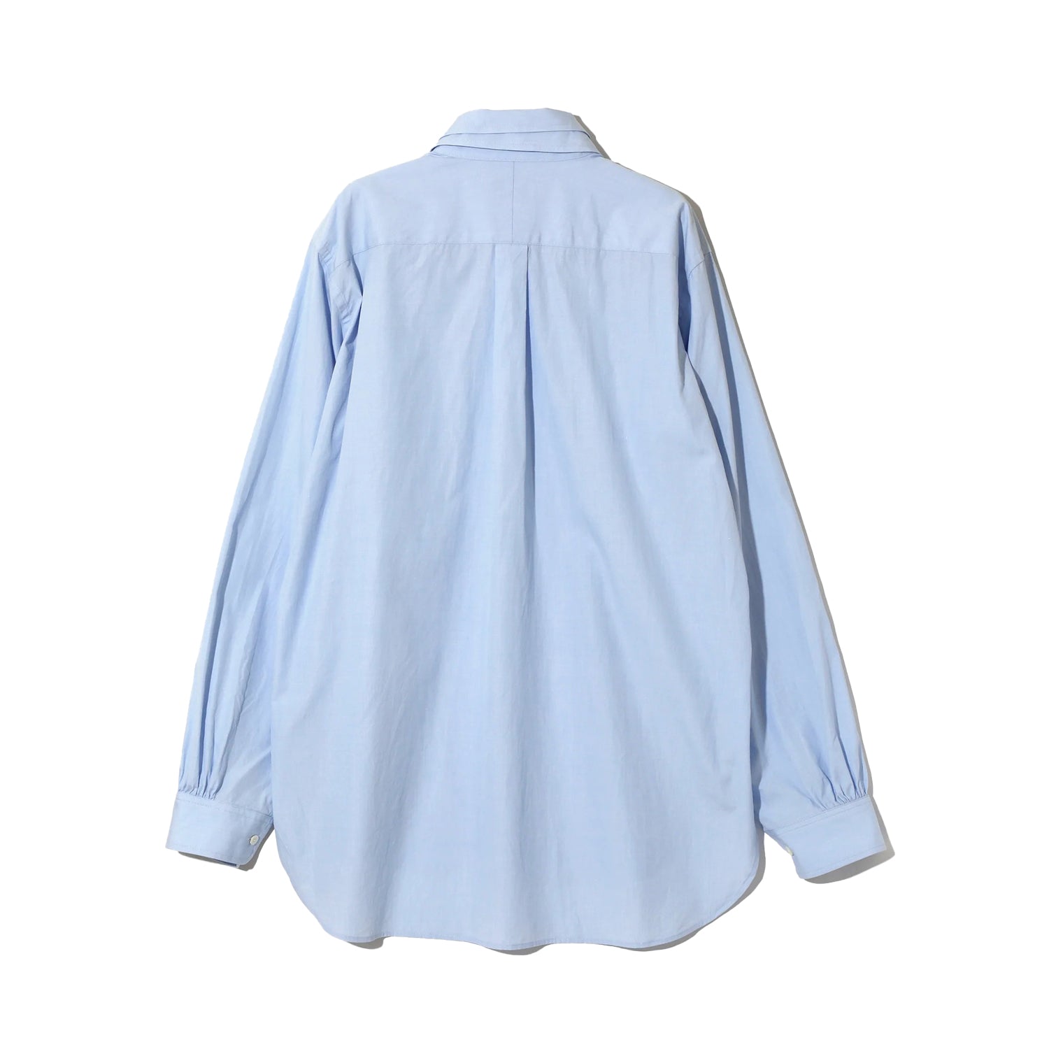 The classic EDW shirt, which incorporates details found in classical dress shirts such as loop buttons, a large round overlapping front, and a gusset, has been released this season with a unique double collar. The collar is an orthodox regular collar, but the double collar makes it a simple yet unique piece with a strong presence. The back is finely gathered, creating a voluminous and glamorous silhouette.