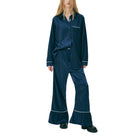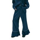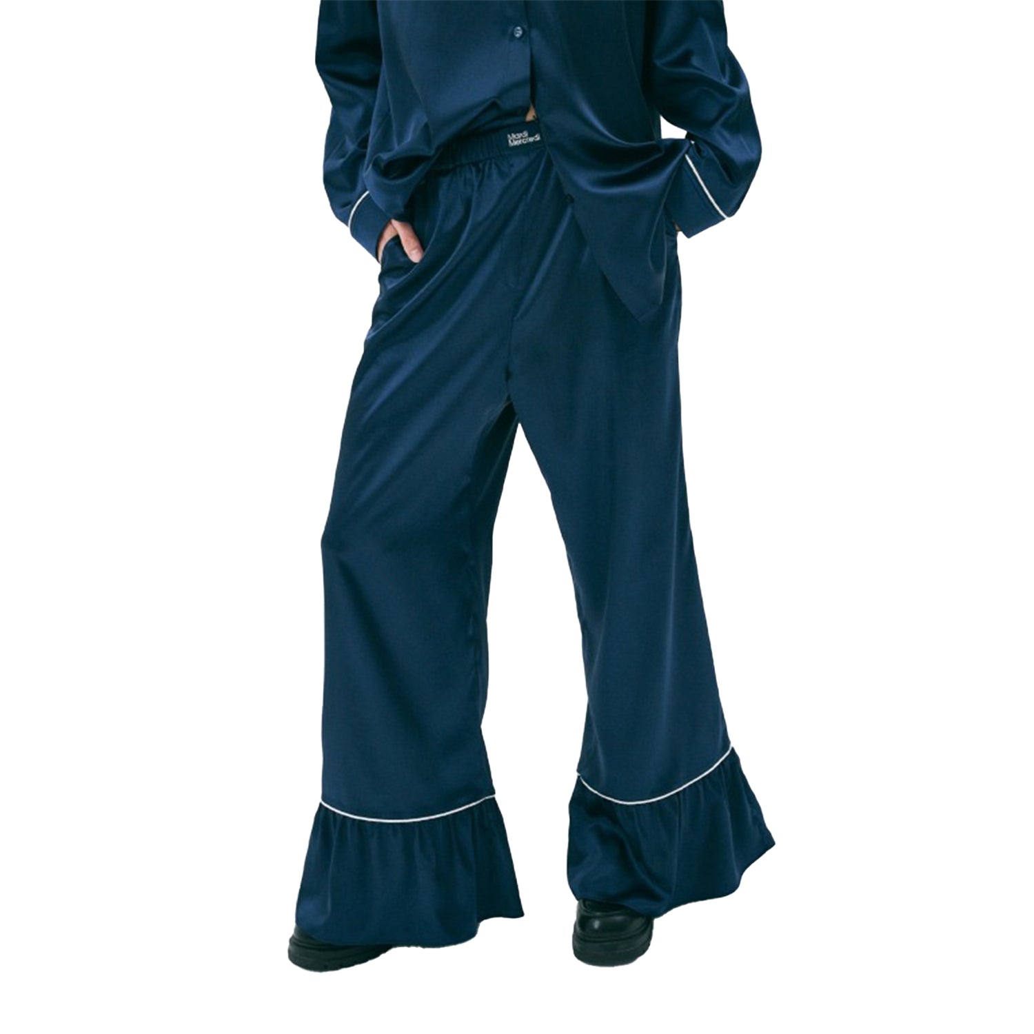 Wide-leg satin trousers with contrast lines along the flared cuffs. Pairs perfectly with the Mardi Mercredi Satin Oversized Shirt.