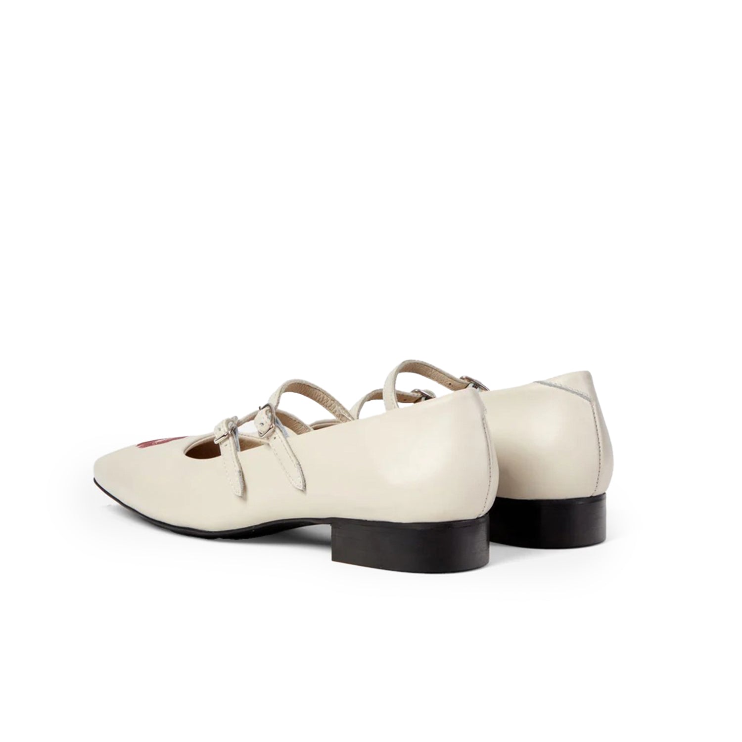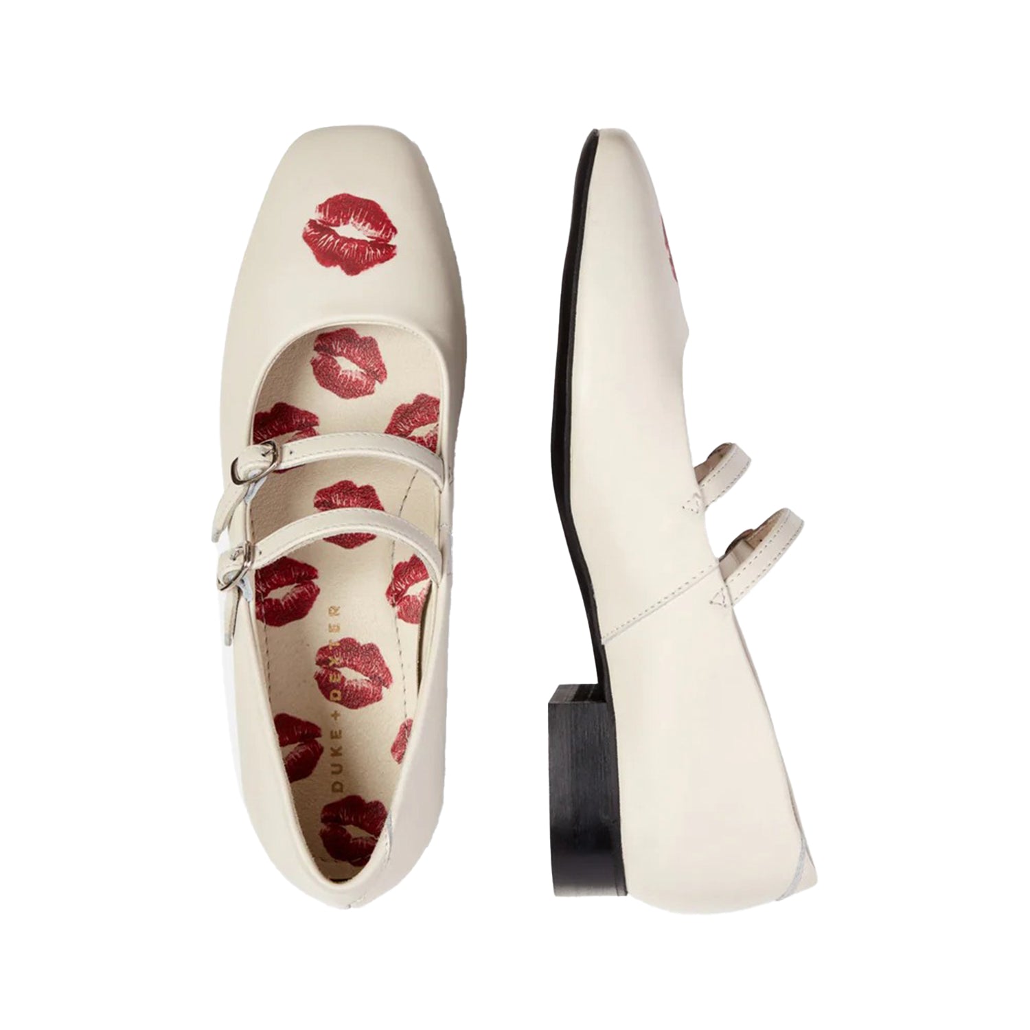 The latest version of our Mary Janes are covered in kisses, hand-drawn, then screen-printed along the insoles and at the toes. Arriving in Ruby + Off-White, they’re handmade from premium leather with a pair of straps across the top.