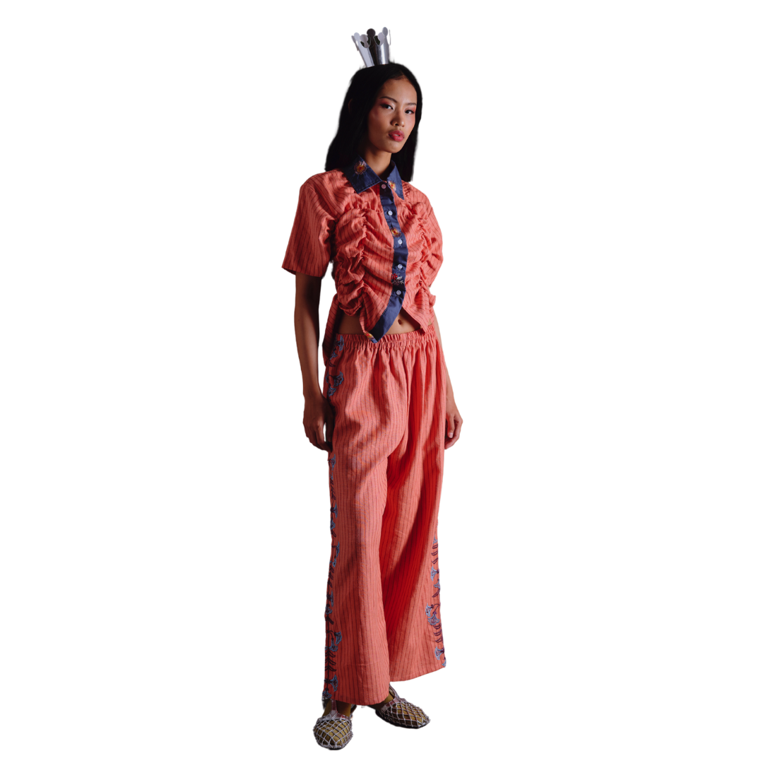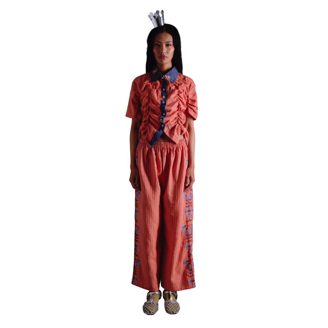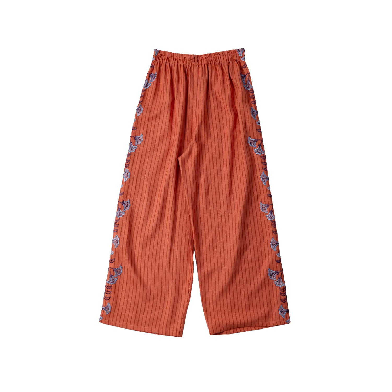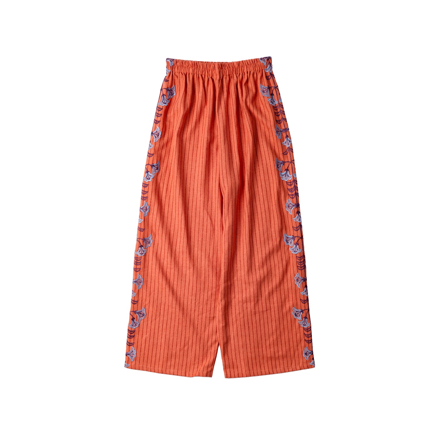 A straight-cut relaxed pants detailed with exclusive embroidery at the sideseam of the pants.