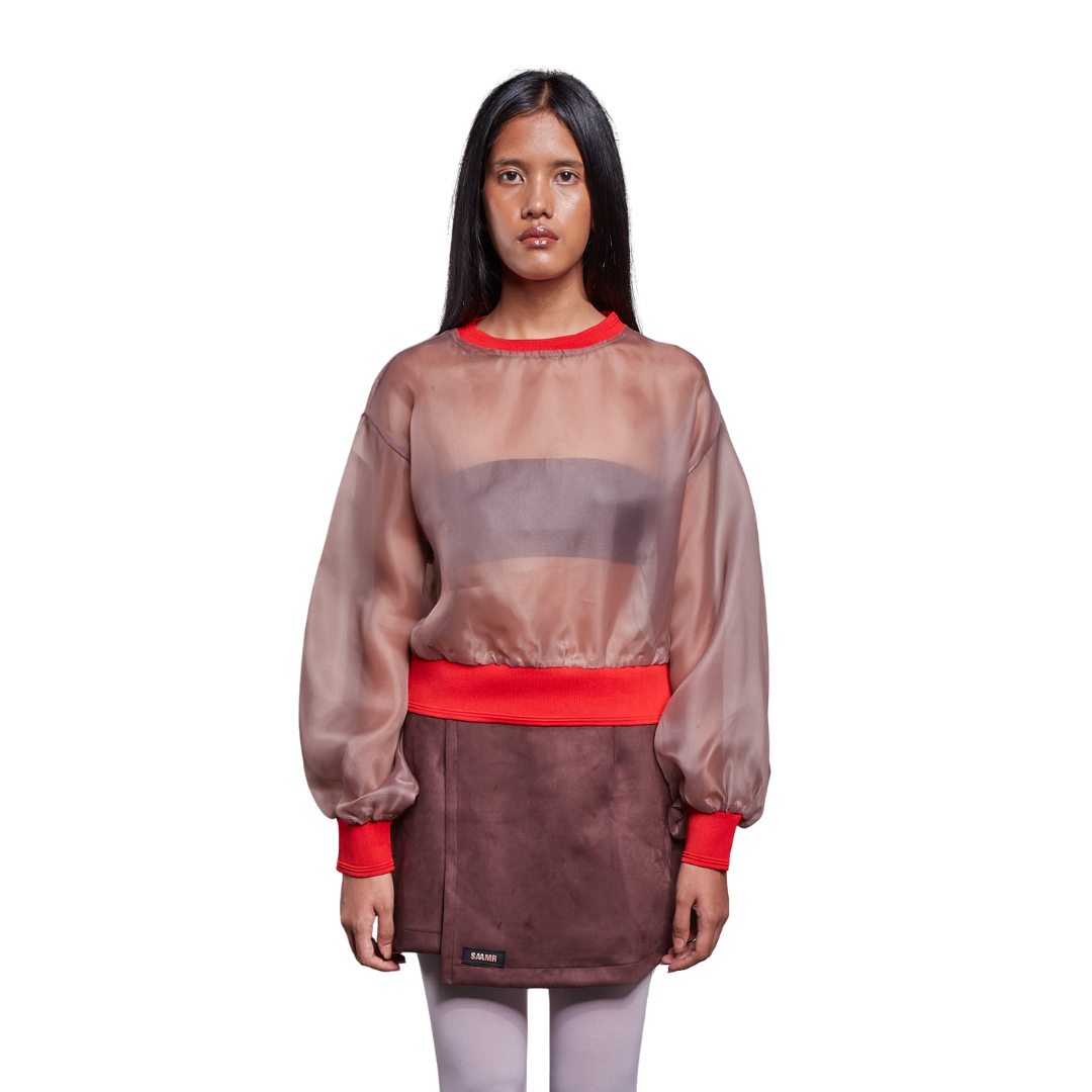 Translucent top crafted from coffee Japanese organza, cinched at the neckline, cuffs, and waist with elastic bands in red