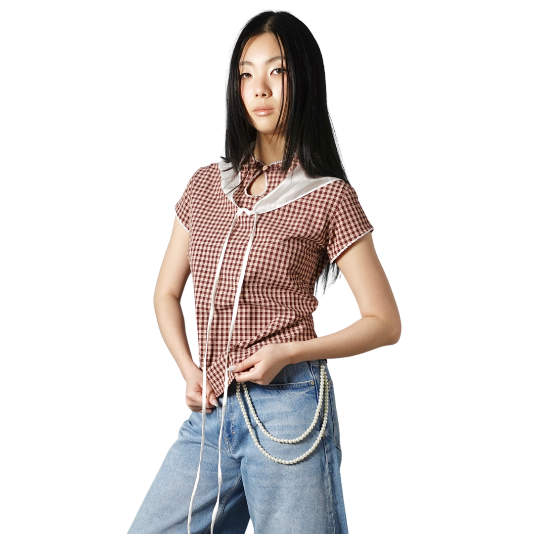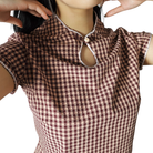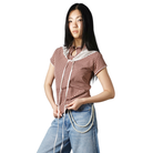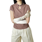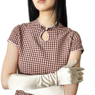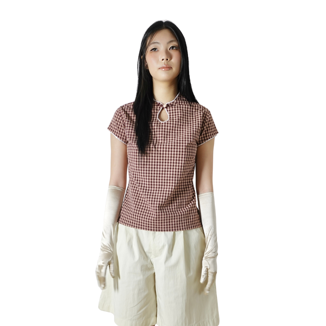 This lightweight fitted top features a modern cheongsam neckline detailing and hand- embellished trimmings and a beaded button ornament on the center front.