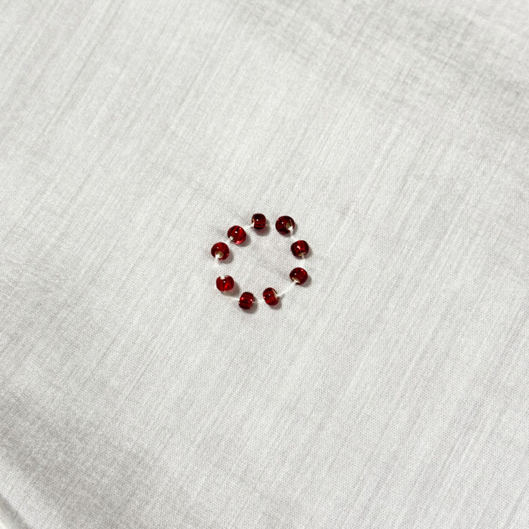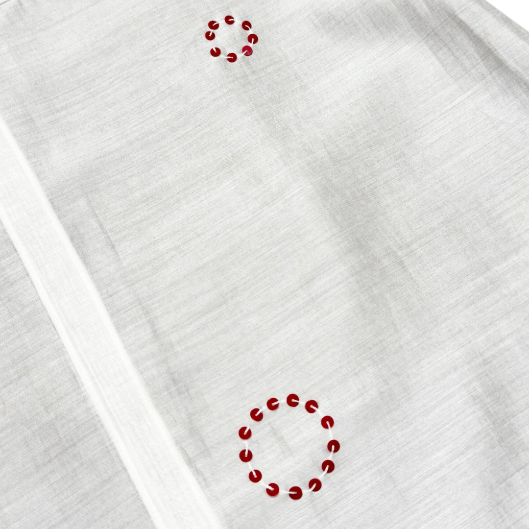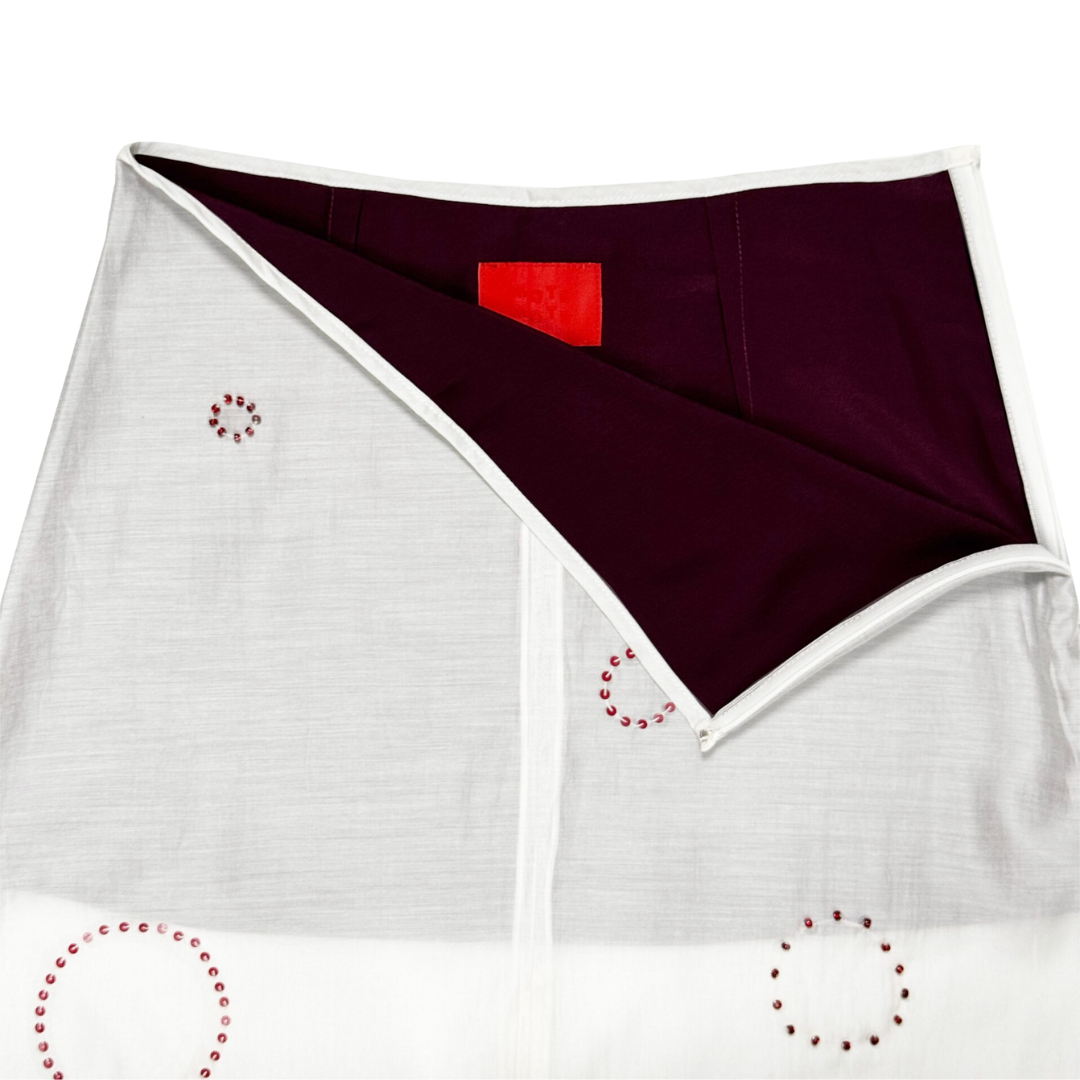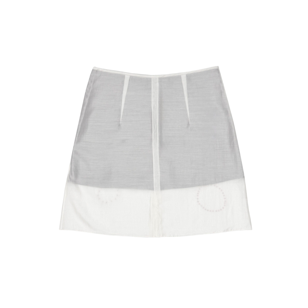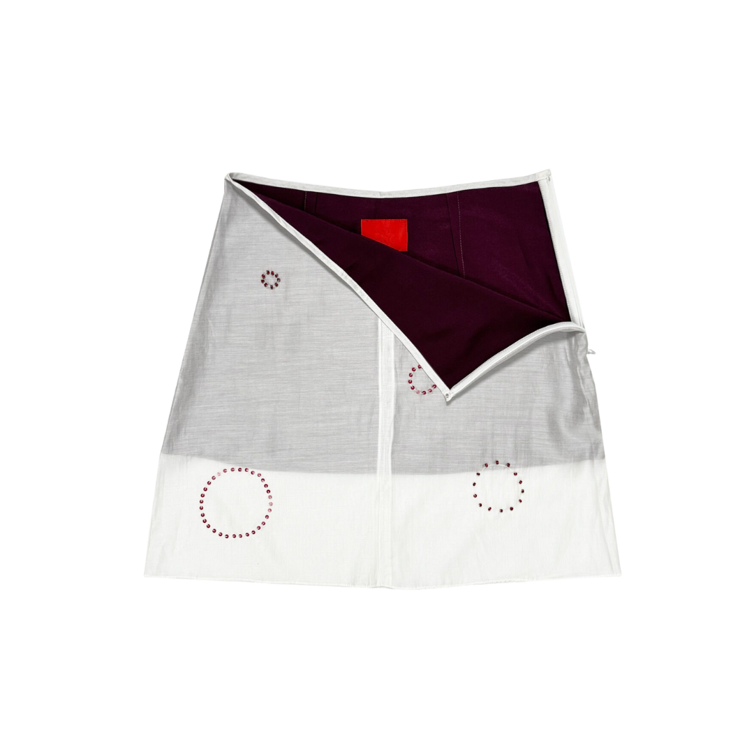 Our new take of mini skirts with two layers of fabrication made from taffeta and sheer overlaying, adorned with minimalist beading details made of glass & plastic beads, finished with side-zip opening.