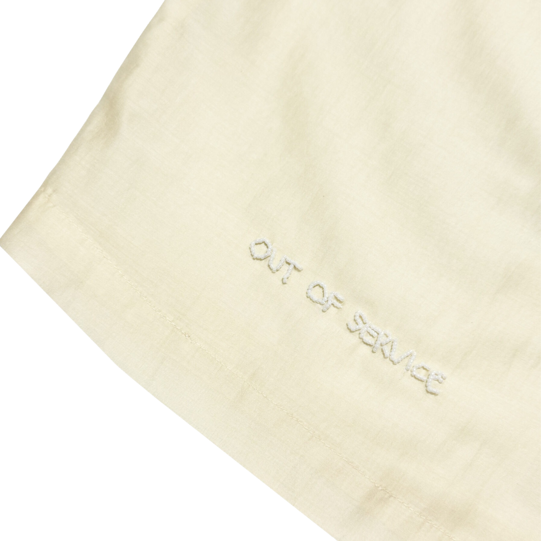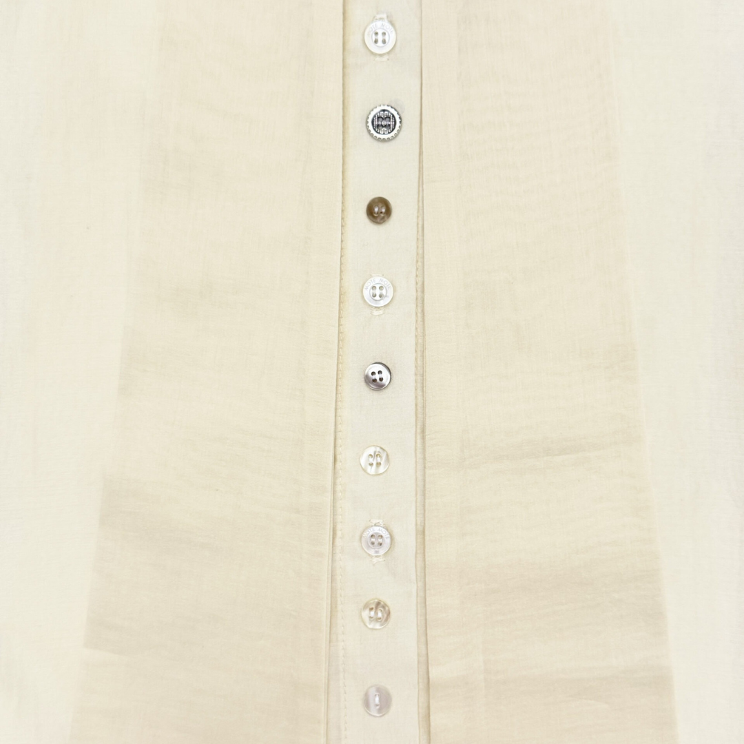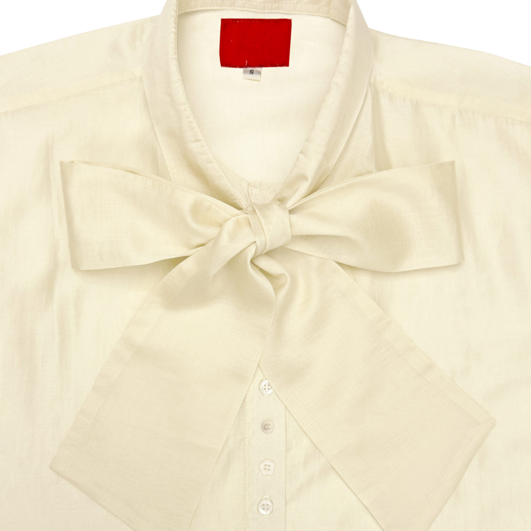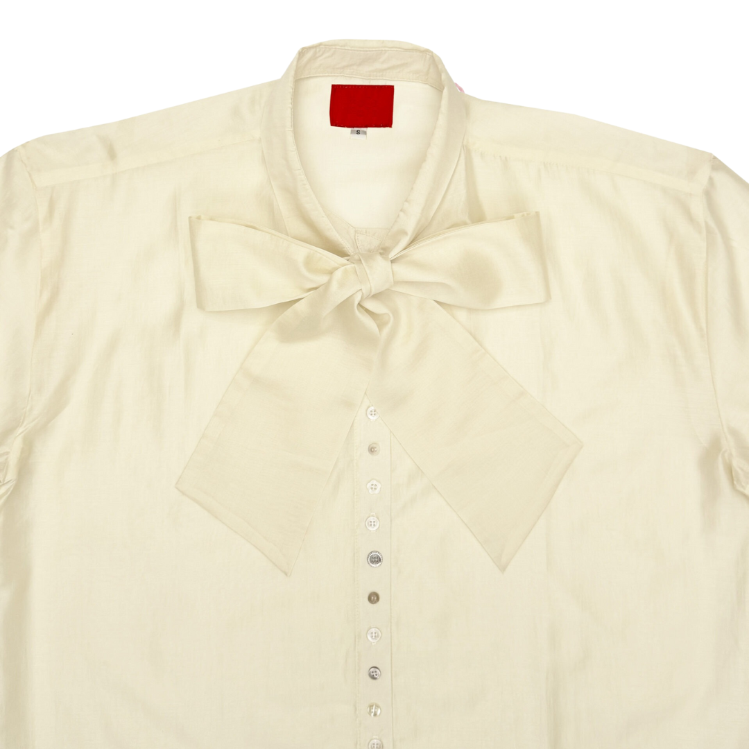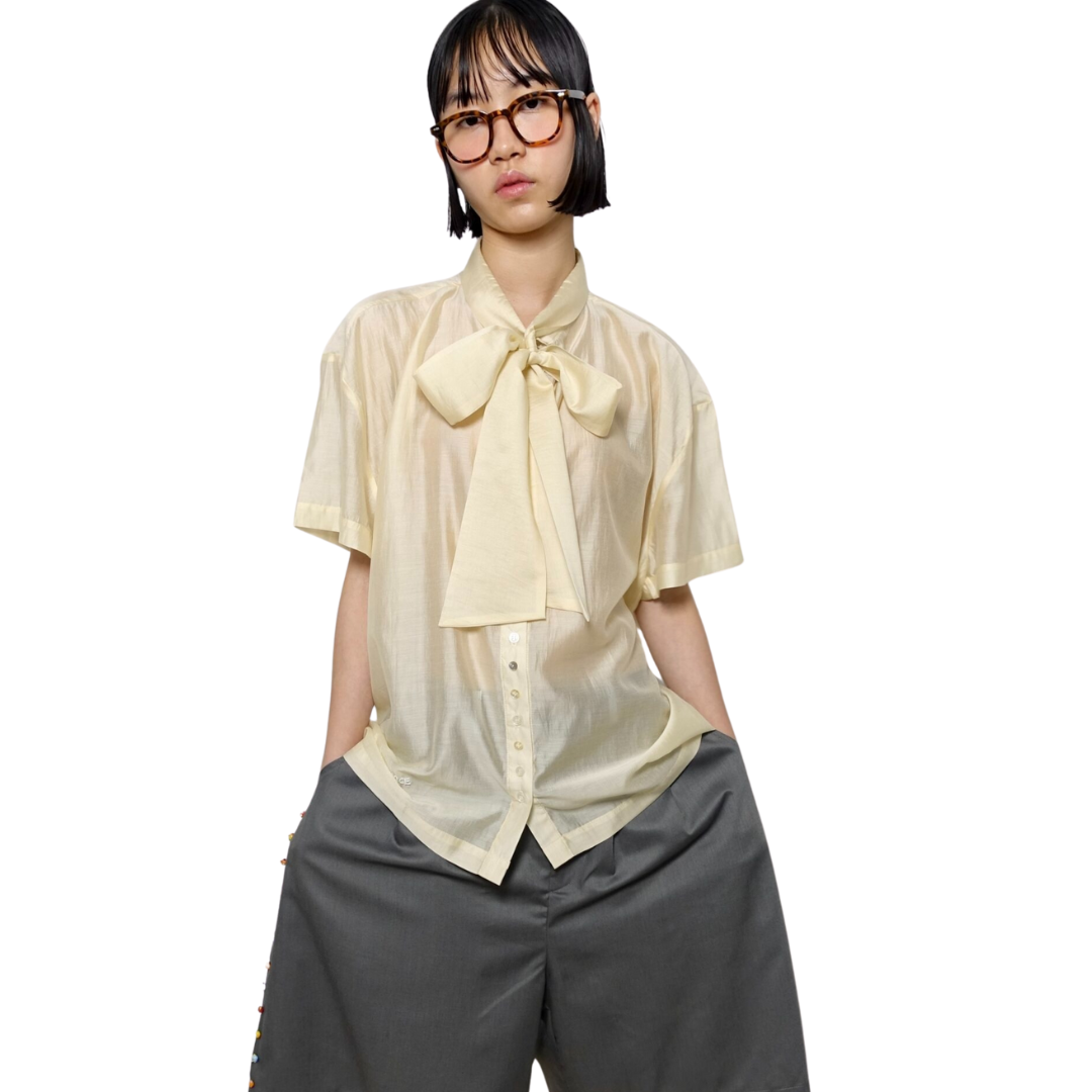 Constructed of poplin fabric, with asymmetric buttoning & bowtie details, made in unisex fitting. Adorned with hand-beaded embellishments on the collar, neatly finished with Mote Mote’s embossed transparent buttons.