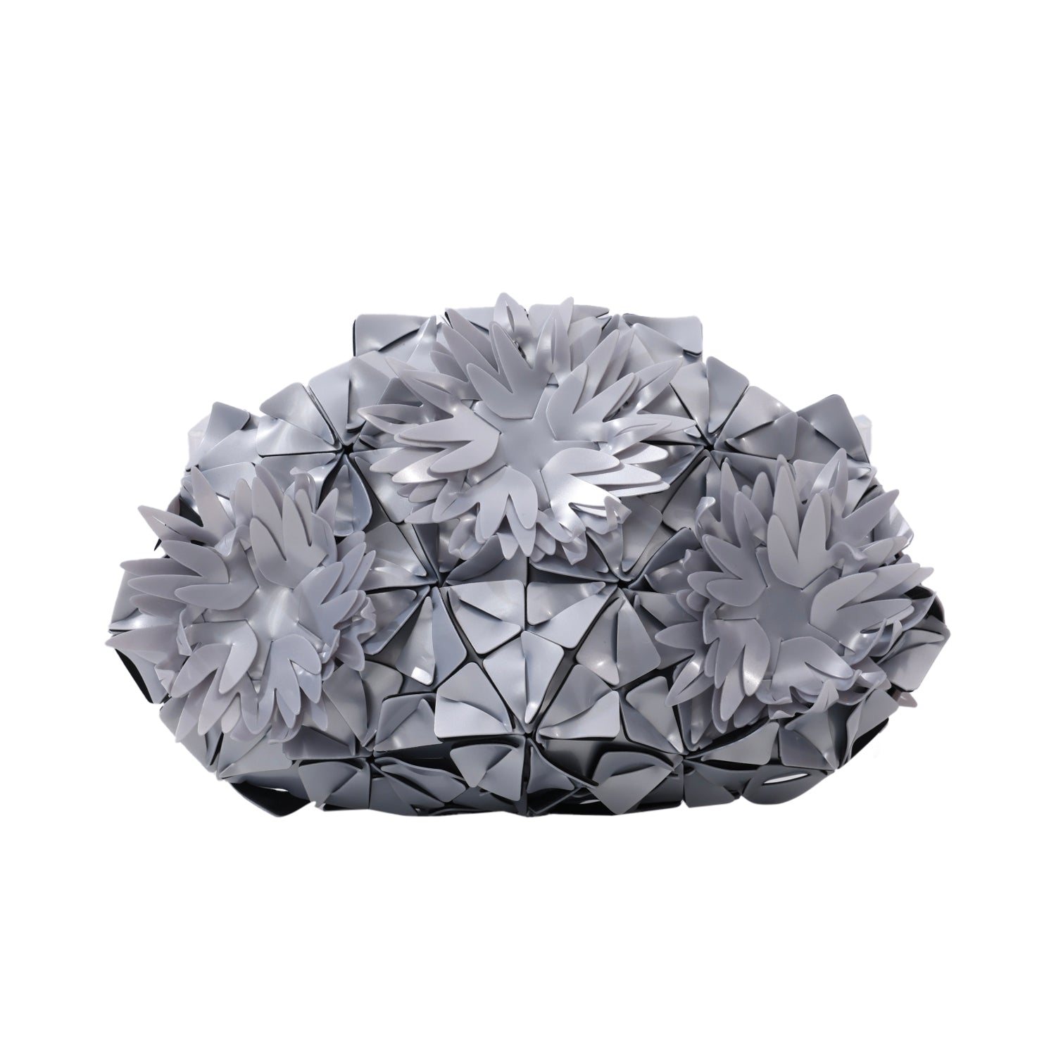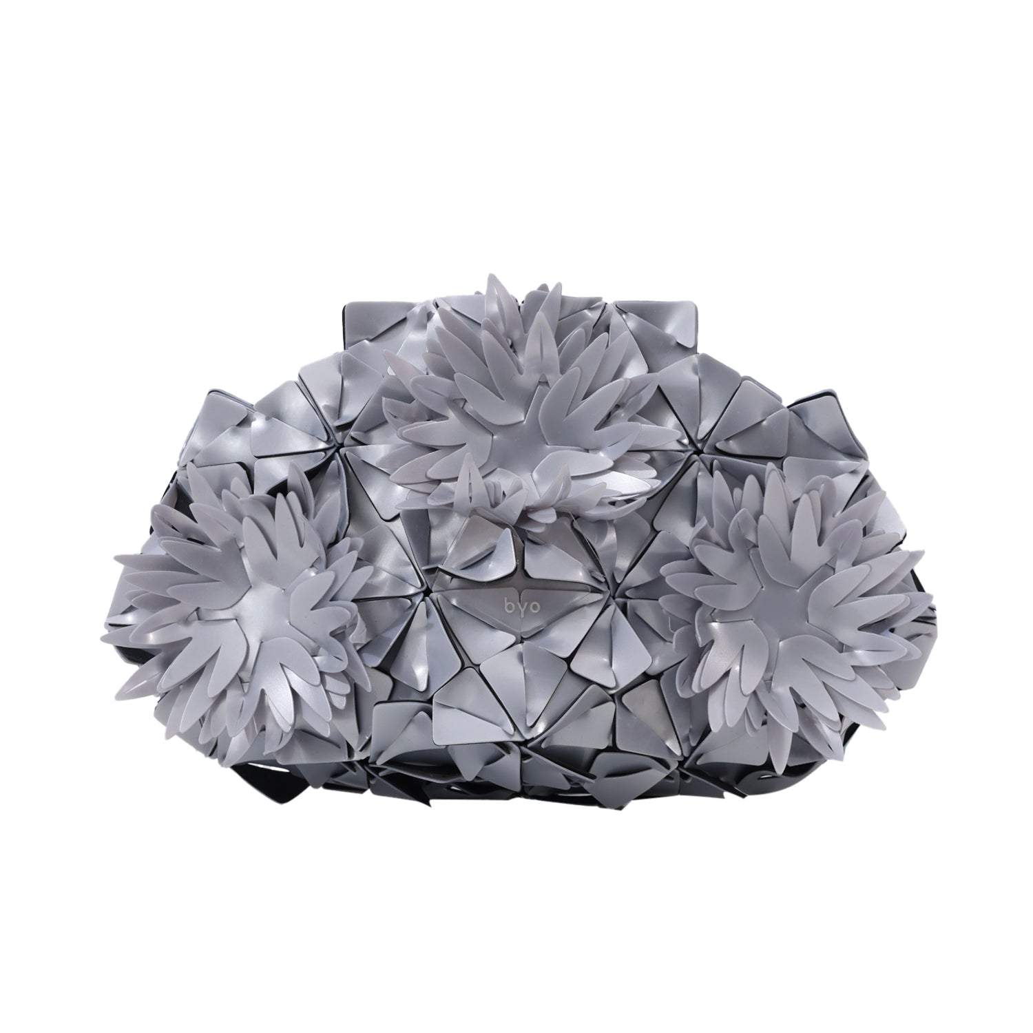 Newest collection of Byo. Inserting 3D modular design inspired by Carnation Flower to Byo's signature clutch. Machine-cut, hand-woven clutch bag with a compact size specifically designed as a party bag. Made from a combination of shiny PVC and latex for a futuristic and avant-garde effect. Can fit smartphones and lipstick. Features a magnetic closure and laser-cut branding details.