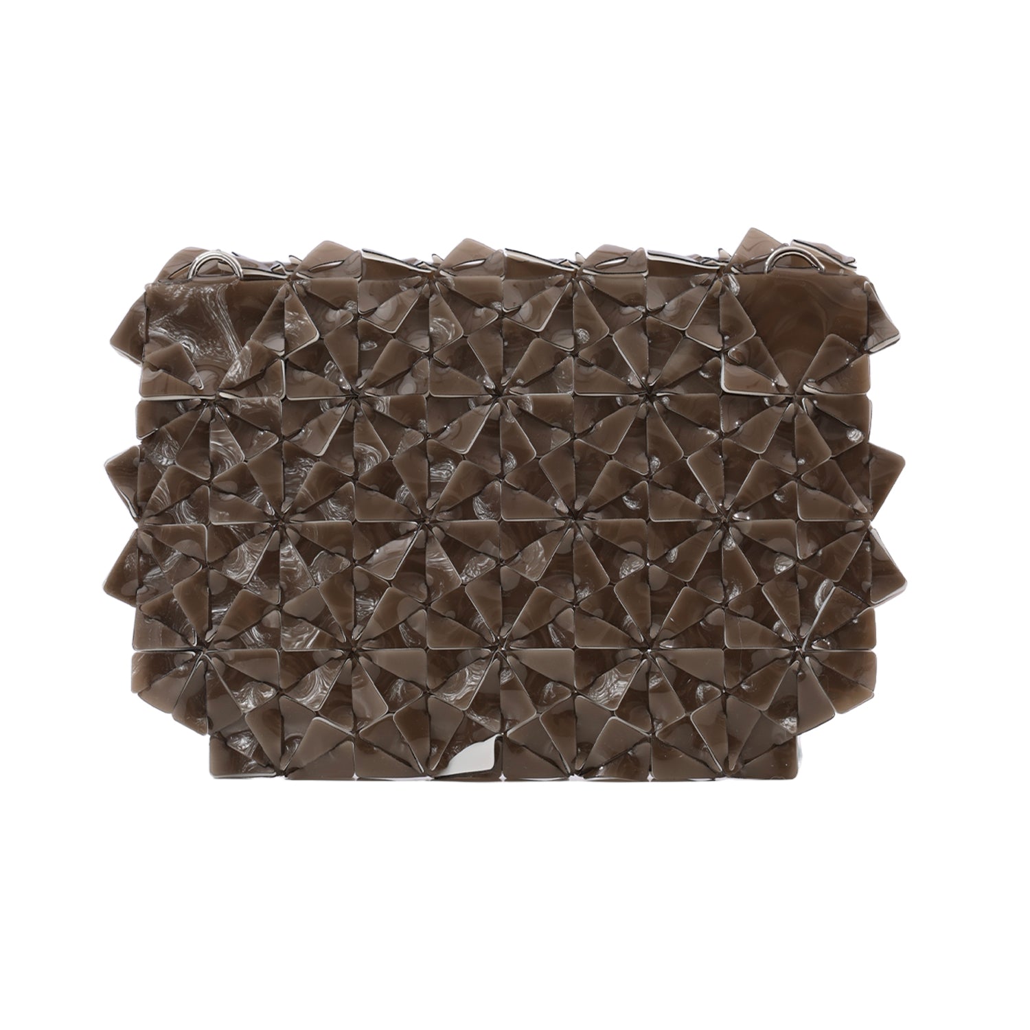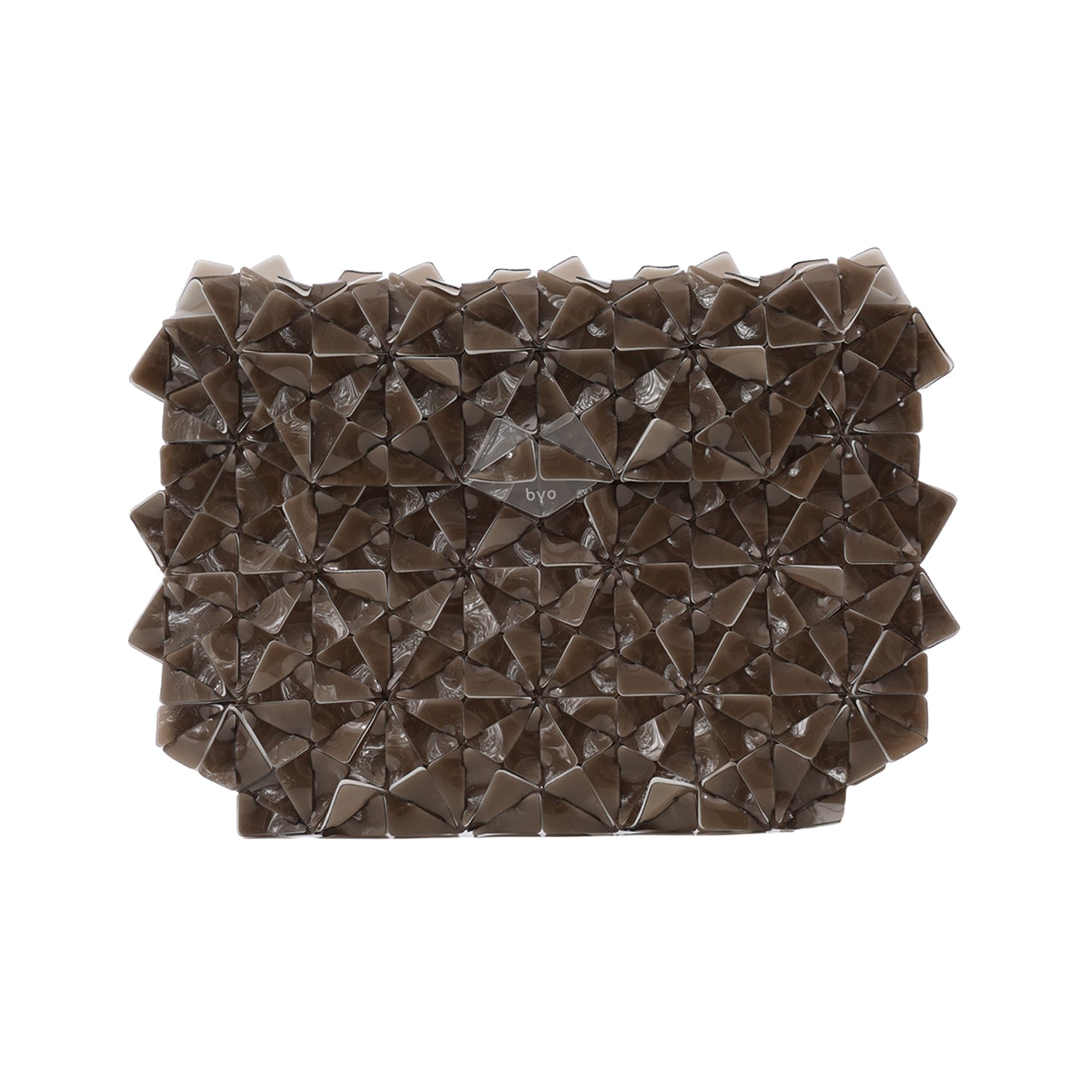 Machine-cut, Hand-woven geometric clutch held together by an interwoven right triangle shape. Soft and comfortable to hold 3D surface texture with rounded corners. Features a magnetic flap and a laser-cut acrylic label. Fits phones, keys, wallet, compact, or any of your everyday objects. D-rings are available for straps.