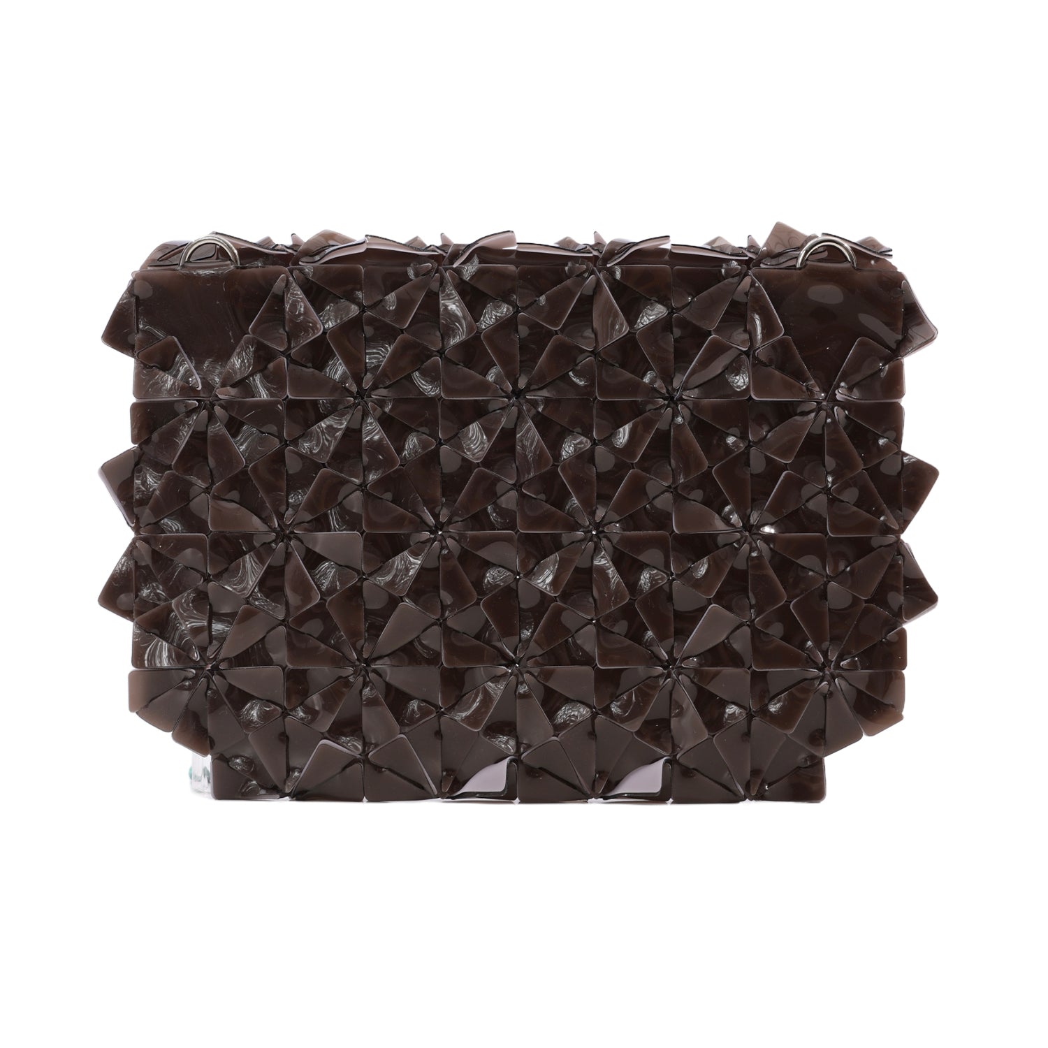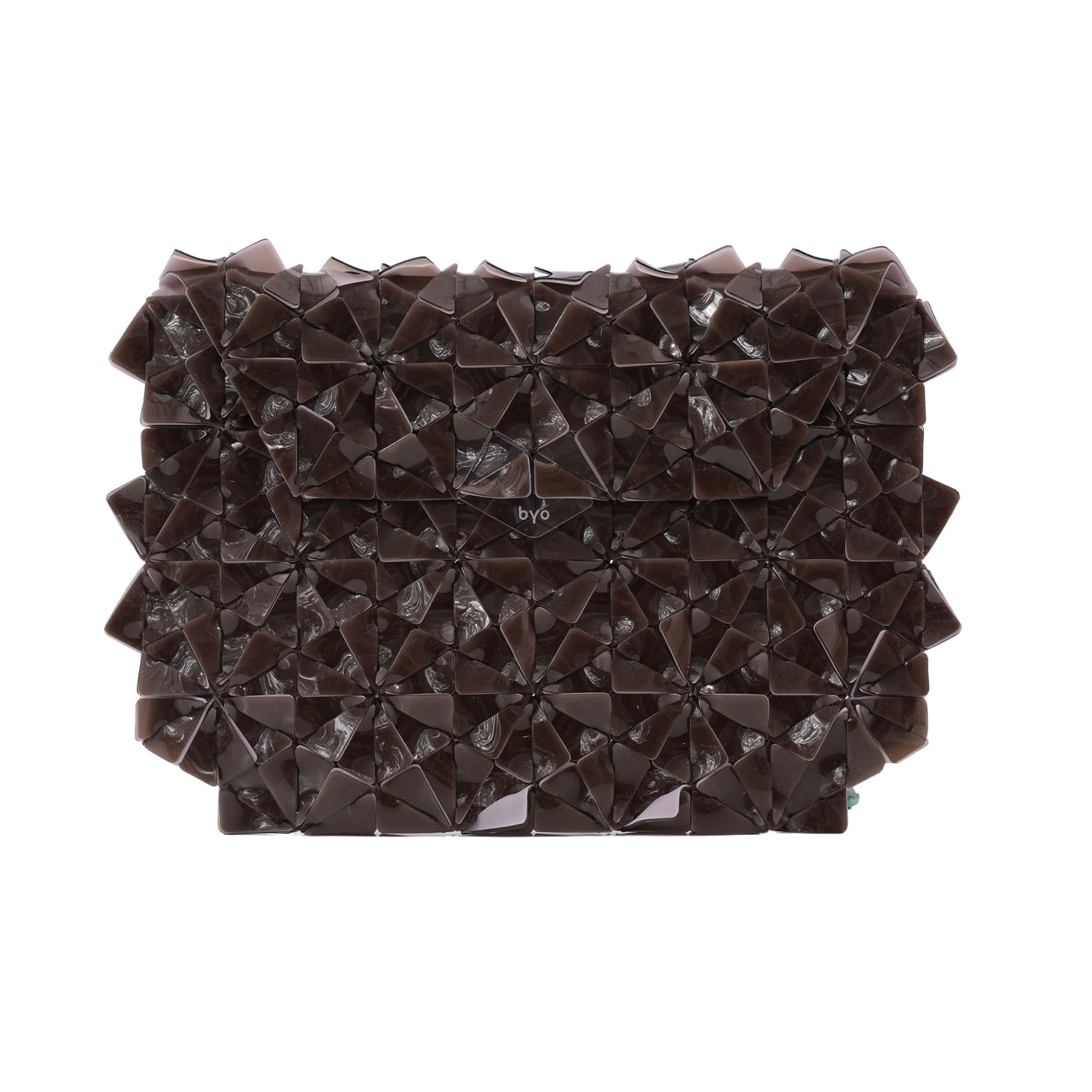 Machine-cut, Hand-woven geometric clutch held together by an interwoven right triangle shape. Soft and comfortable to hold 3D surface texture with rounded corners. Features a magnetic flap and a laser-cut acrylic label. Fits phones, keys, wallet, compact, or any of your everyday objects. D-rings are available for straps.
