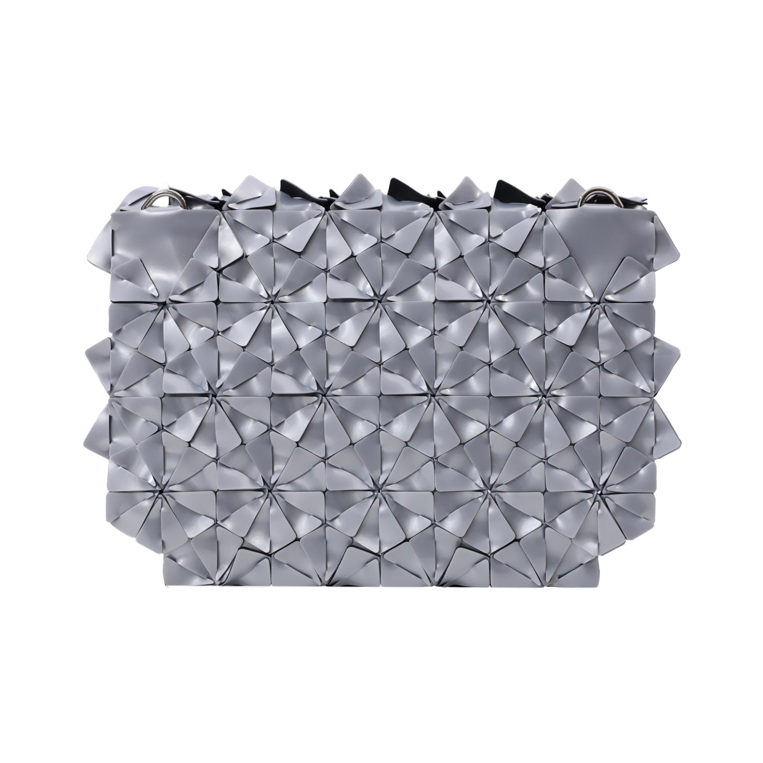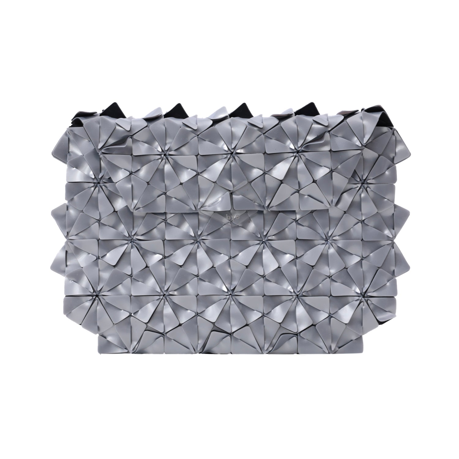 Machine-cut, Hand-woven geometric clutch held together by an interwoven right triangle shape. Soft and comfortable to hold 3D surface texture with rounded corners. Features a magnetic flap and a laser-cut acrylic label. Fits phones, keys, wallet, compact, or any of your everyday objects. D-rings are available for straps.