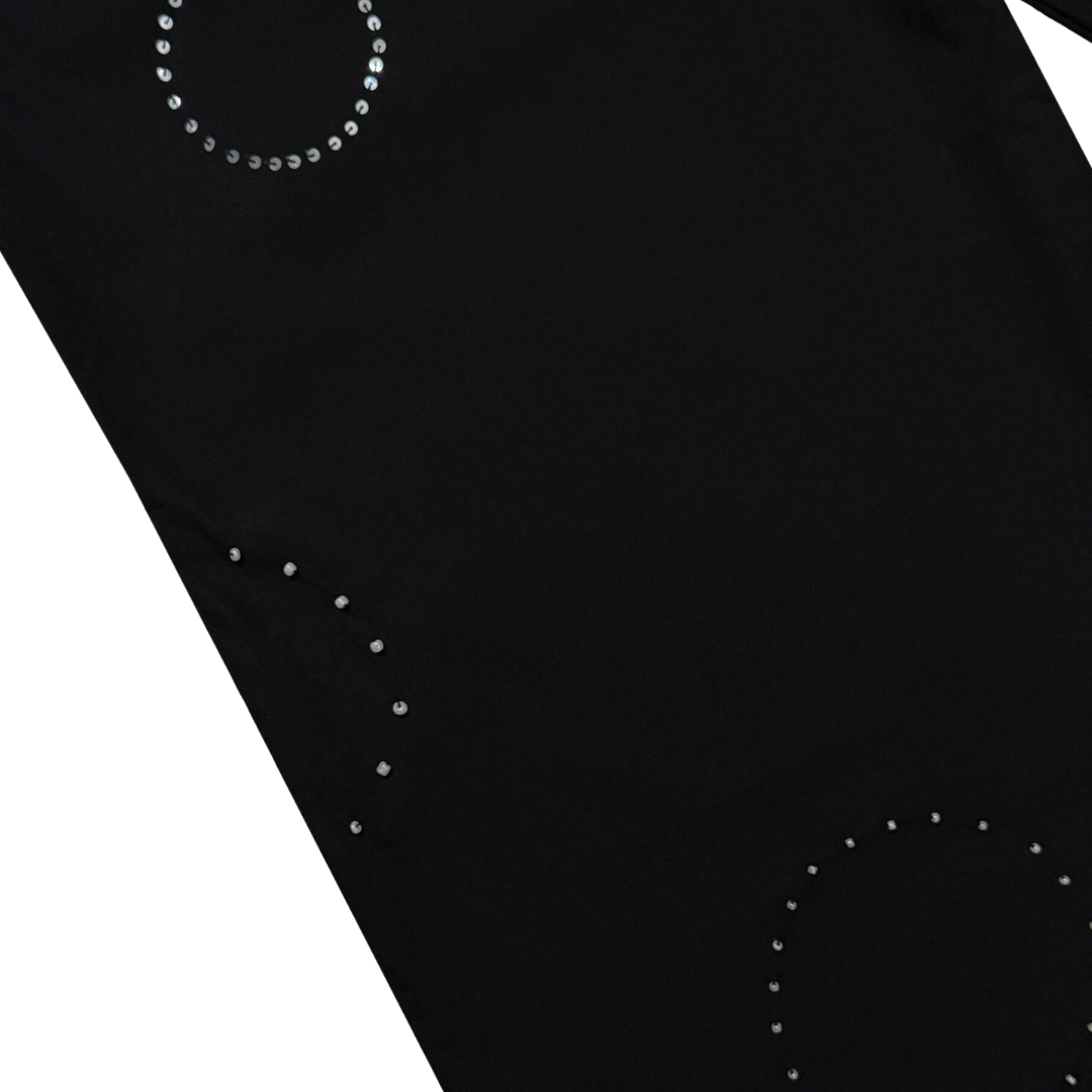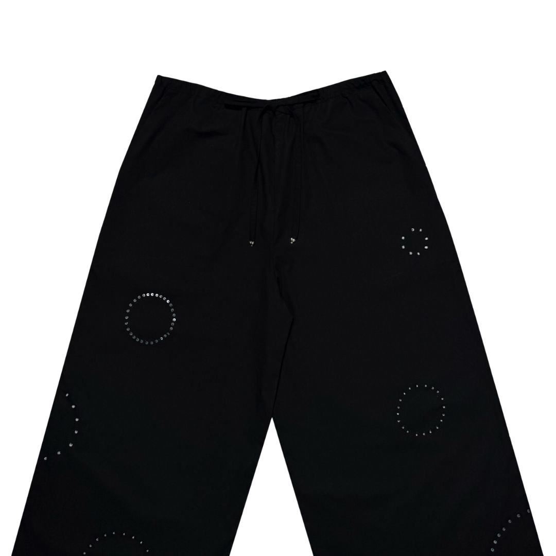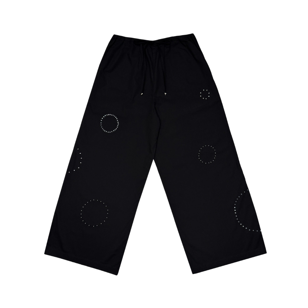 Loose-cut pants with double front & back pockets, finished with an adjustable waistband and drawstring for comfort, made in unisex fitting. Adorned with our signature embellishments and beaded trimming.