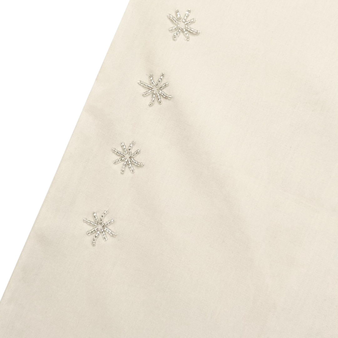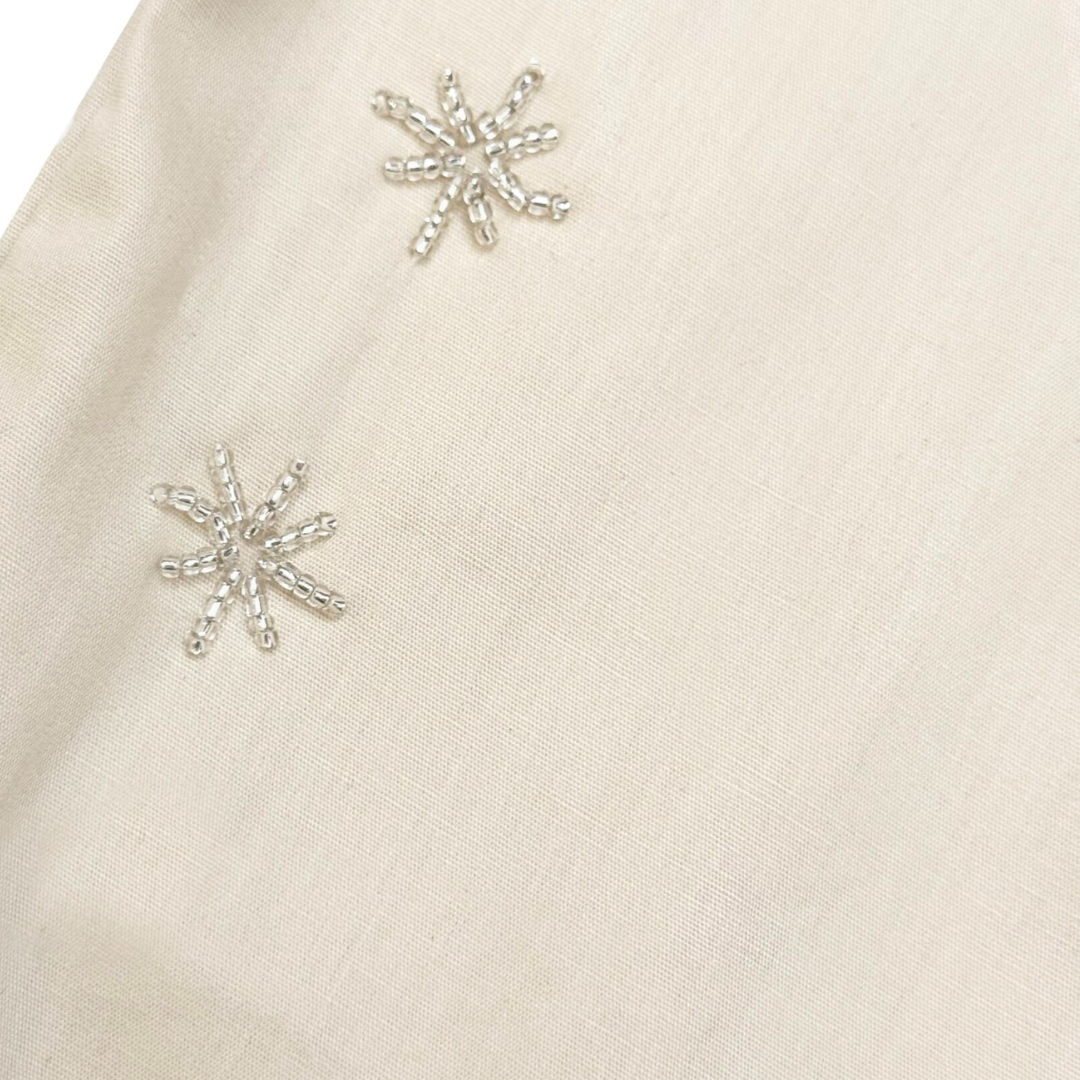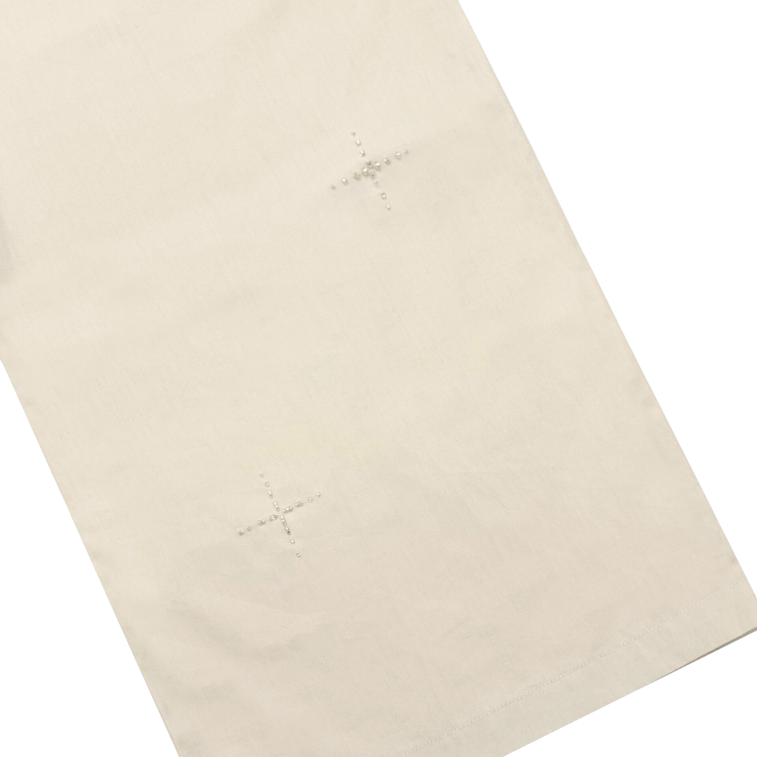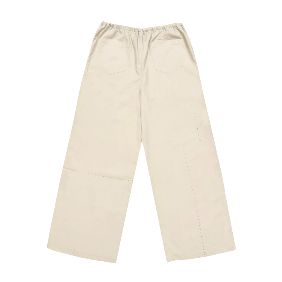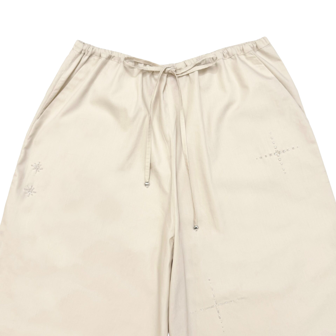 Loose-cut pants with double front & back pockets, finished with an adjustable waistband and drawstring for comfort, made in unisex fitting. Adorned with our signature embellishments and beaded trimming