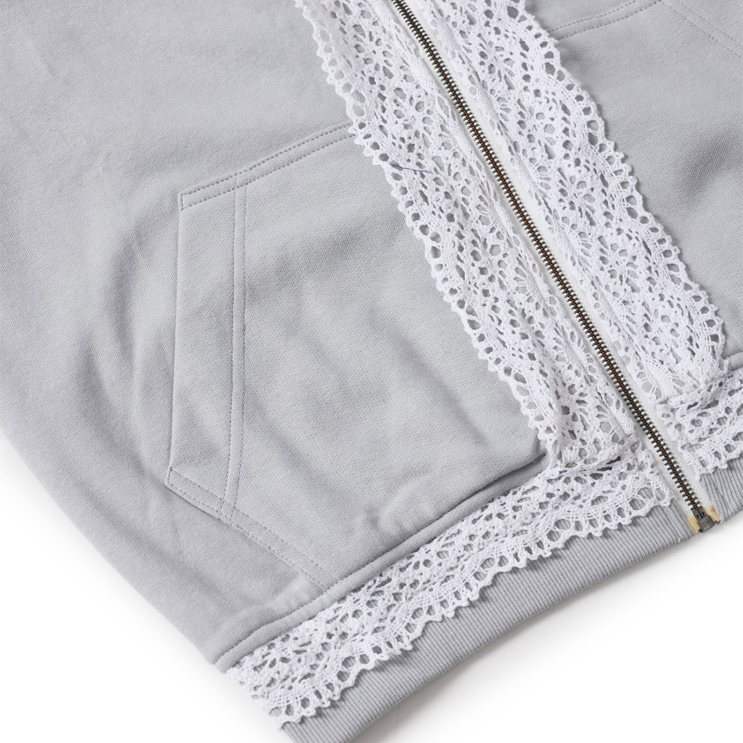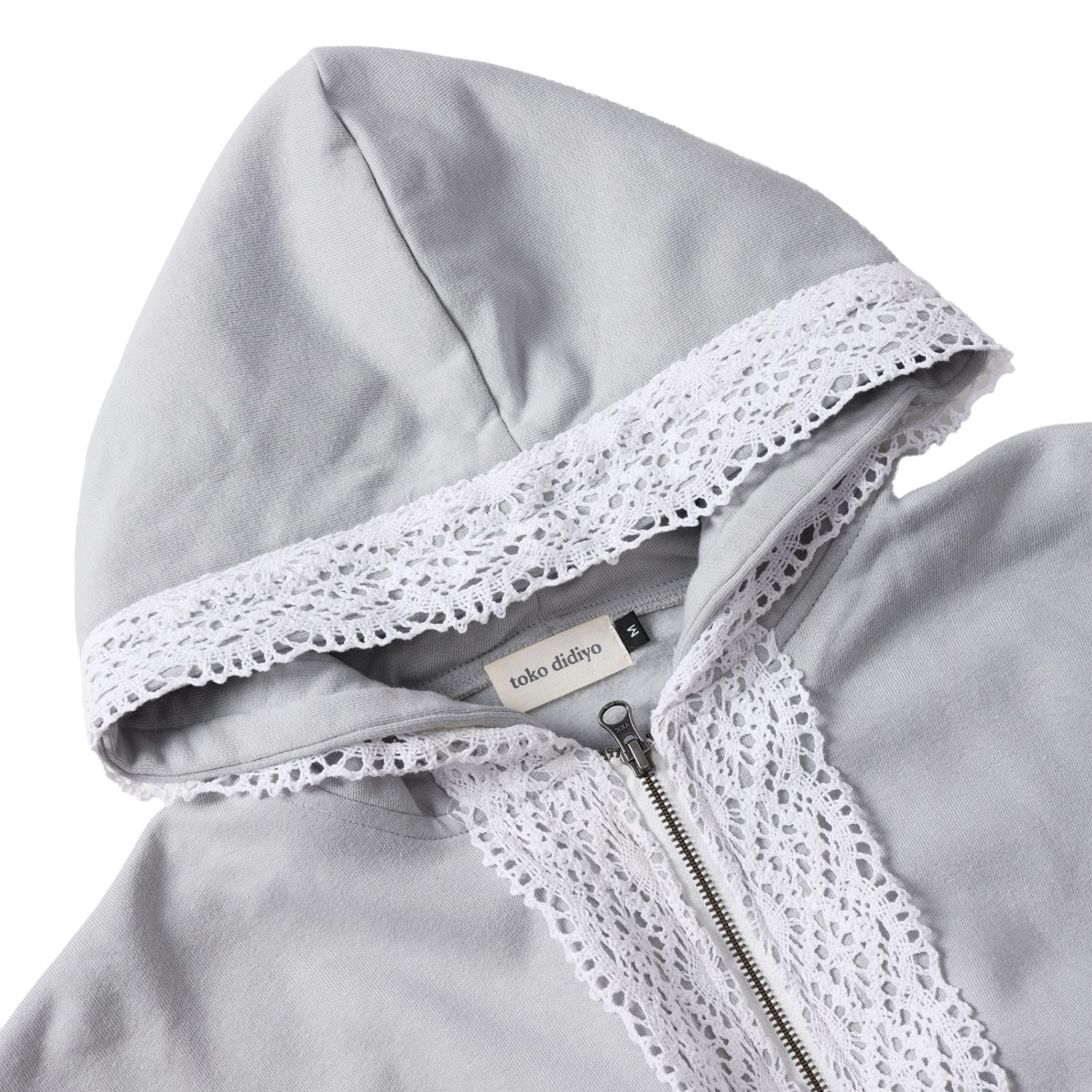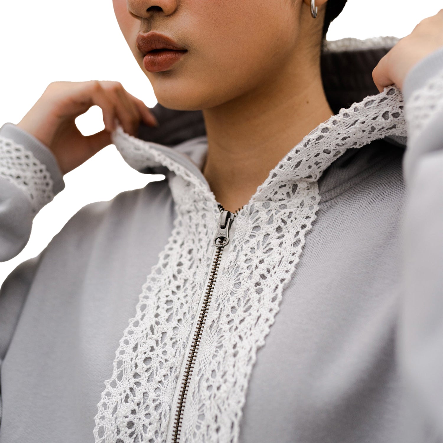 A zip up hoodie made from cotton, featuring a front lace detail along the zip-line