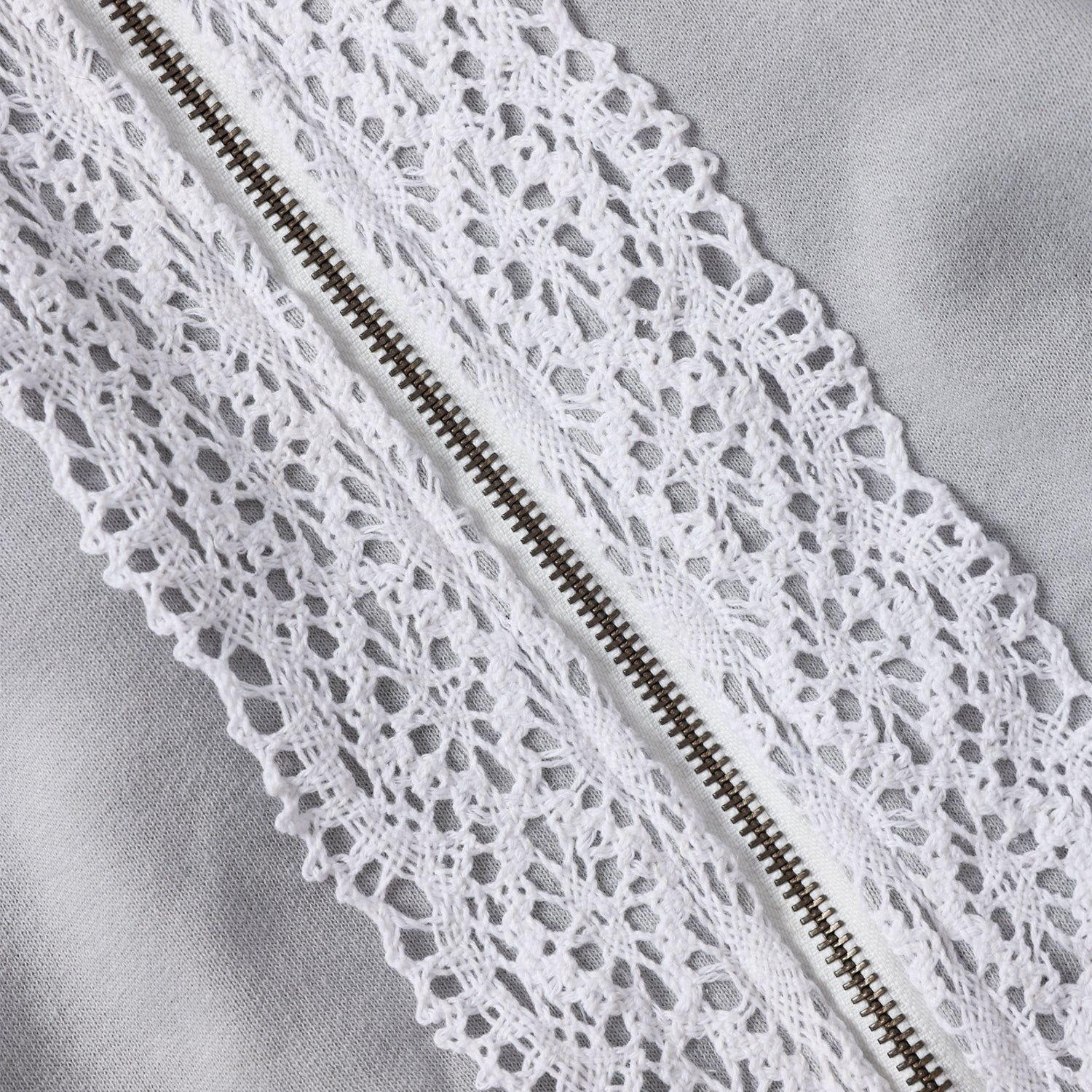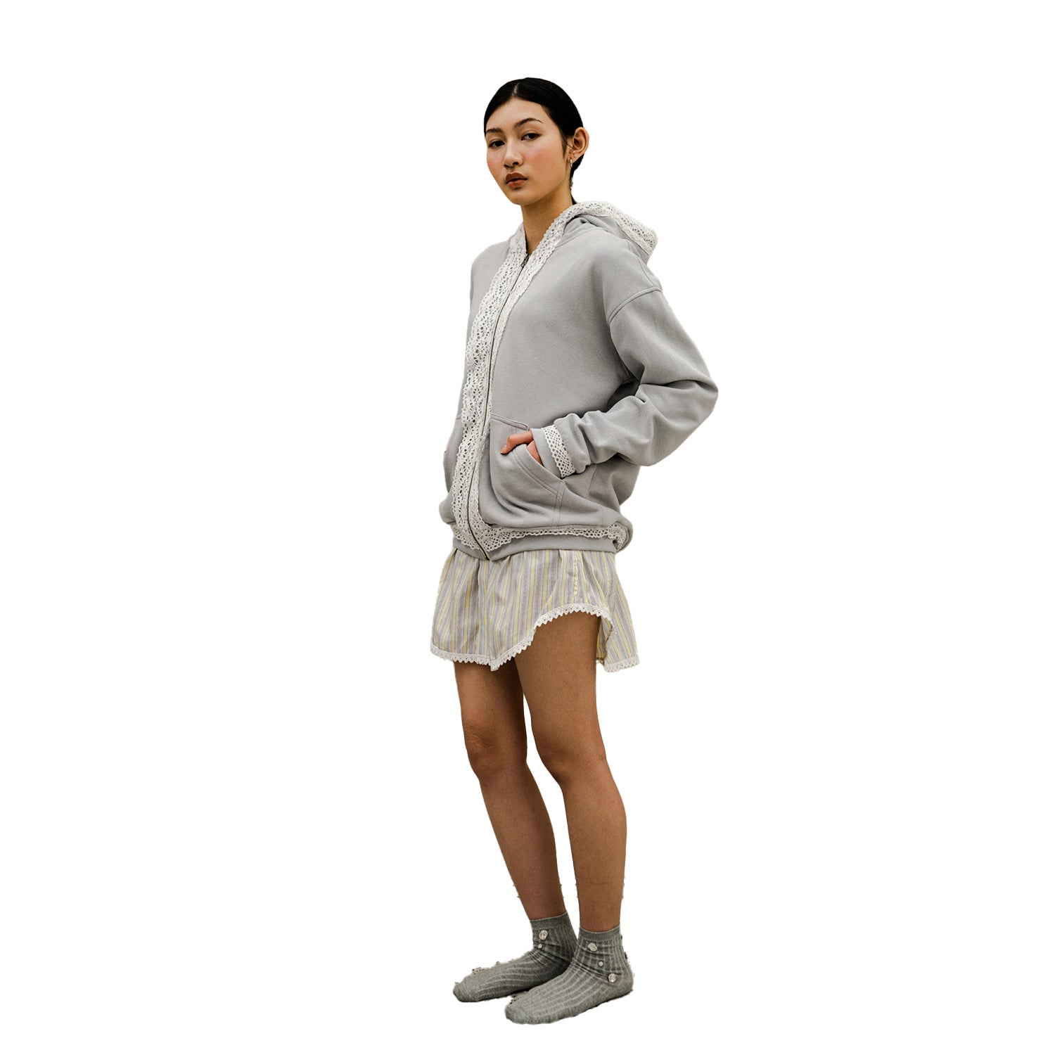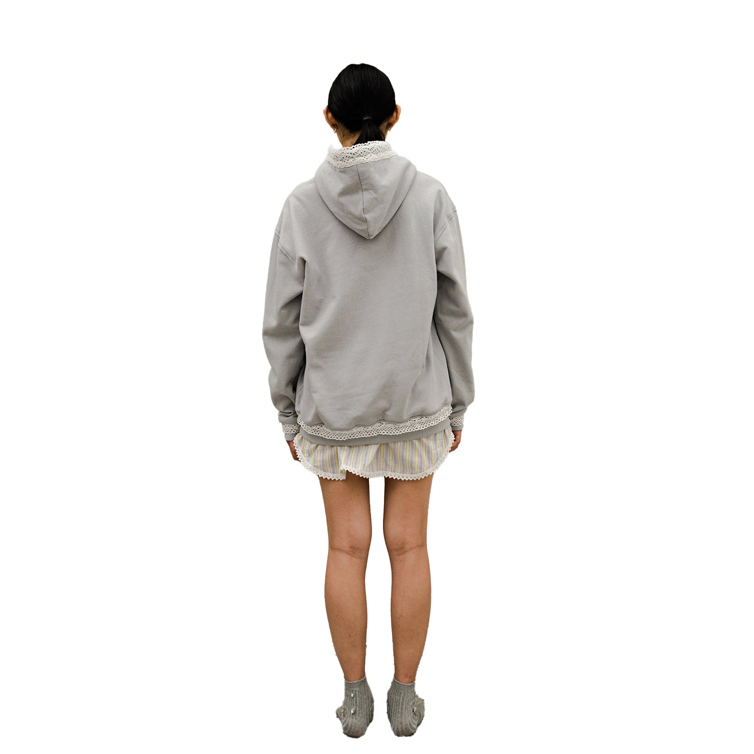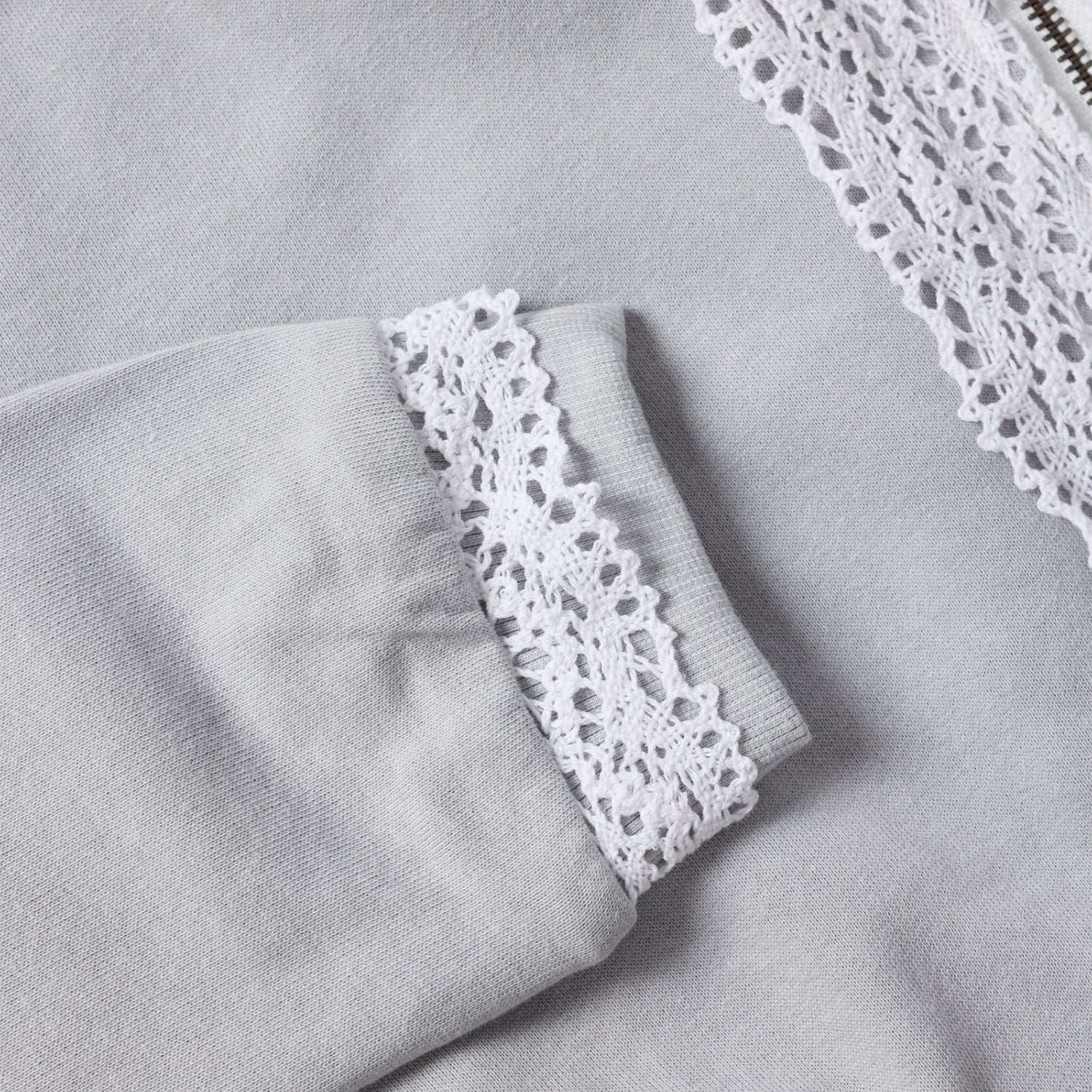 A zip up hoodie made from cotton, featuring a front lace detail along the zip-line