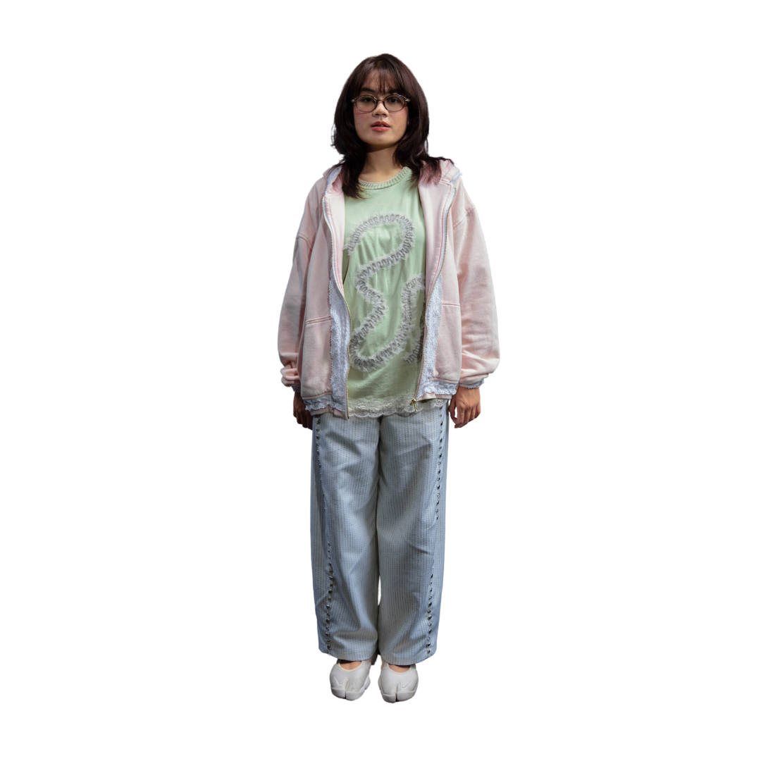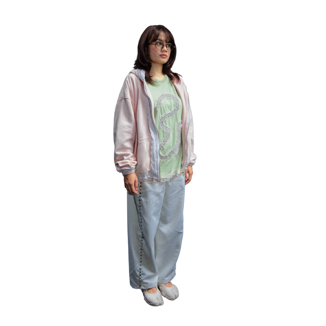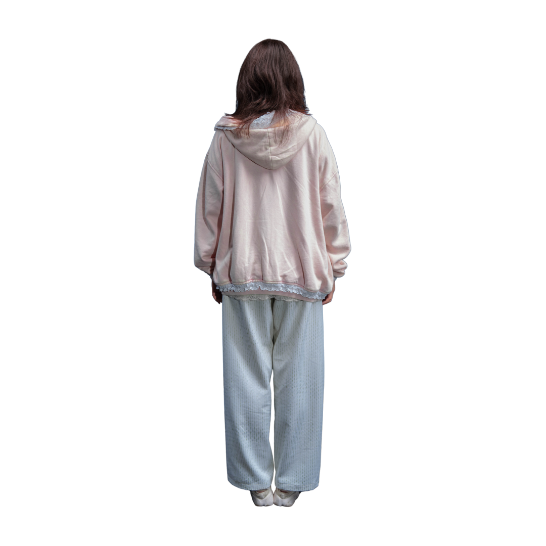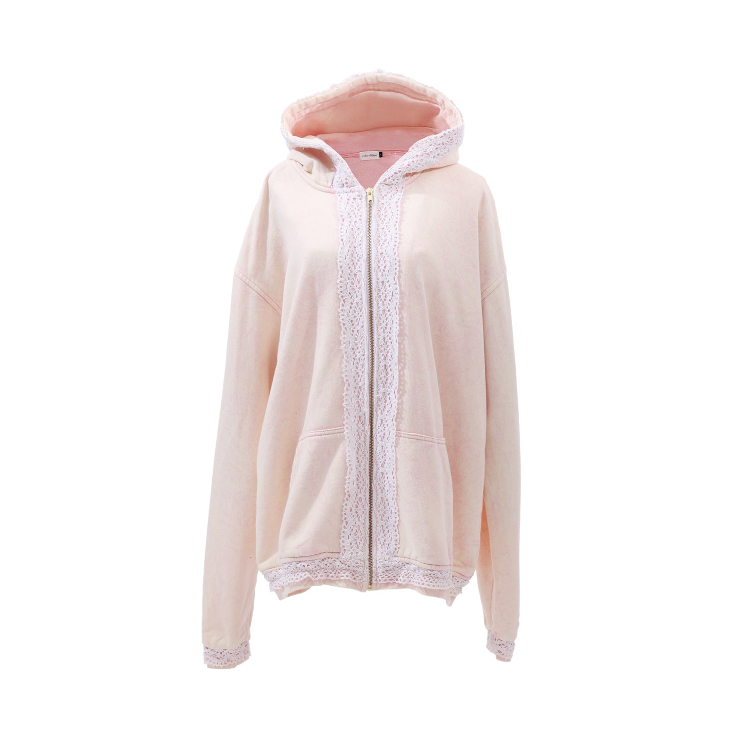 A zip up hoodie made from cotton, featuring a front lace detail along the zip-line