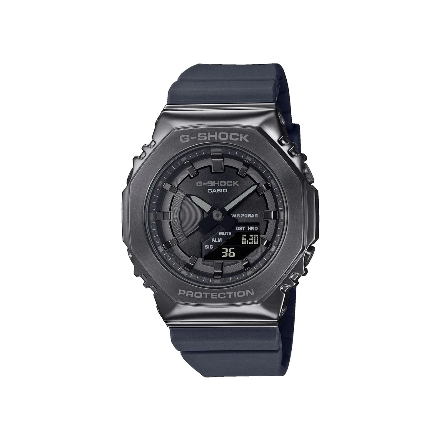 Go slim, clean and bold with a mid-sized G-SHOCK in a metal-clad octagonal take on the original iconic design. Forged in stainless steel with rounded hairline finish, the strong bezel says super style all the way. Only the lettering at the top and bottom are engraved, for a simple, one-piece design. The dial, flattened for slimness, is treated with ion plating color and mirrored indexes to add shimmery depth.
