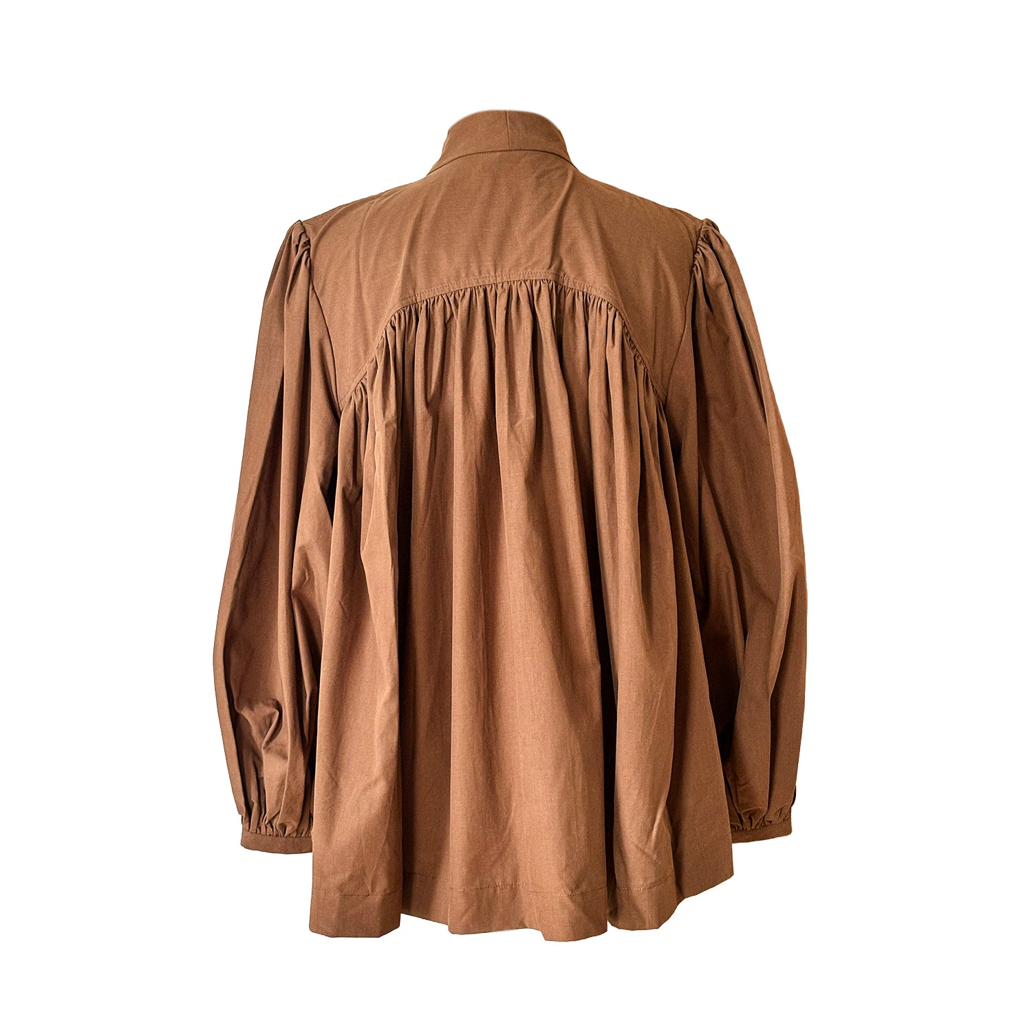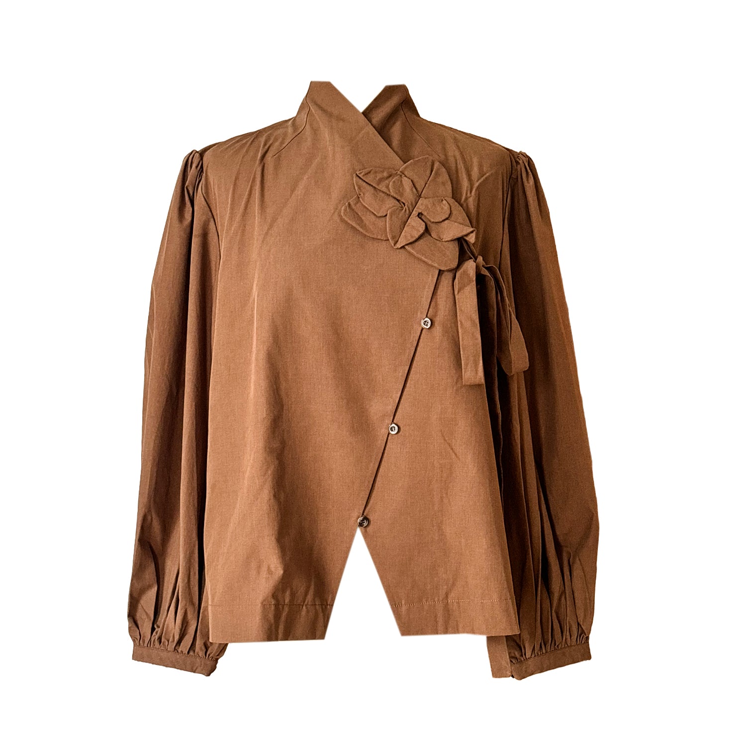 Inspired by the hanbok, Hana features an asymmetric front opening with a side bow detail. Puff sleeves and a gathered back yoke create volume reminiscent of traditional hanbok silhouettes. Crafted from natural fiber fabrics and finished with OHMA’s signature orchid embellishment.