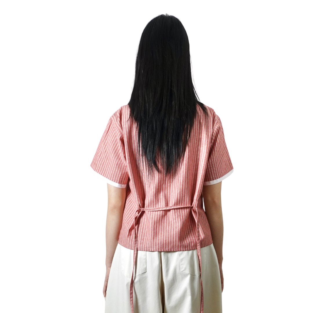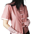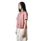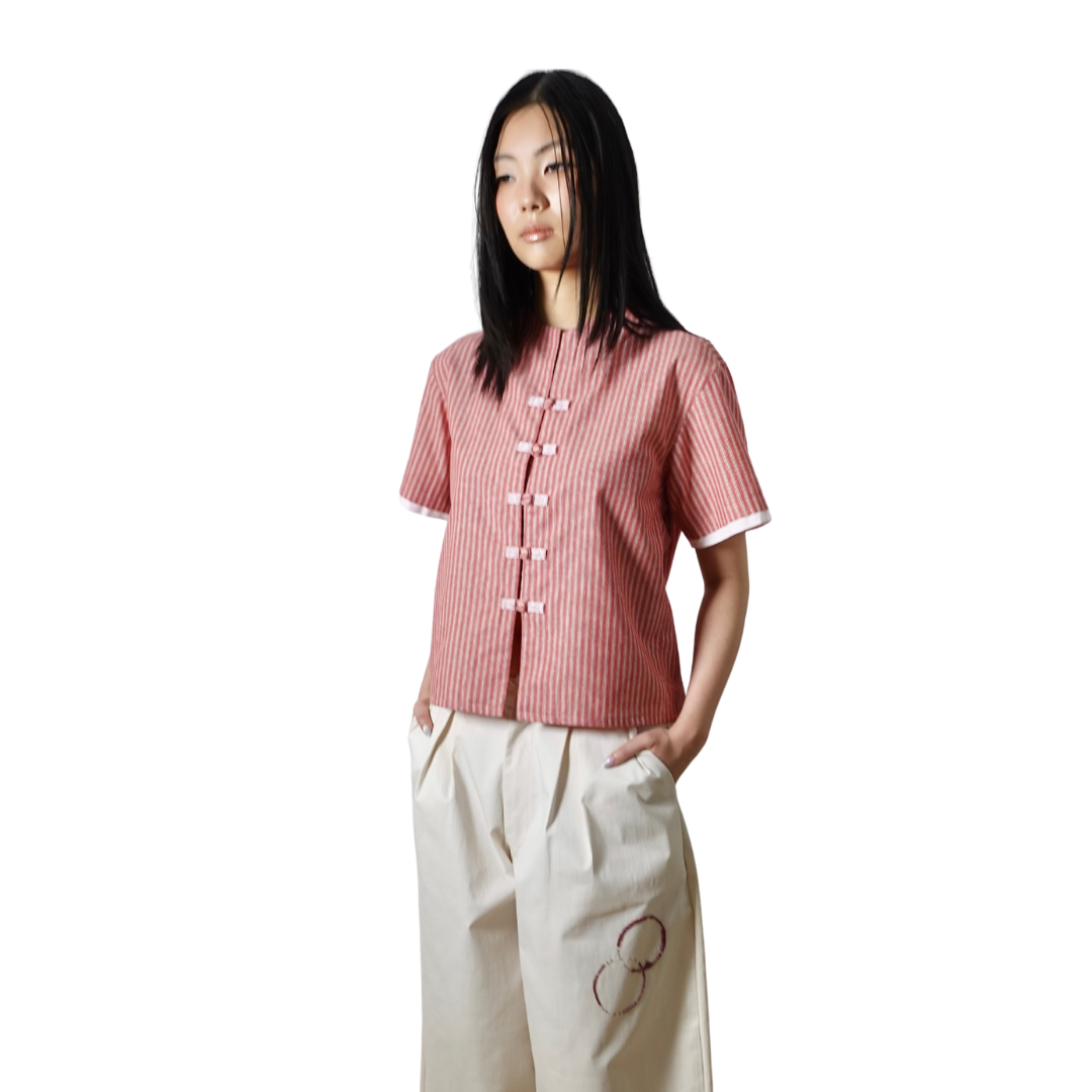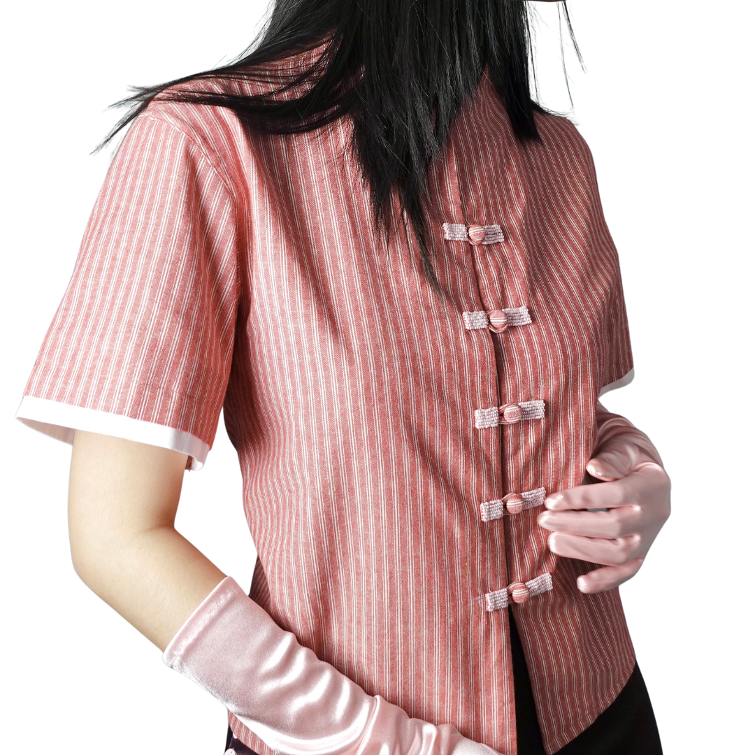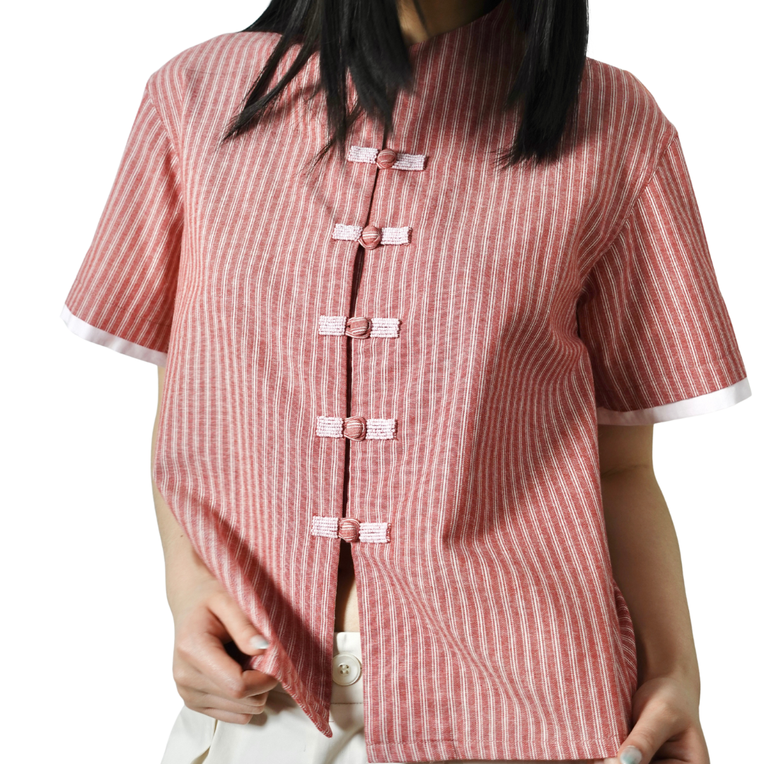 A cropped Boxy-cut shirt featuring reimagined Chinese hand-fastened knot buttoning details with beads decorations on the front, finished with adjustable waist strap for comfort.