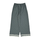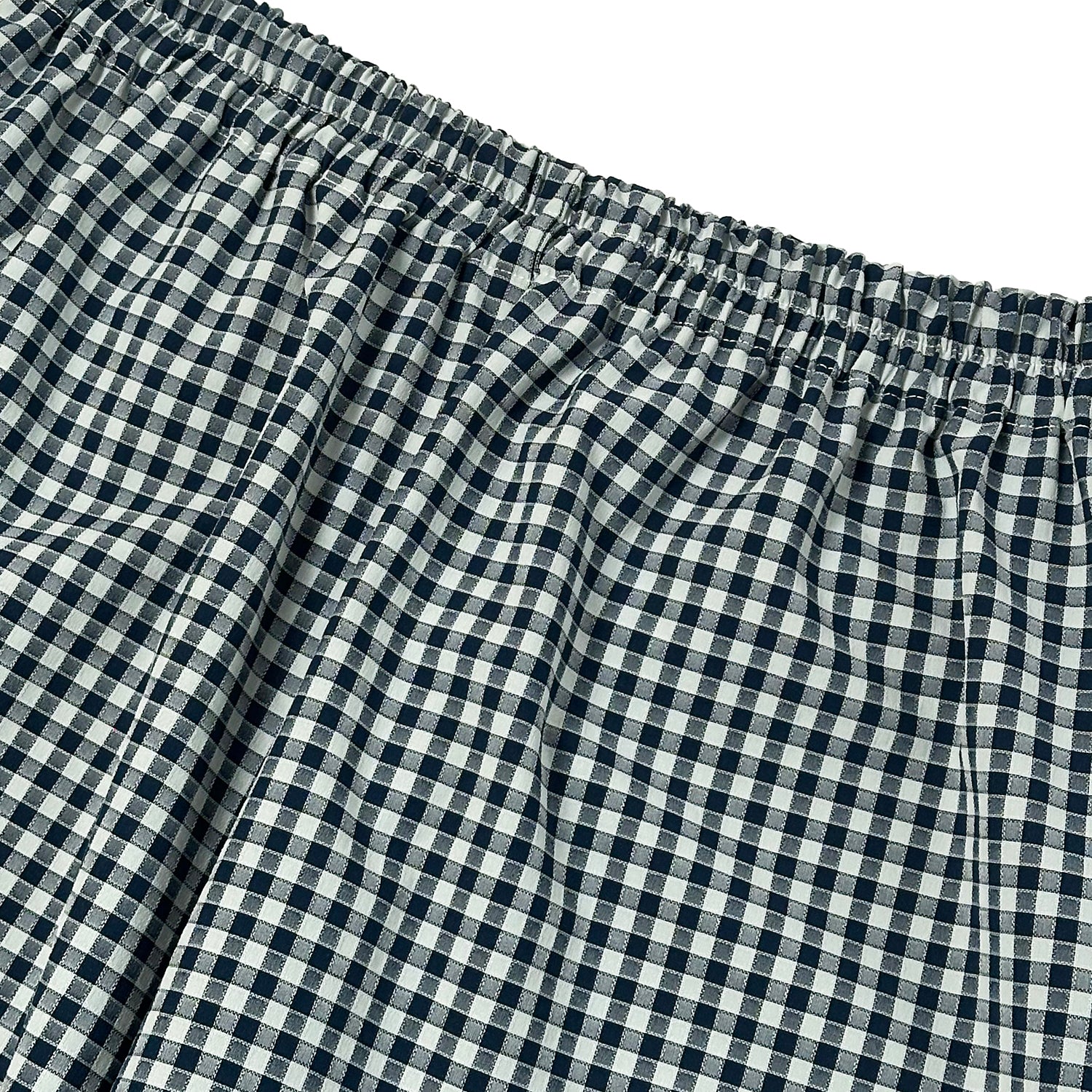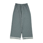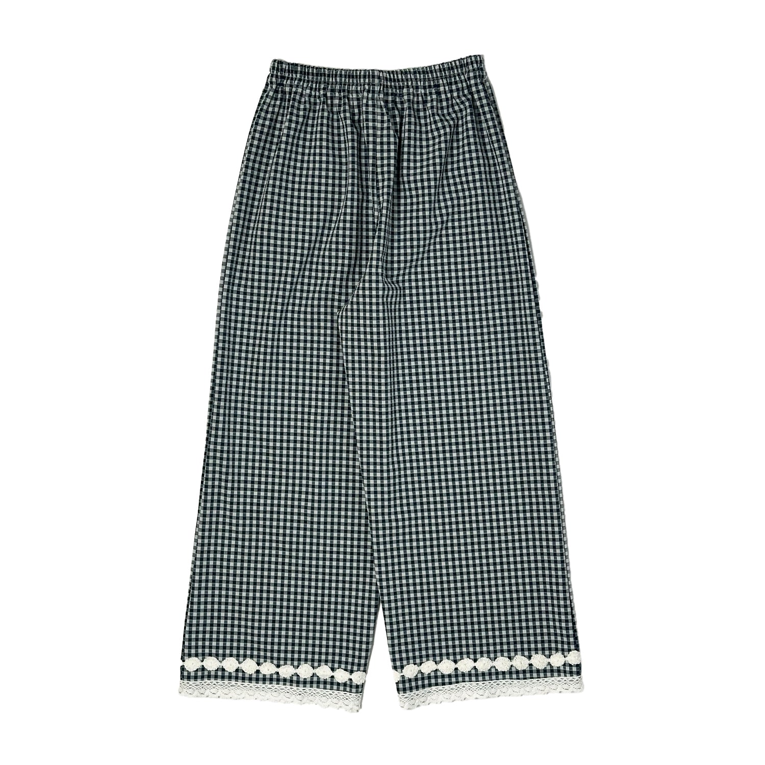 A classic gingham straight-cut pants with an elastic waist and lace-trim hem for a playful style.