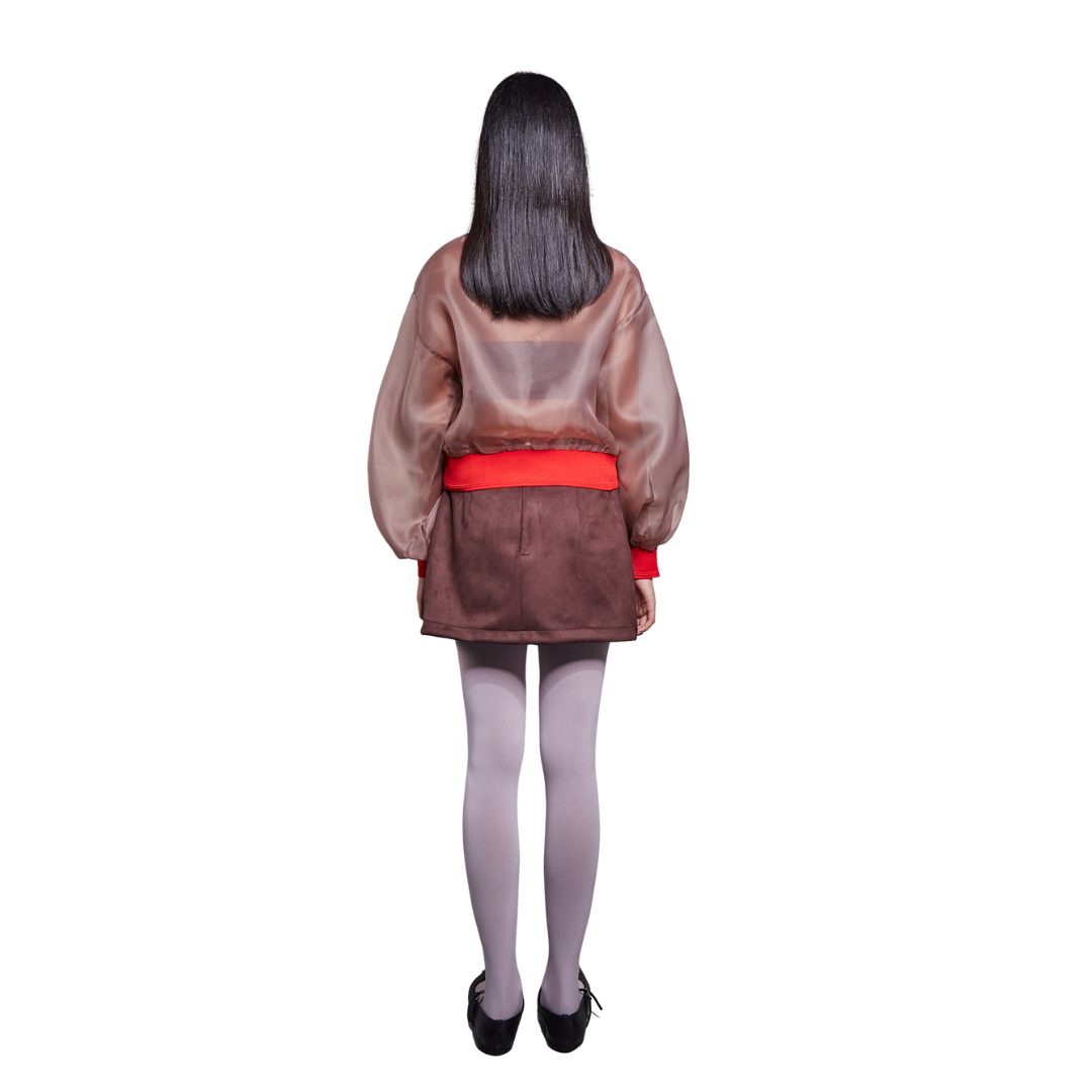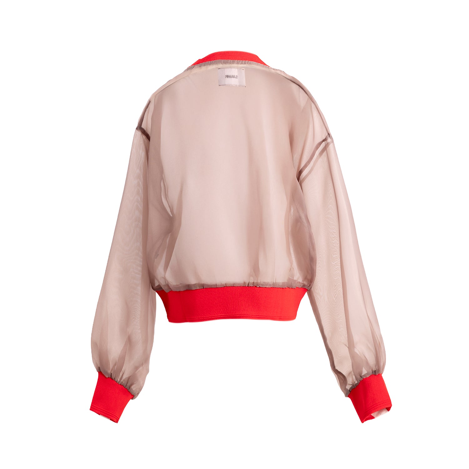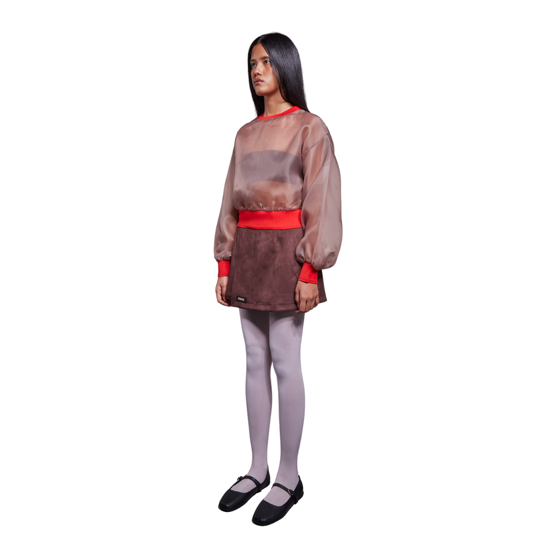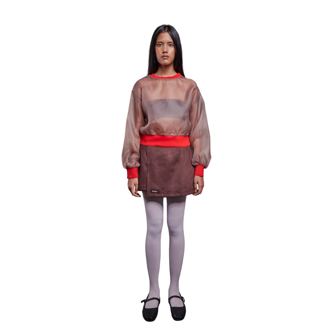 Translucent top crafted from coffee Japanese organza, cinched at the neckline, cuffs, and waist with elastic bands in red