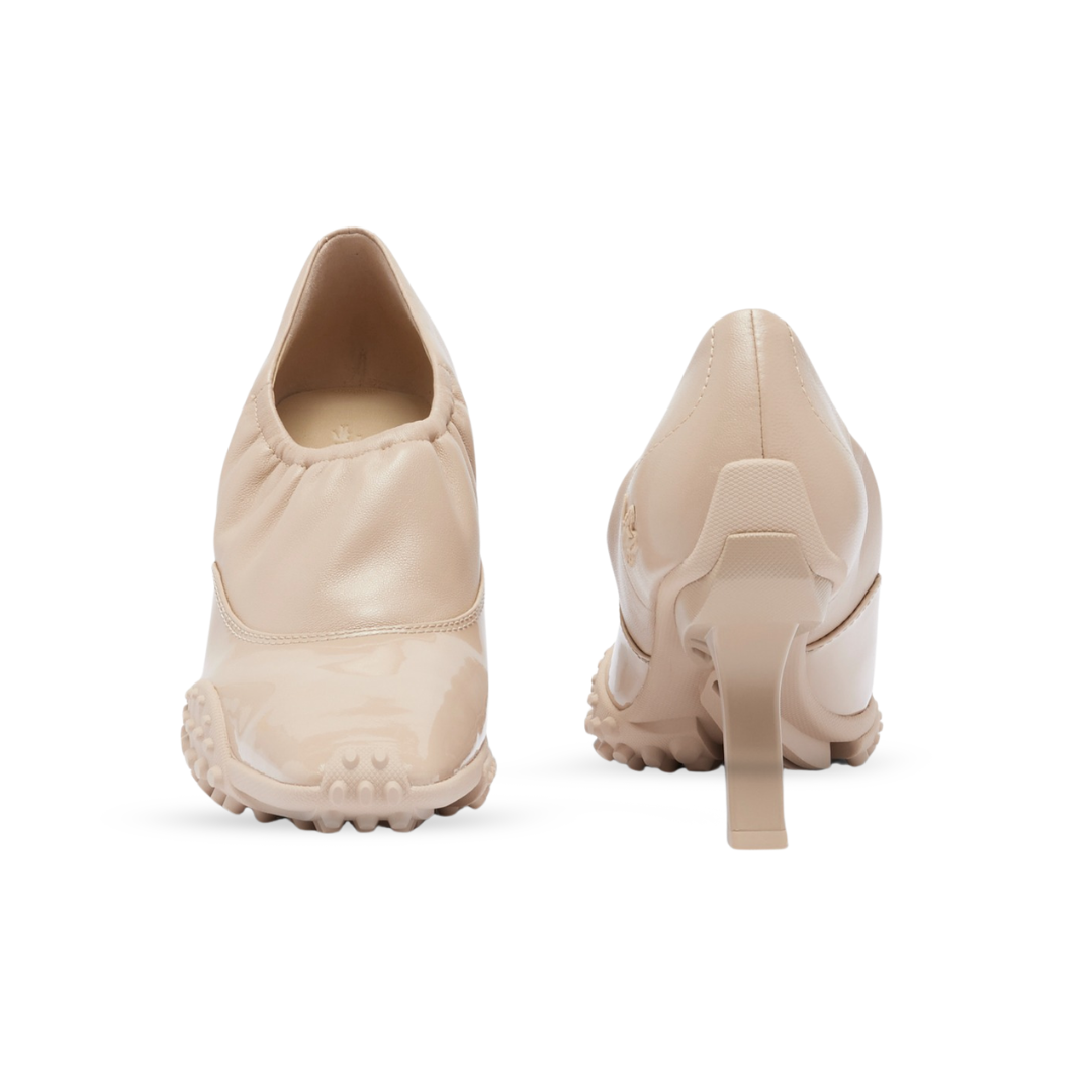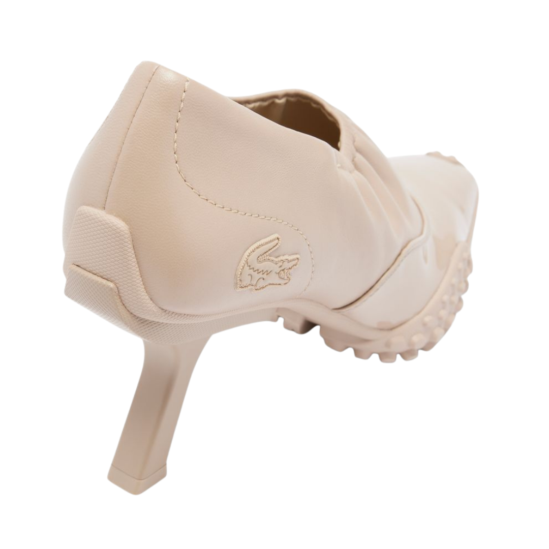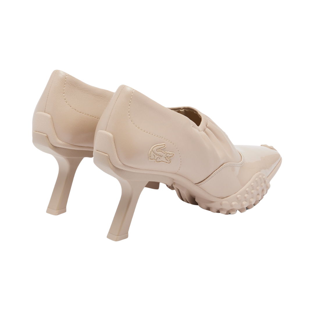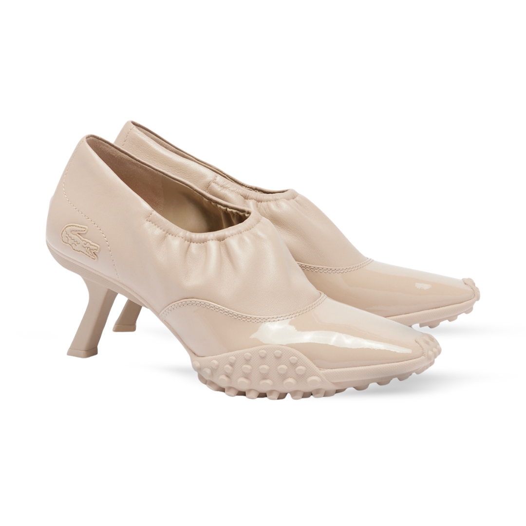 Our Runway heels, first seen at the FW25 show, blend pump and sneaker styles in a celebration of Lacoste’s creative expertise. Featuring a premium stretch leather upper with elasticated collar, a patent panel, and a technical sole with crampons. A bold, hybrid design finished with a signature crocodile.