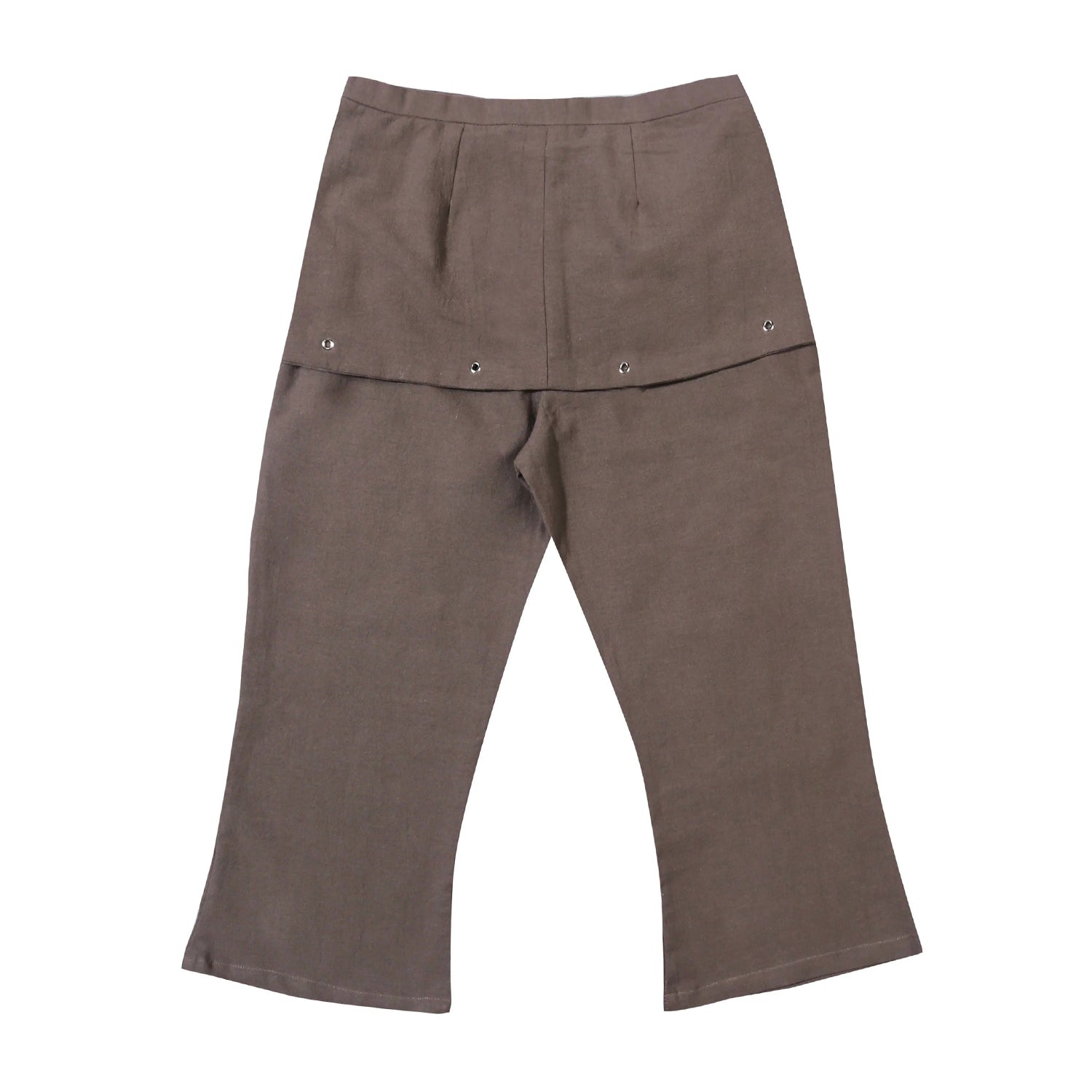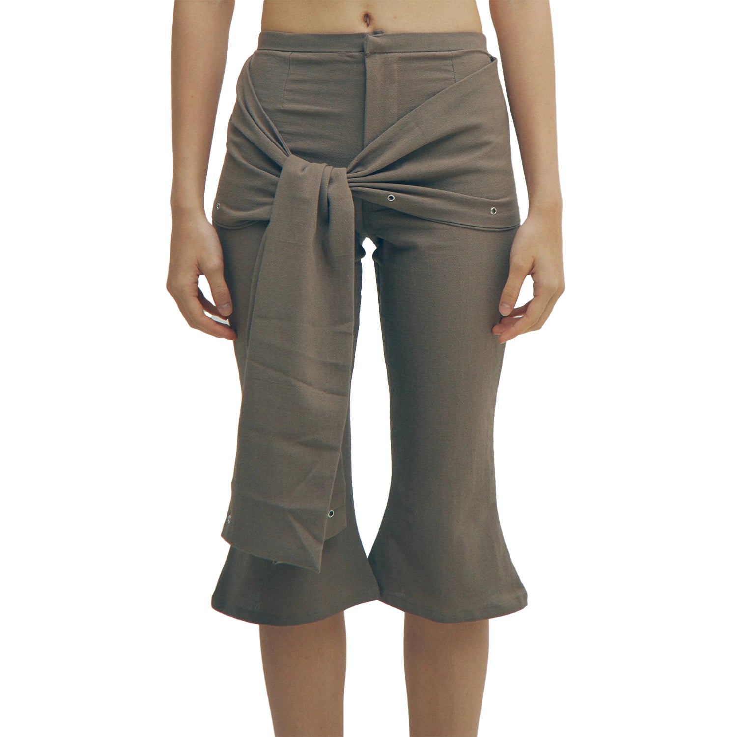 Tailored capris featuring a draped sash detail with eyelets and a tie-front finish.