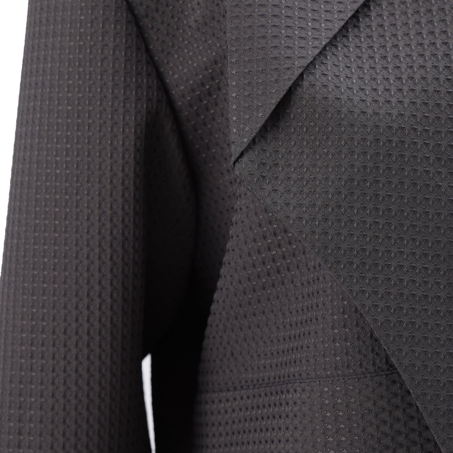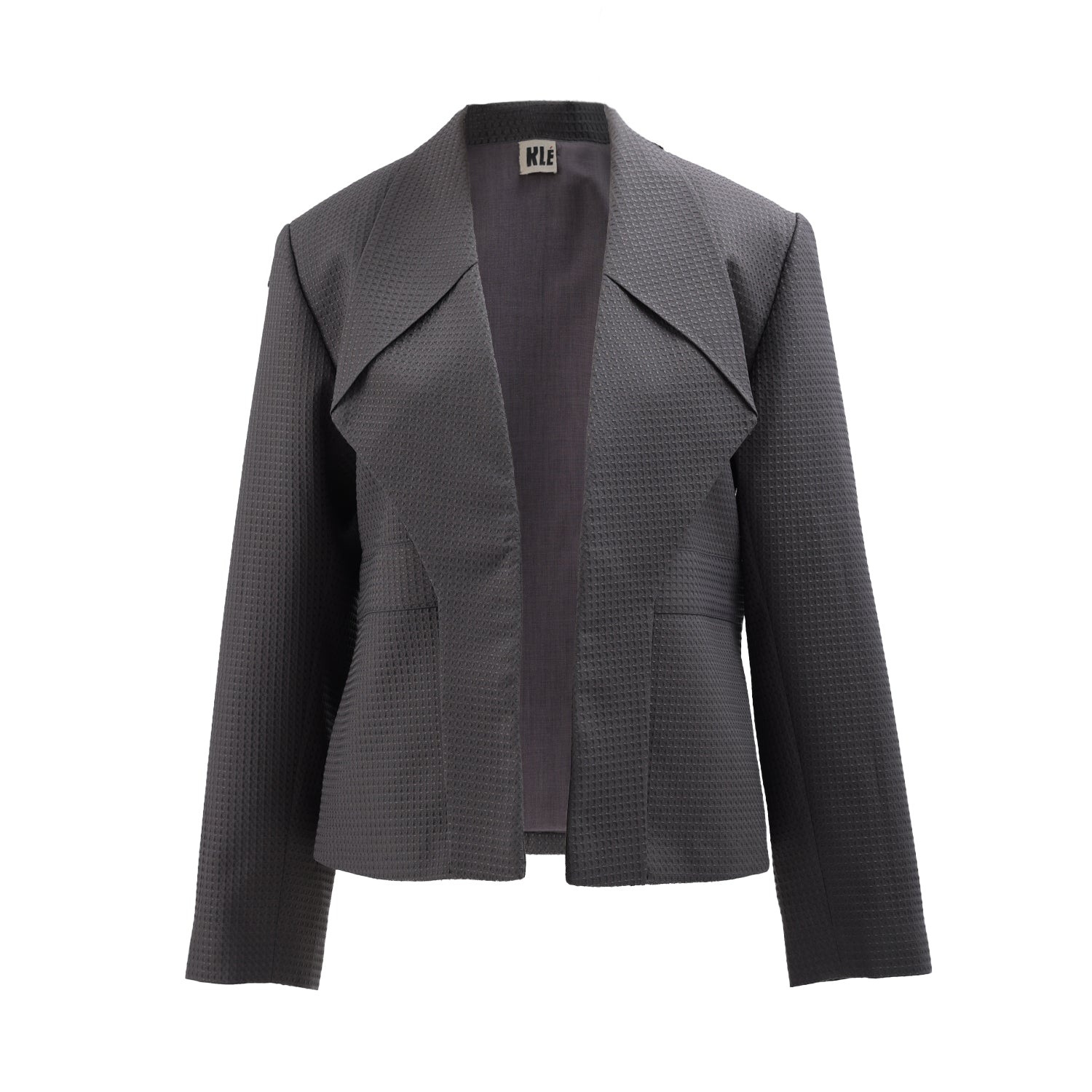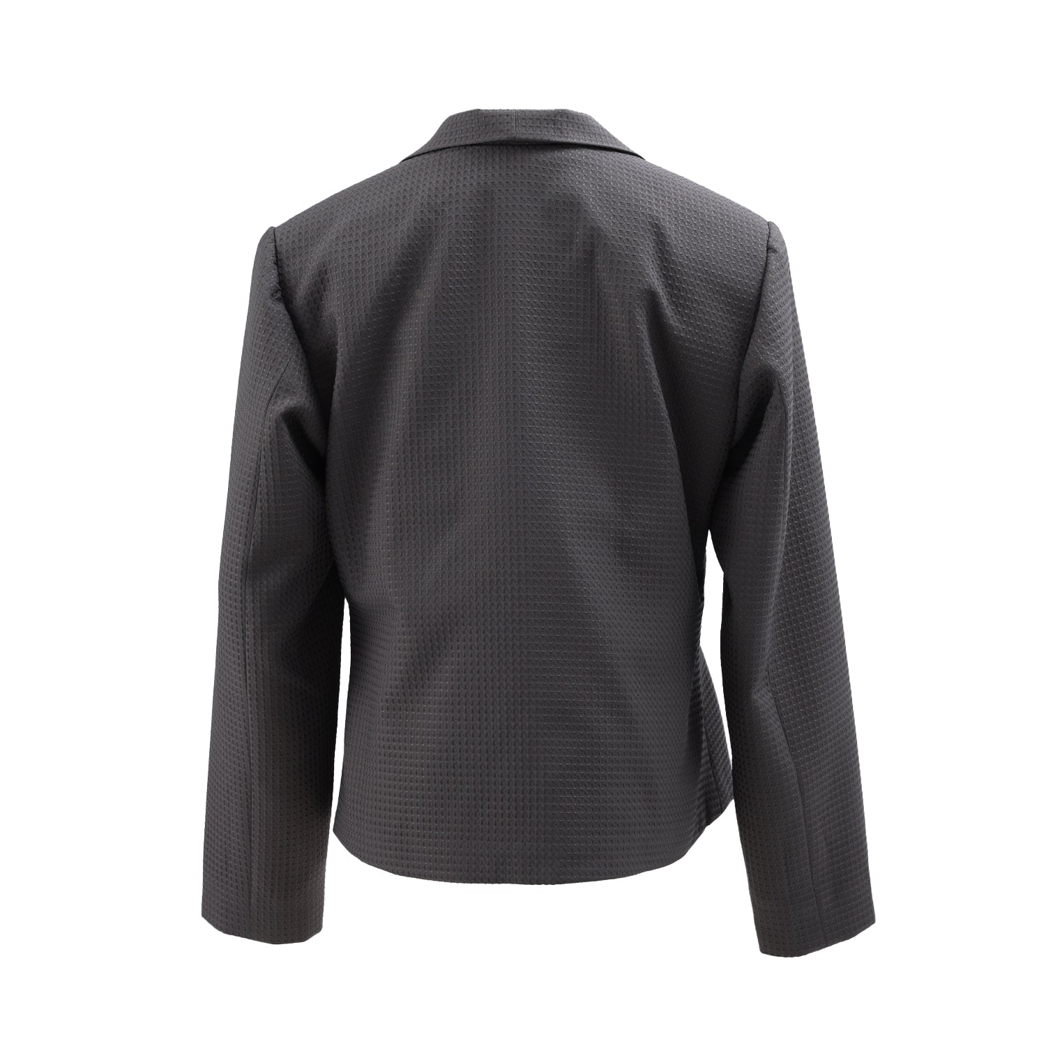 A structured charcoal gray blazer with a minimalist, tailored design. Features sharp lines, subtle texture, and an open front for a modern, versatile look.