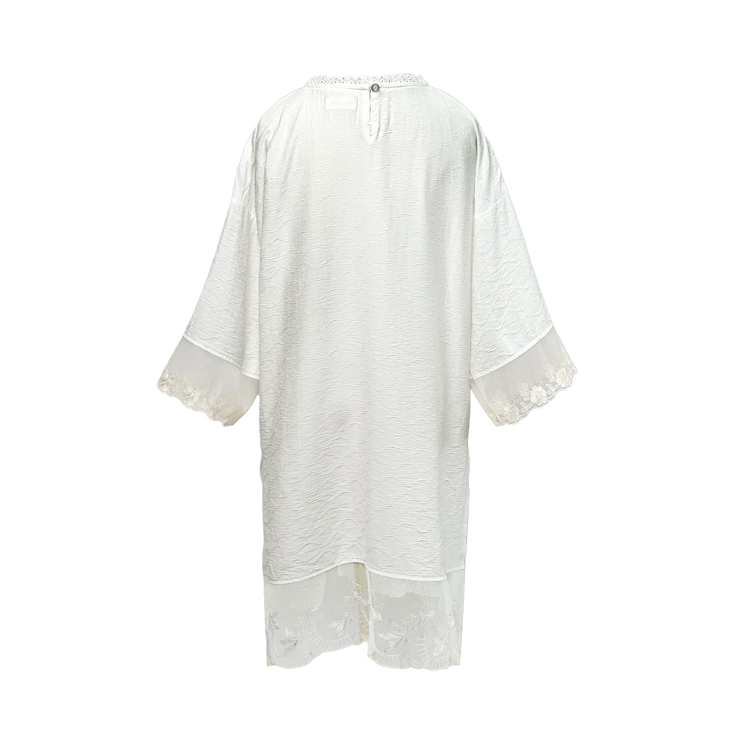 Kaftan made from cotton-poly with a subtle abstract pattern, finished with lace-trimmed 7/8 sleeves and lining.