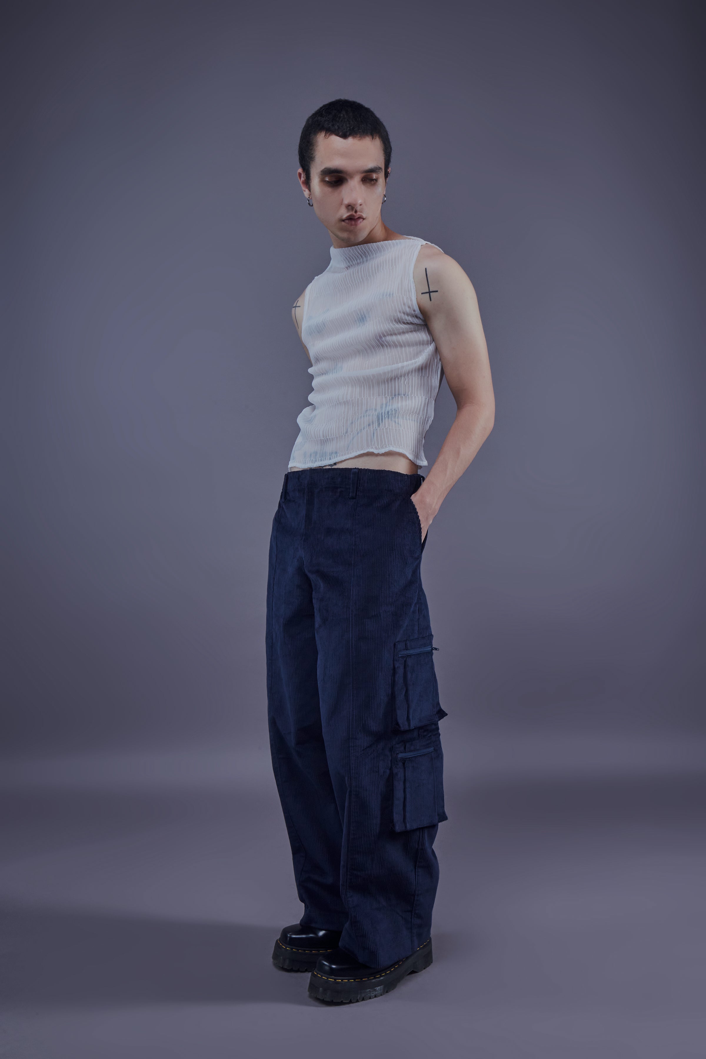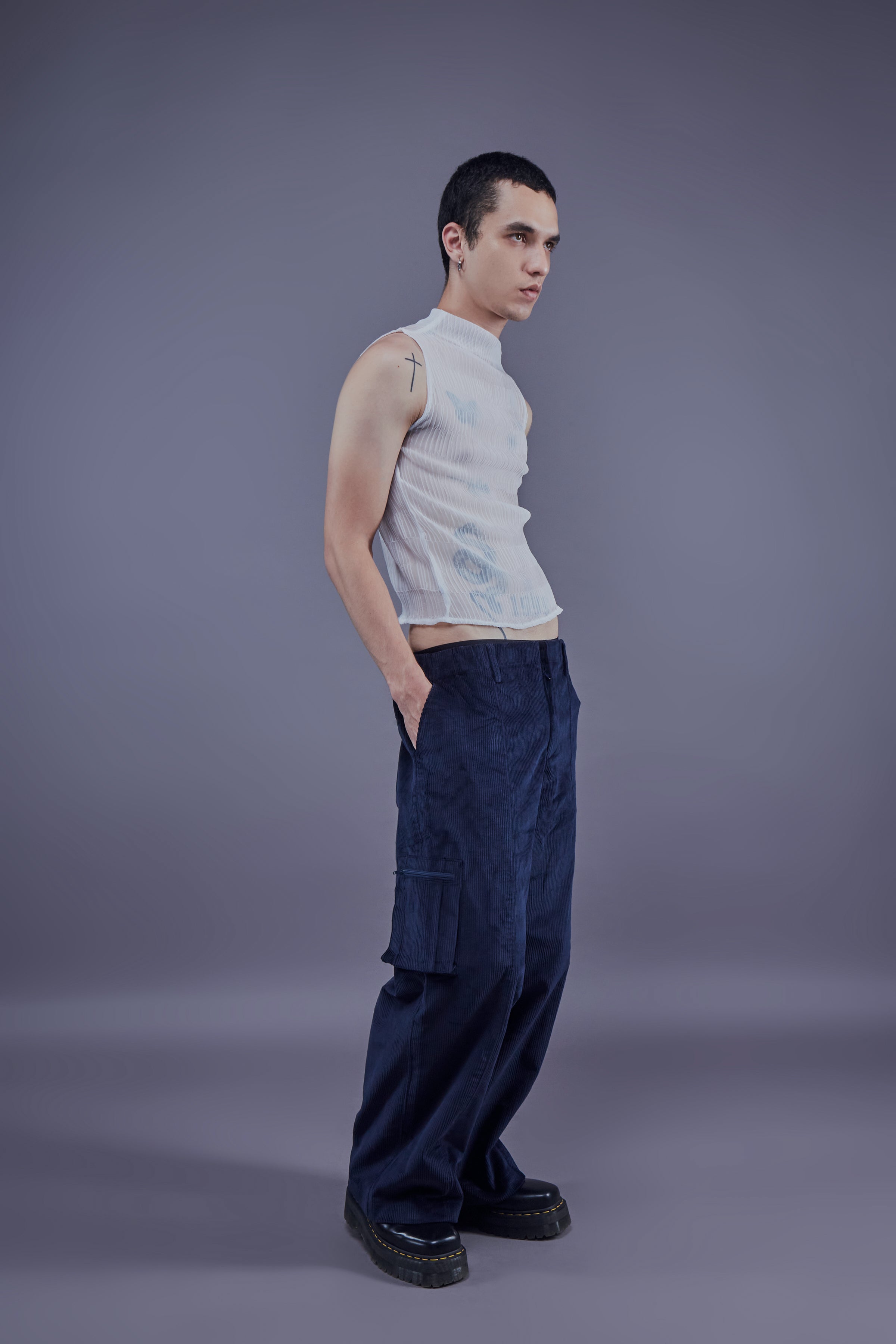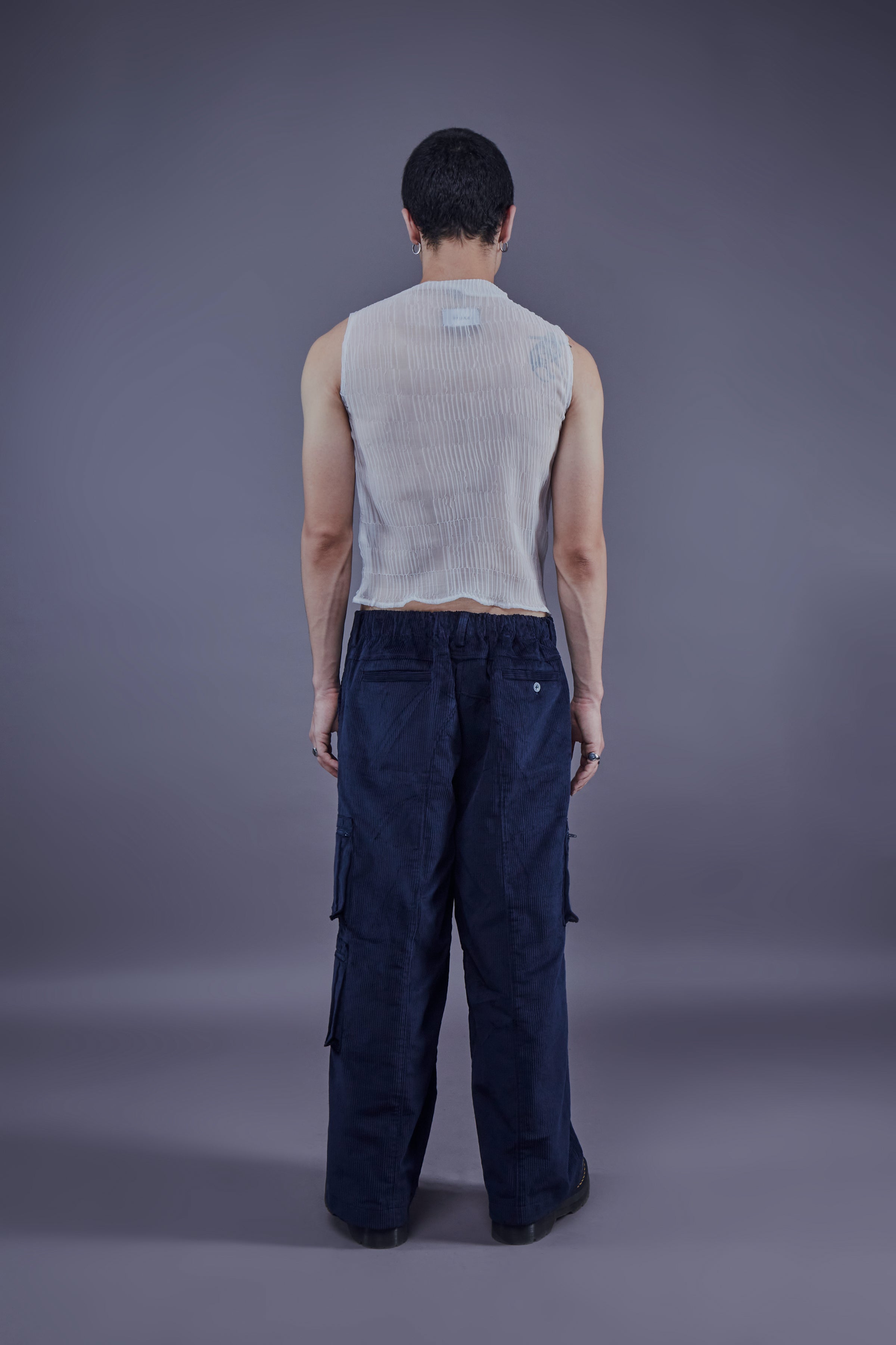 Corduroy cargo pants with a loose fit. Zip fly, flap pockets on the side and elastic waistband.