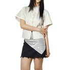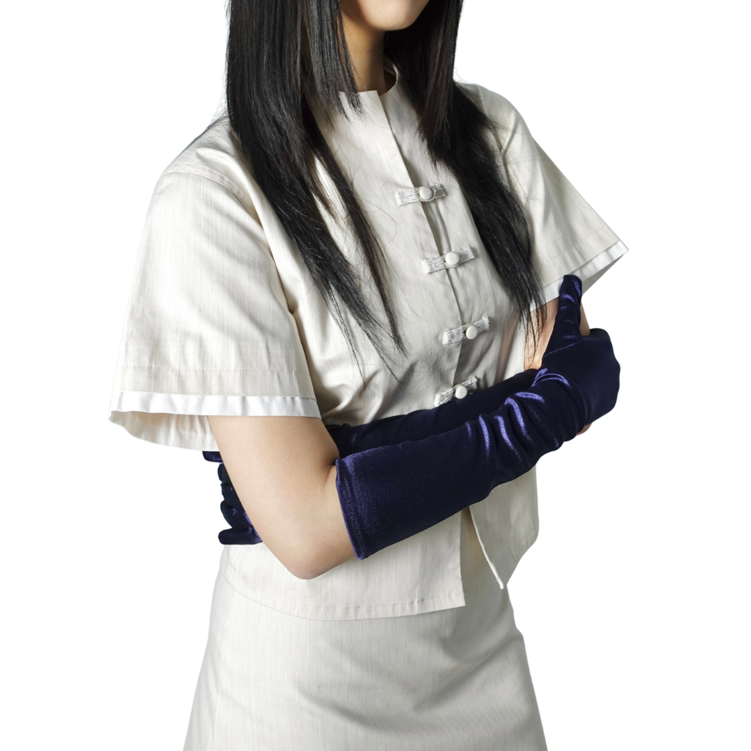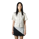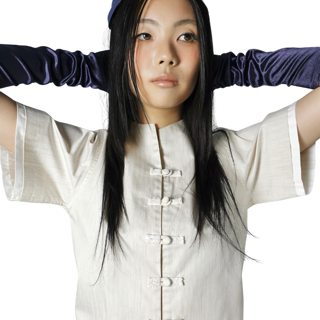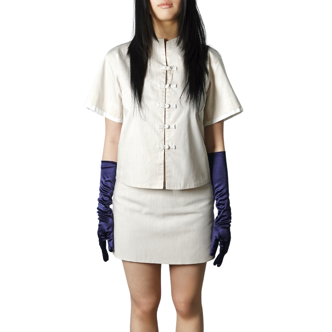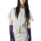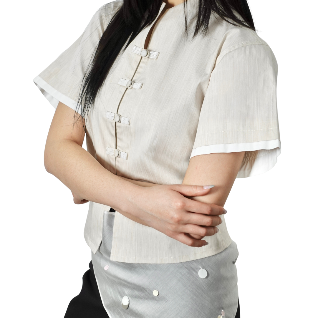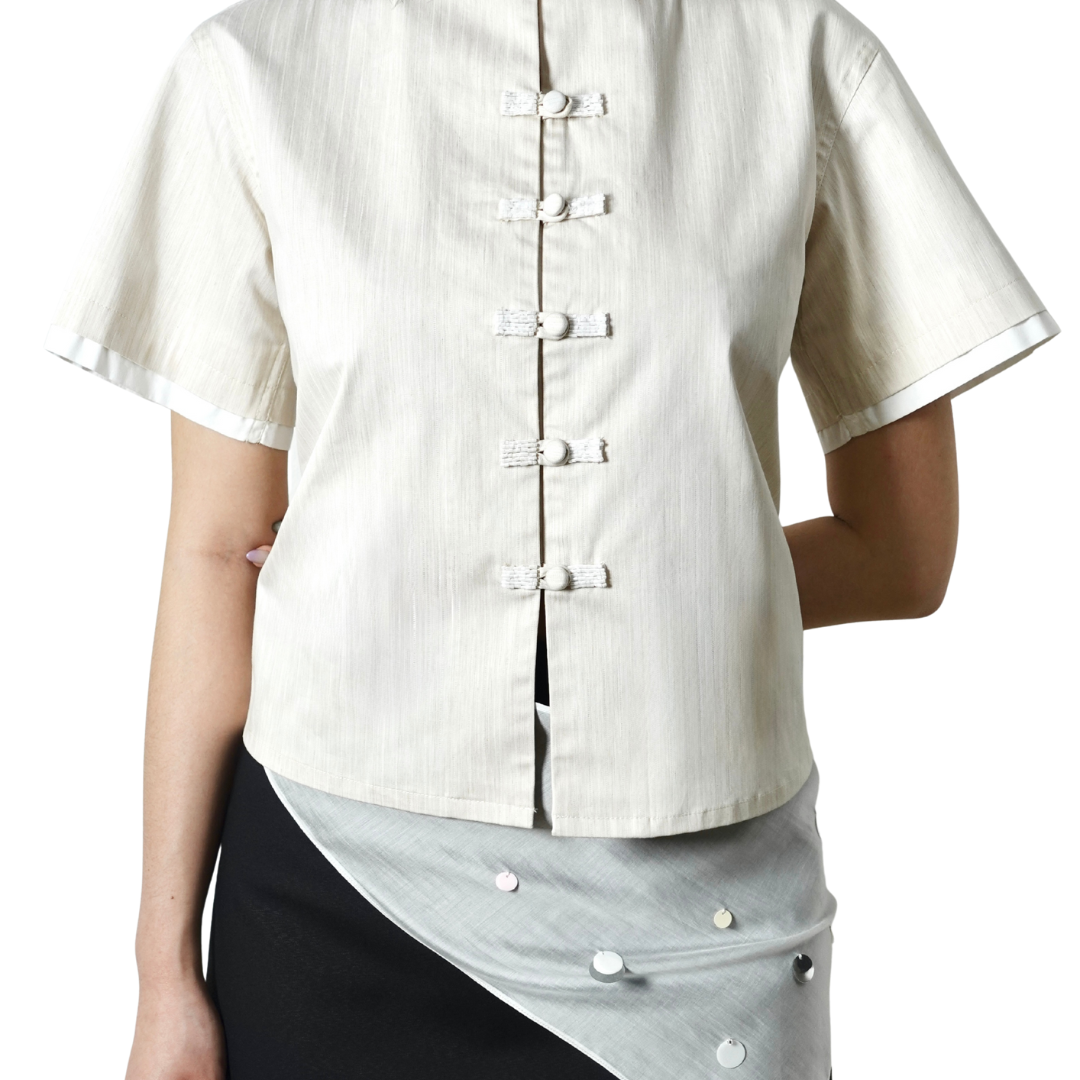 A cropped Boxy-cut shirt featuring reimagined Chinese hand-fastened knot buttoning details with beads decorations on the front, finished with adjustable waist strap for comfort.