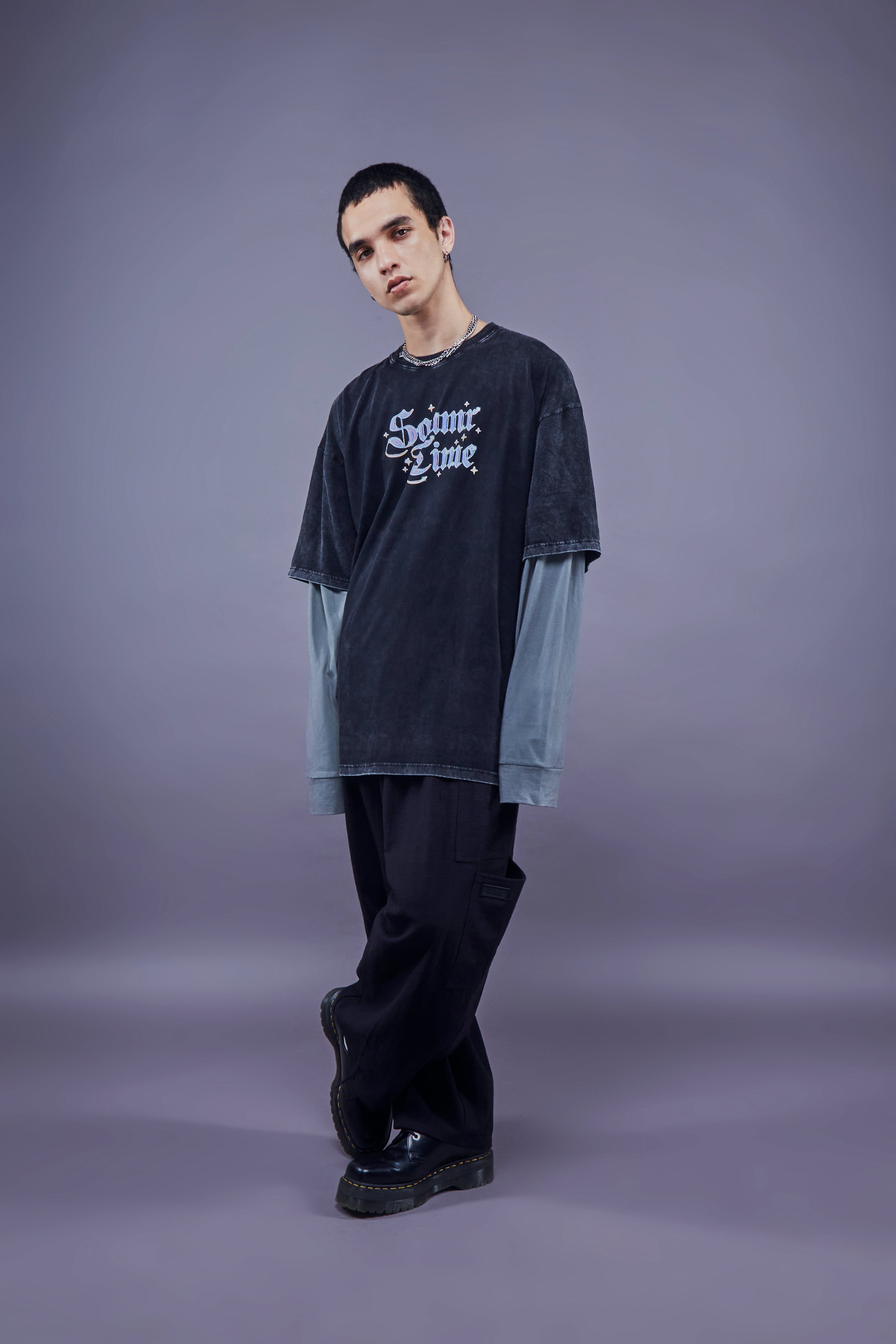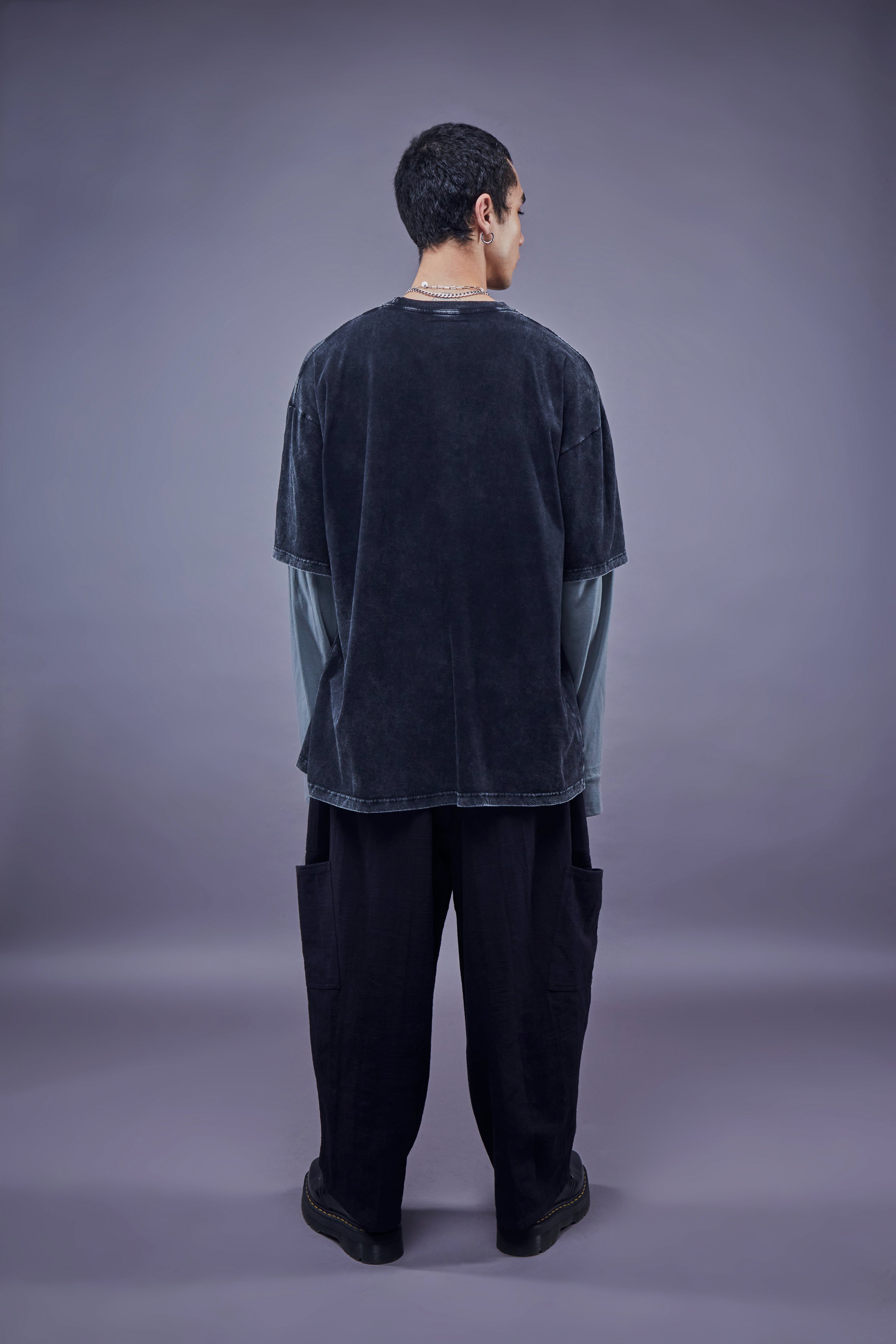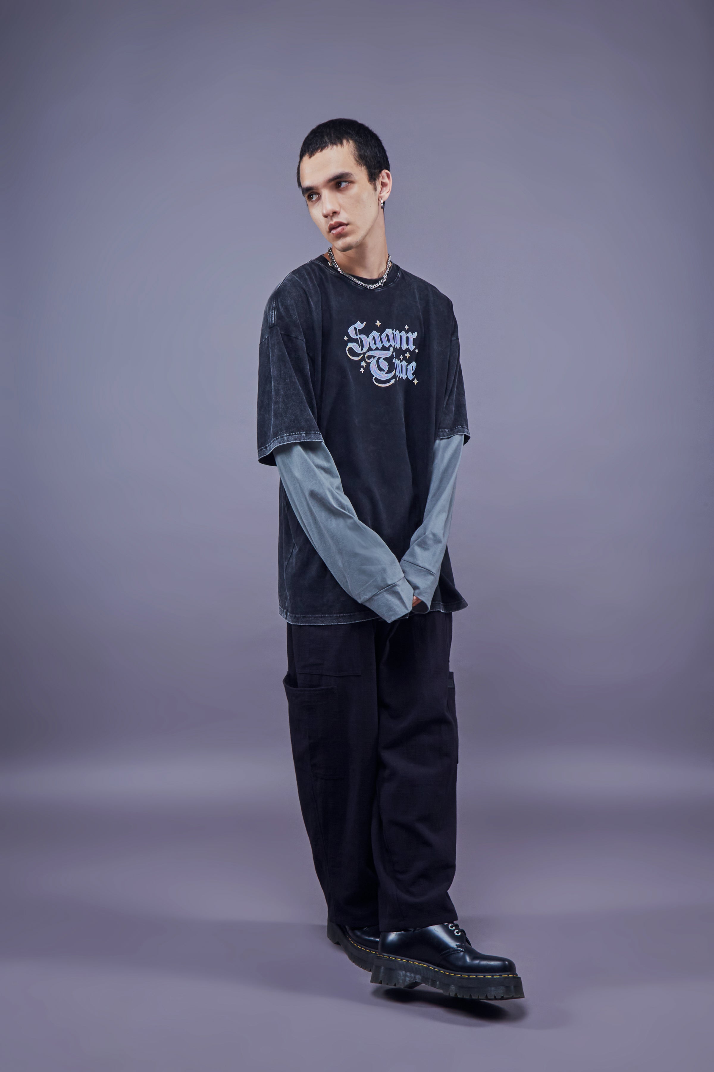 Mock double layered long sleeve tee with oversized graphic overshirt.