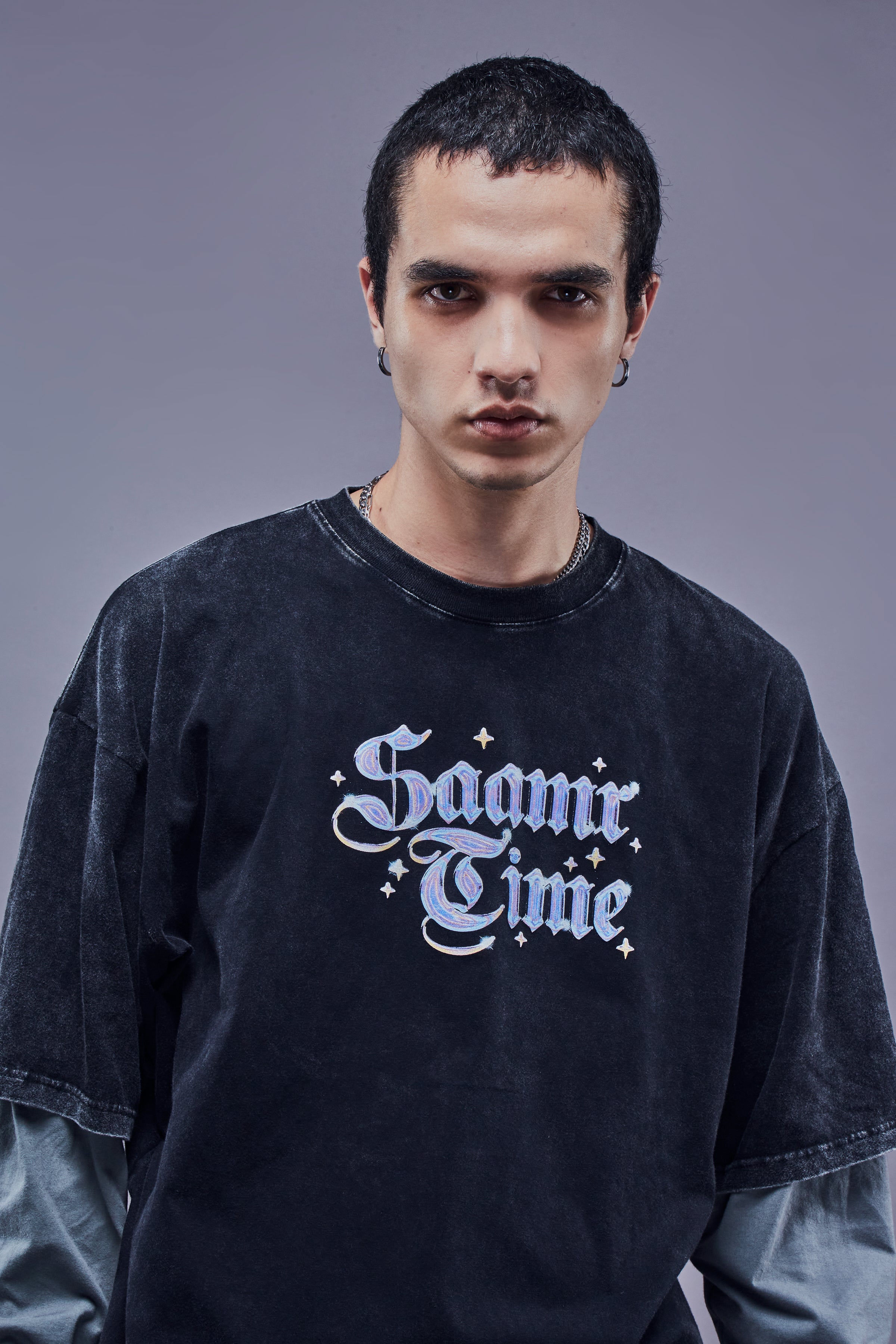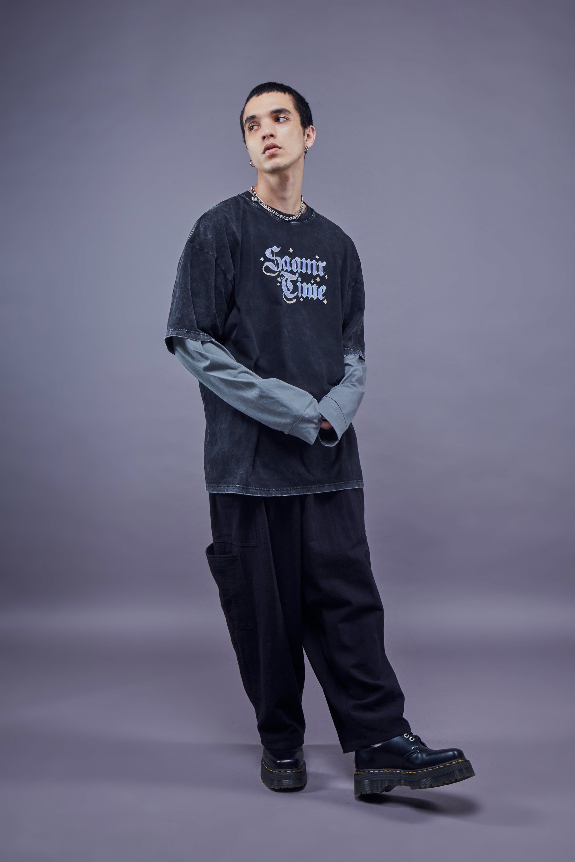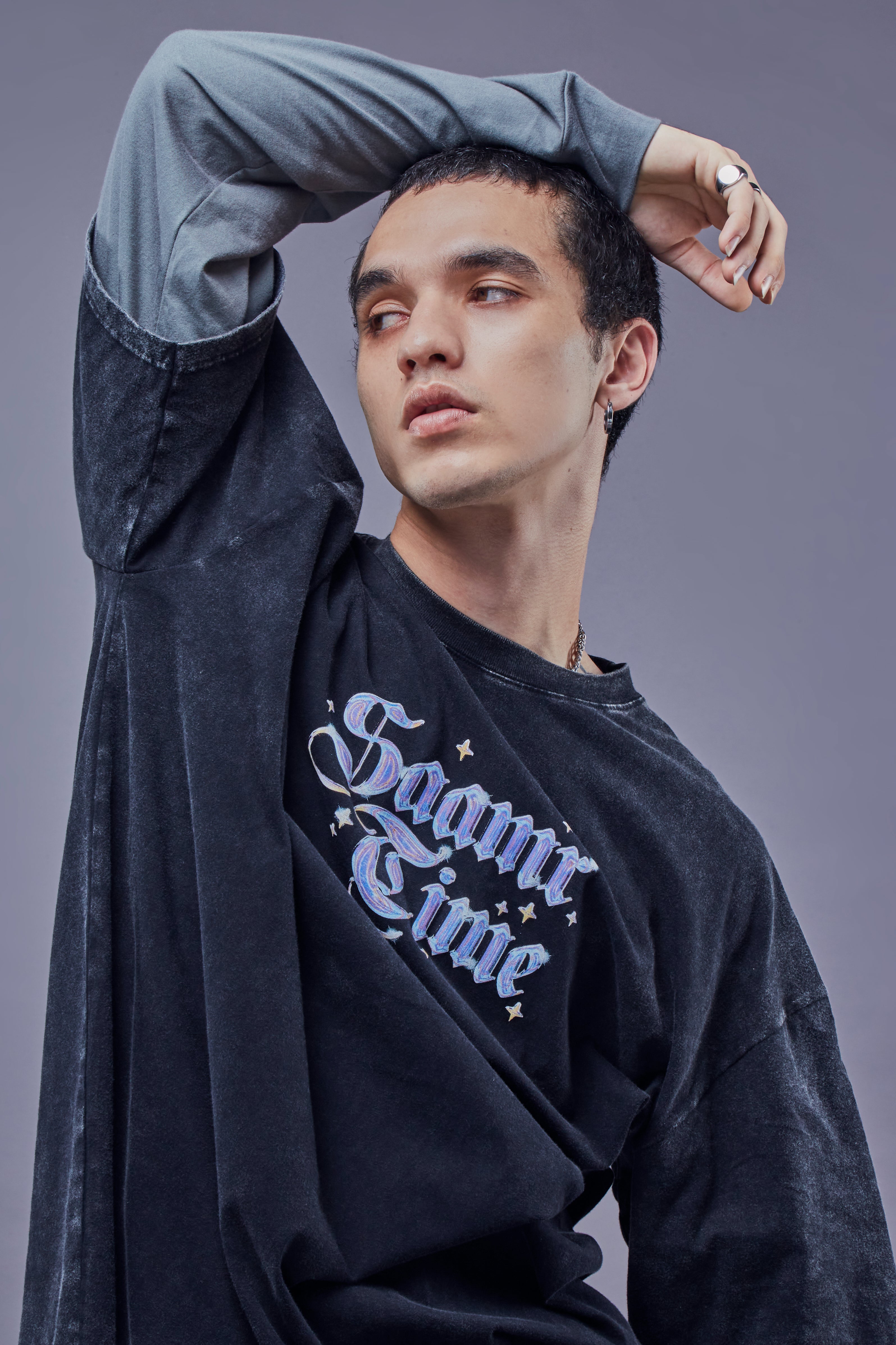 Mock double layered long sleeve tee with oversized graphic overshirt.