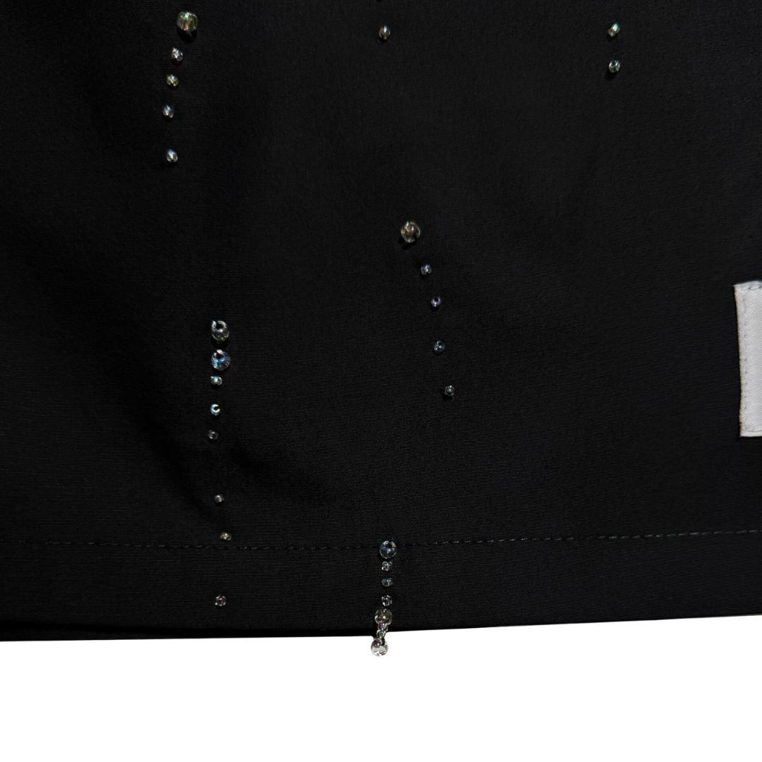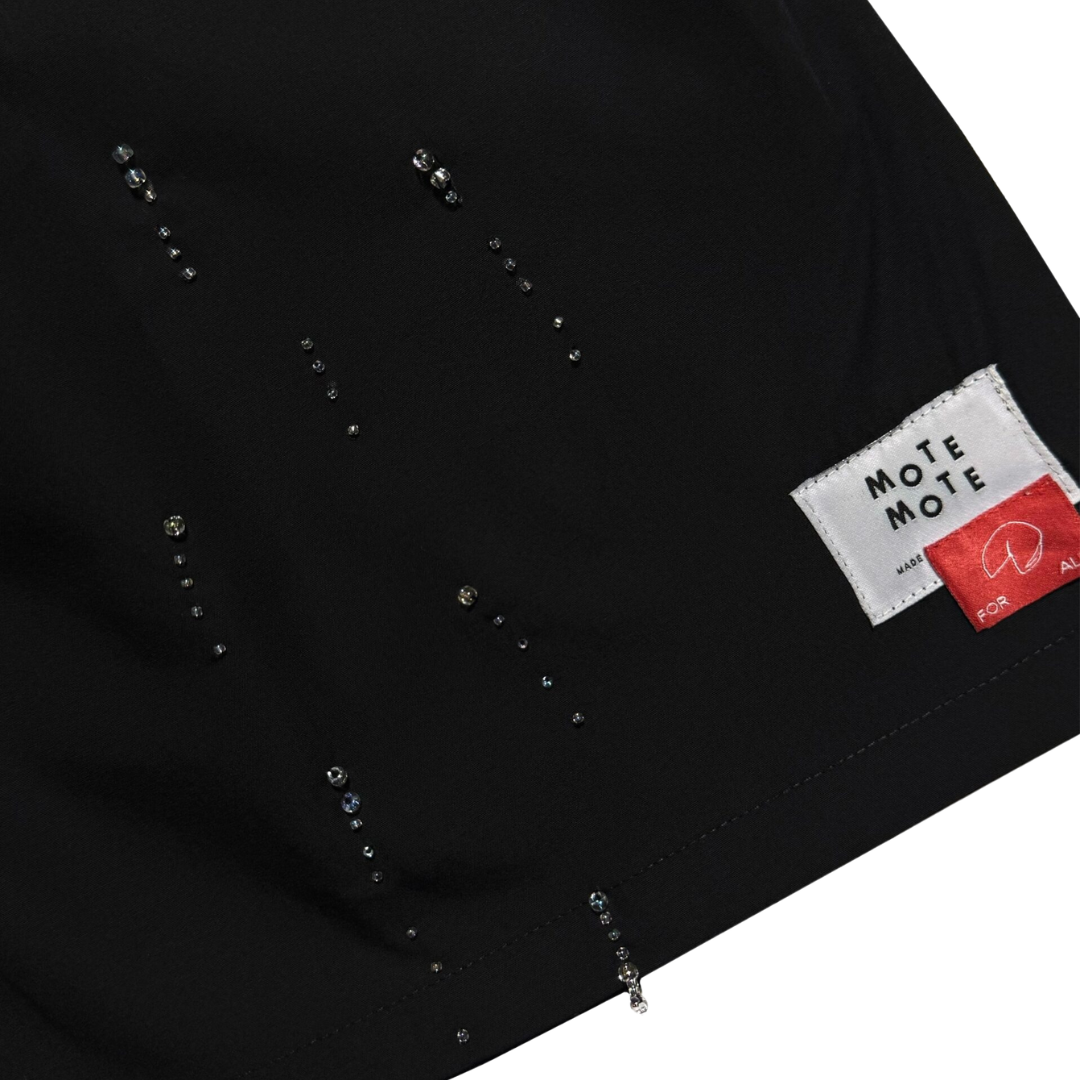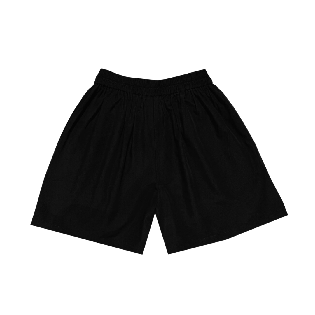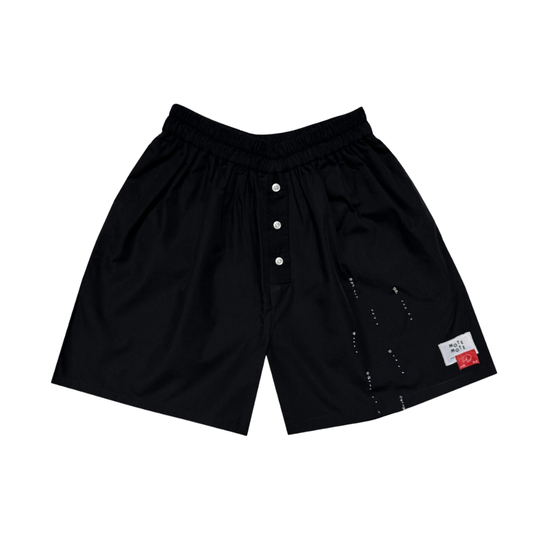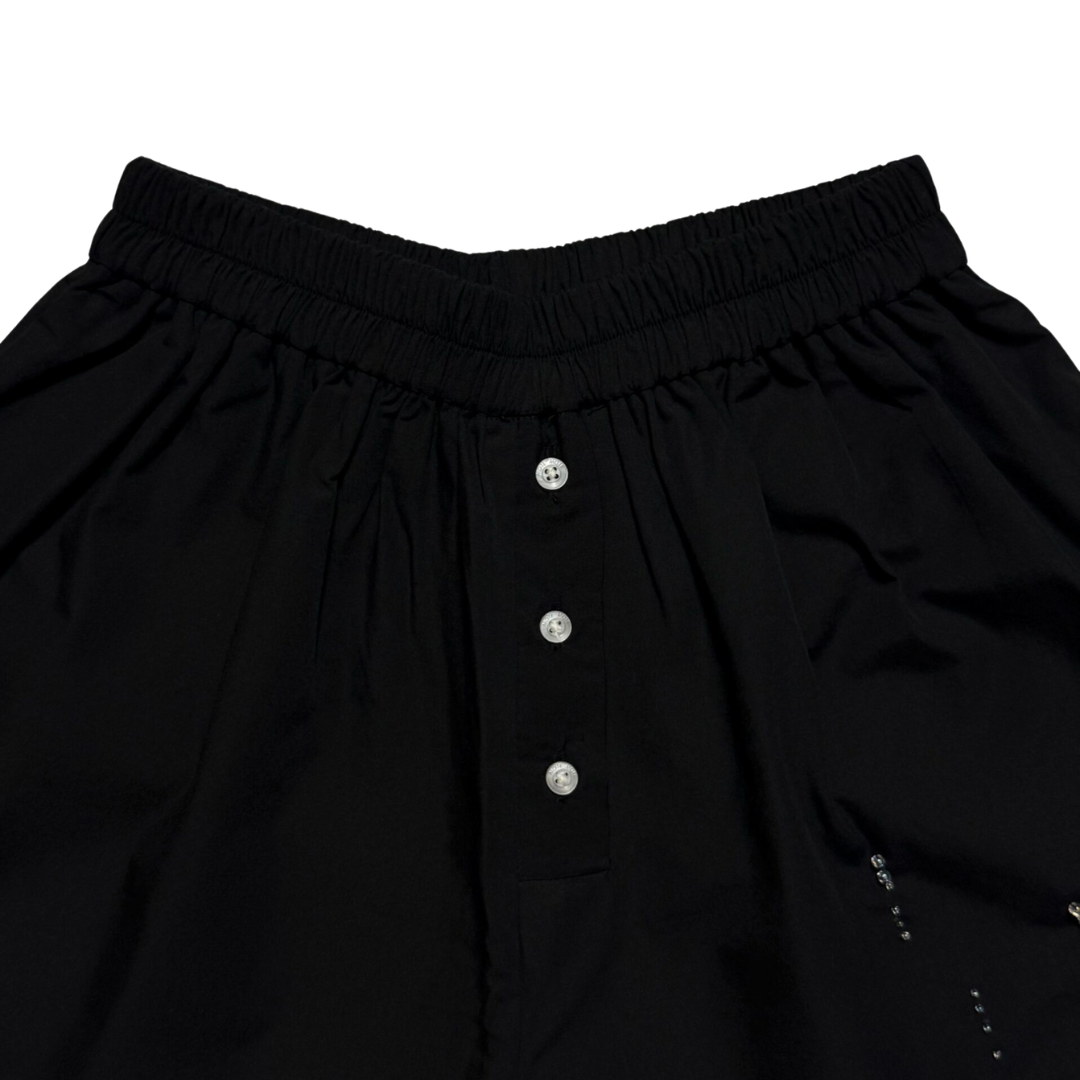 Loose-cut shorts designed with a relaxed silhouette and elastic waistband for all-day comfort. Featuring front button detailing and signature patch label. Embellished with hand-beaded cords on the side for a playful finishing touch.