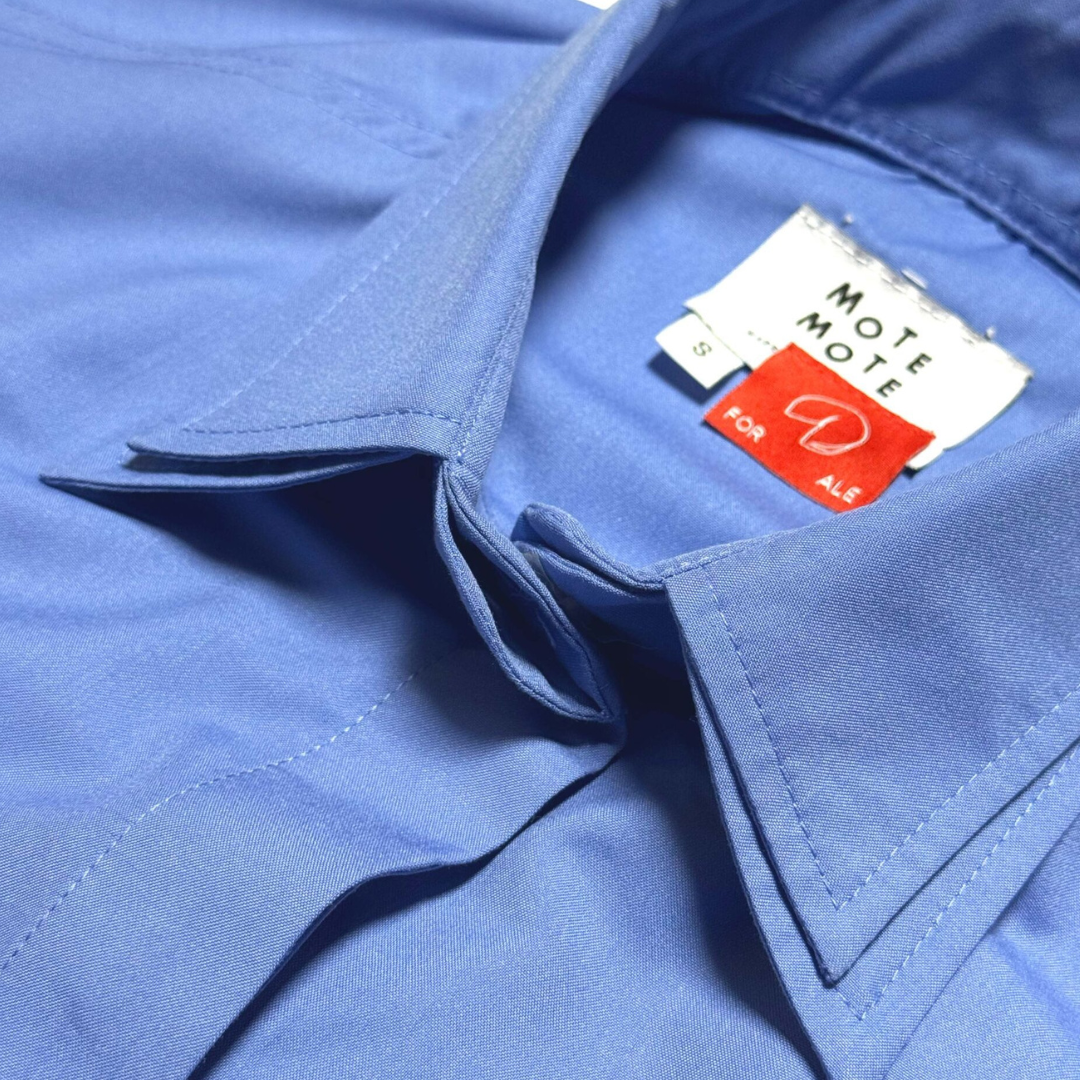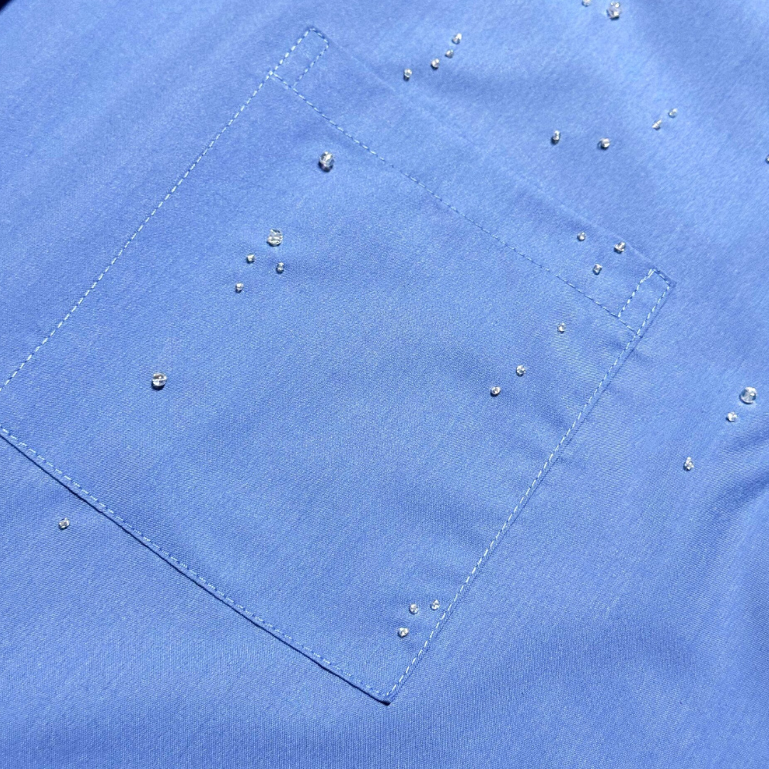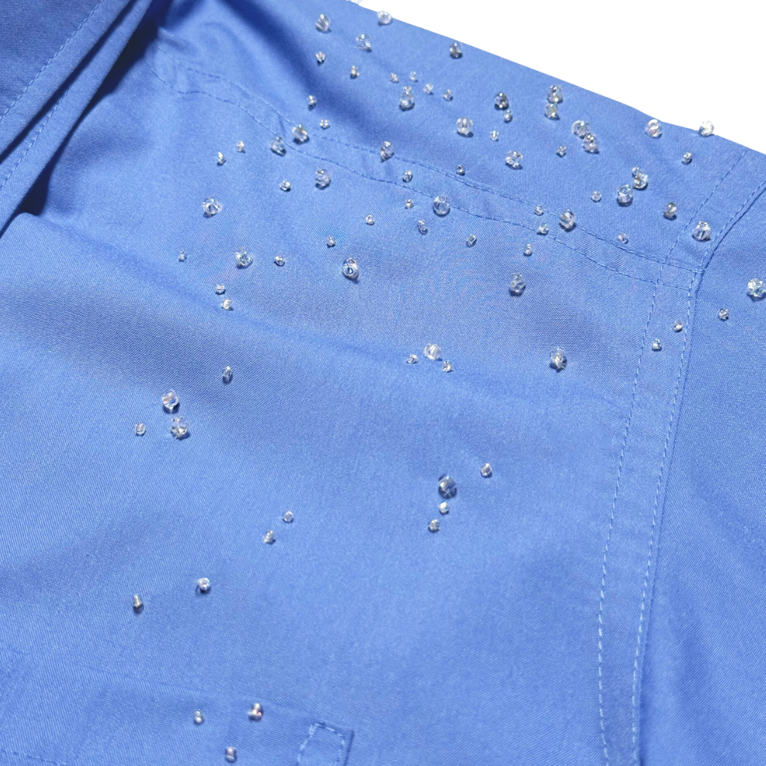 Constructed of double collared details, made in unisex fitting. Adorned with hand-beaded embellishments on the collar, neatly finished with Mote Mote’s embossed transparent buttons.