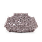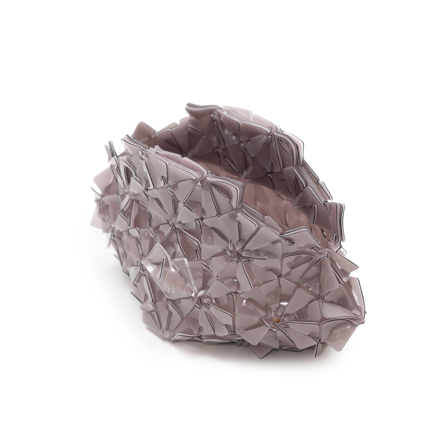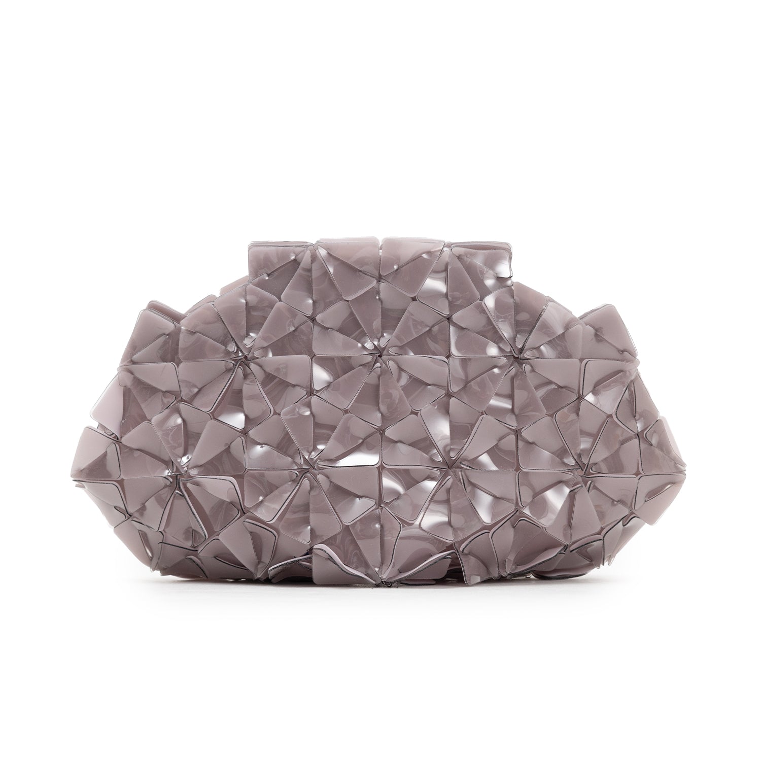 Woven clutch bag with a compact size specifically designed as a party bag. Made from a combination of shiny PVC and latex for a futuristic and avant-garde effect. Can fit smartphones and lipstick. Features a magnetic closure and laser-cut branding details. Length dimensions: 25 cm, width 15 cm, thickness 11.5 cm