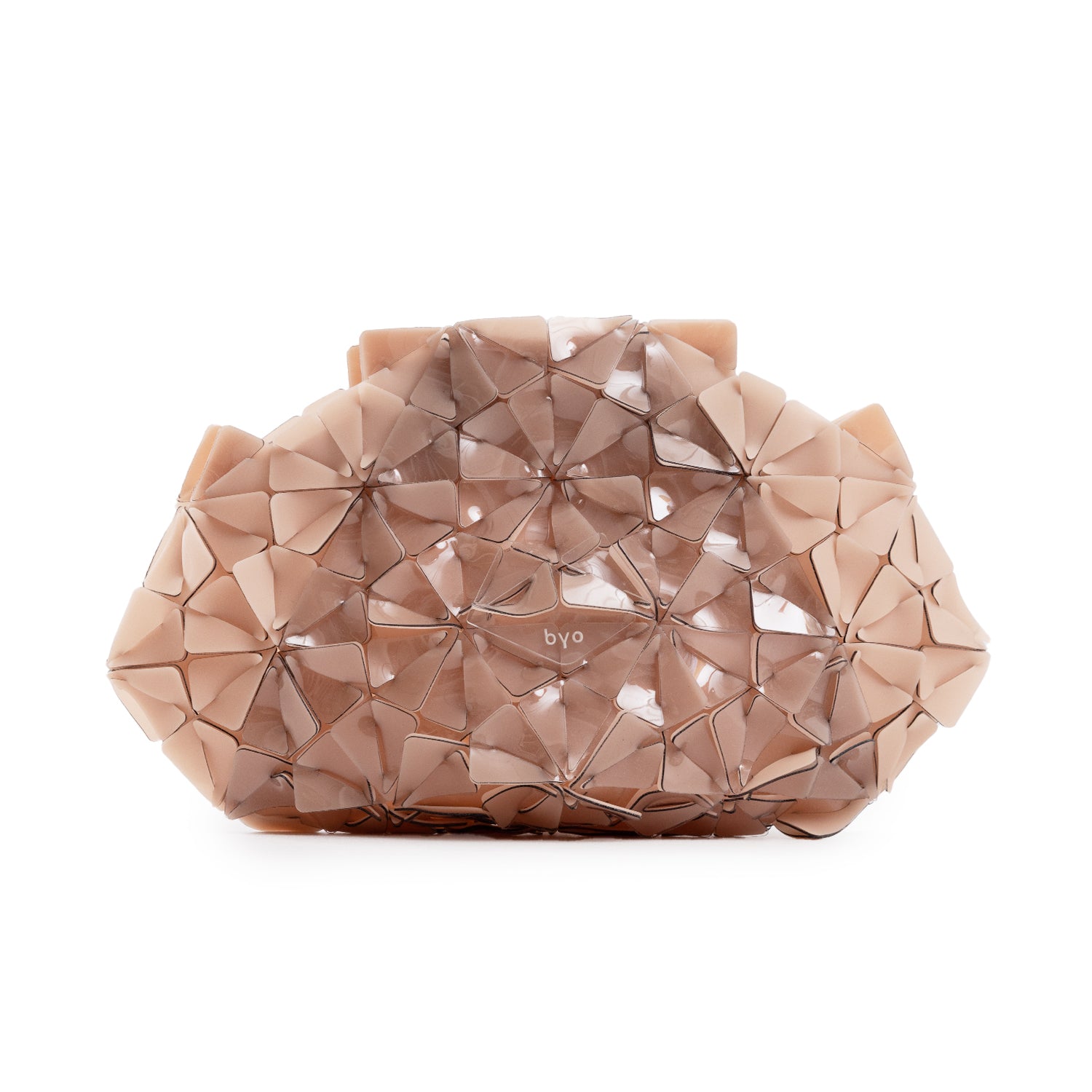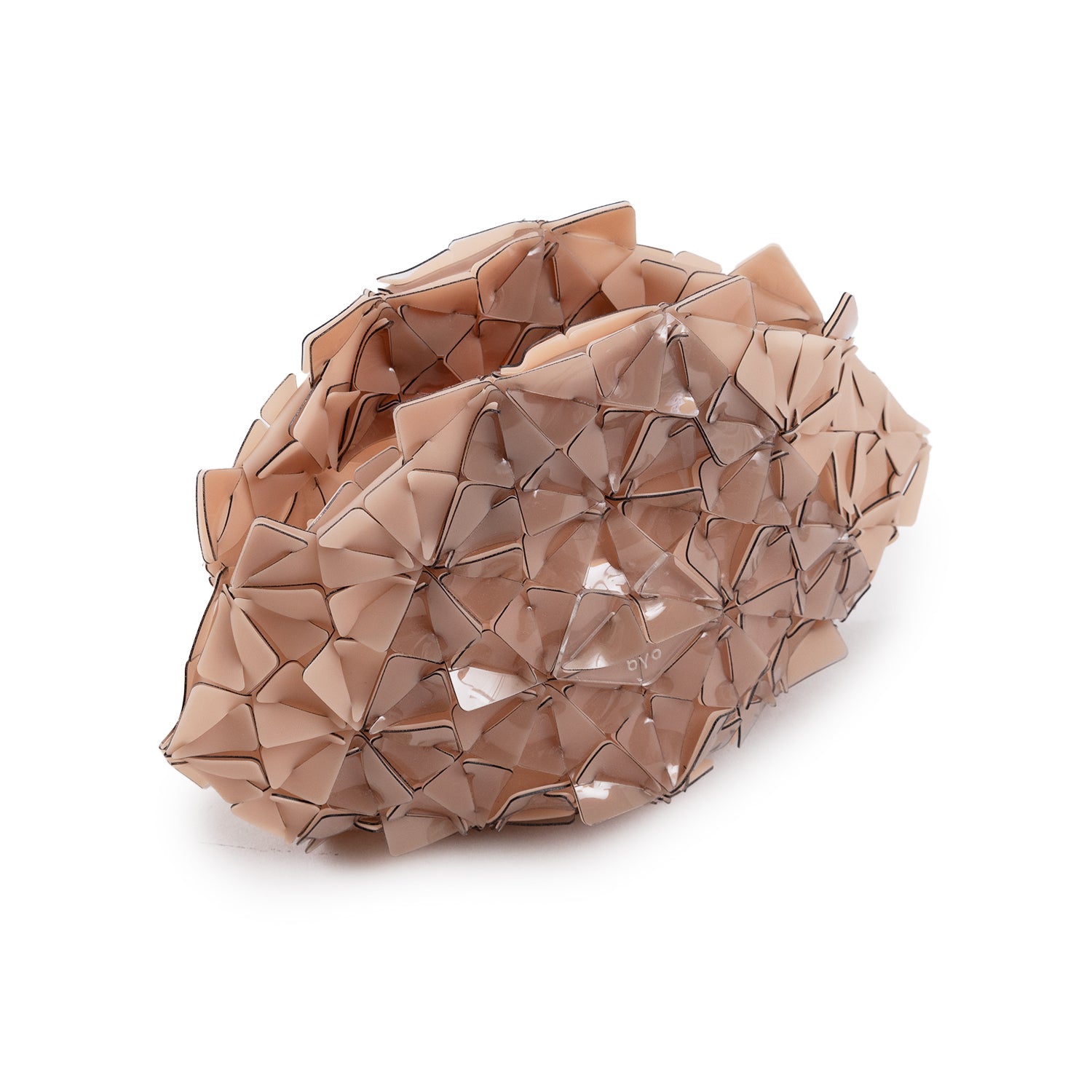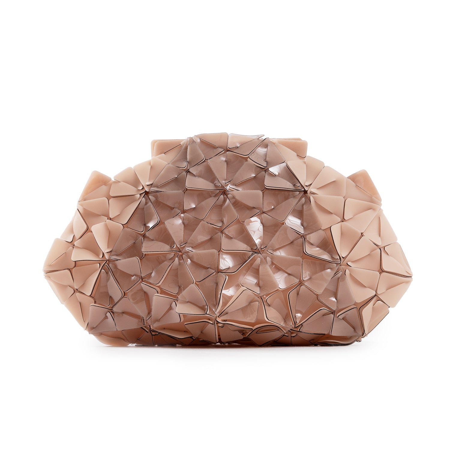 Woven clutch bag with a compact size specifically designed as a party bag. Made from a combination of shiny PVC and latex for a futuristic and avant-garde effect. Can fit smartphones and lipstick. Features a magnetic closure and laser-cut branding details. Length dimensions: 25 cm, width 15 cm, thickness 11.5 cm