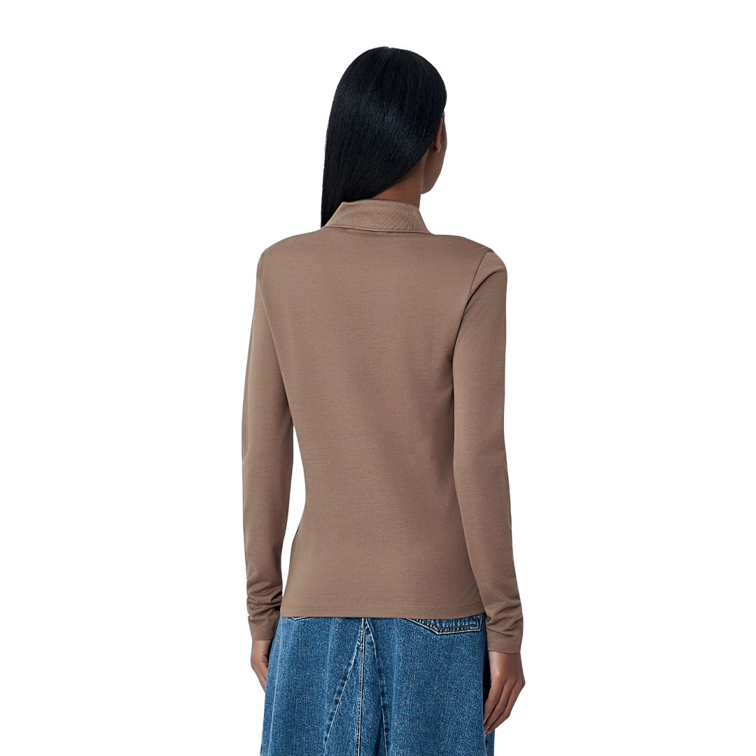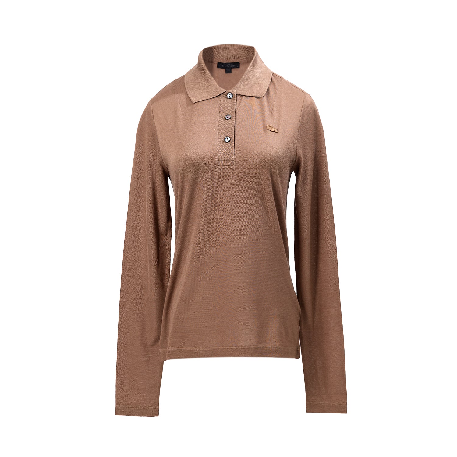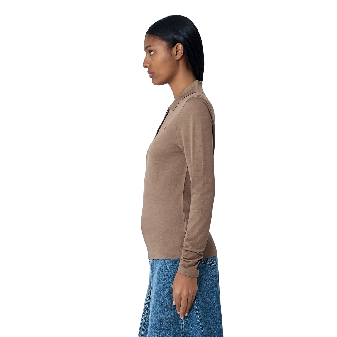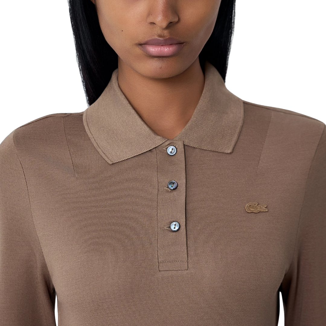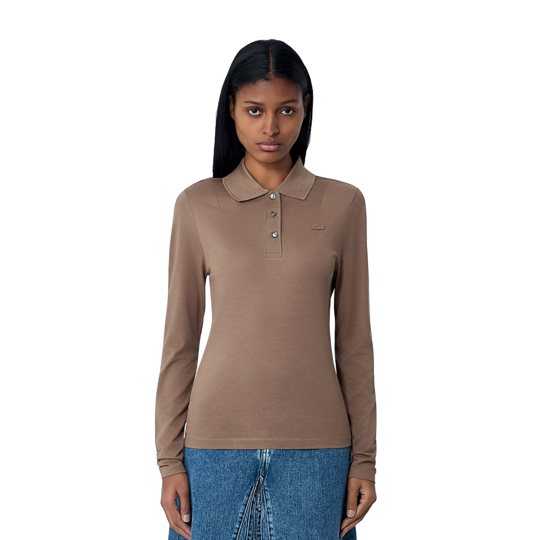 This long-sleeved FW25 runway design from Lacoste, inventors of the polo shirt in 1933, offers a sensual, feminine take on an iconic style. A fitted piece in our signature mini-piqué knit fabric, made from soft, luminous silk for a luxurious feel. A sophisticated piece with premium details, including shoulder darts and an embroidered signature crocodile.