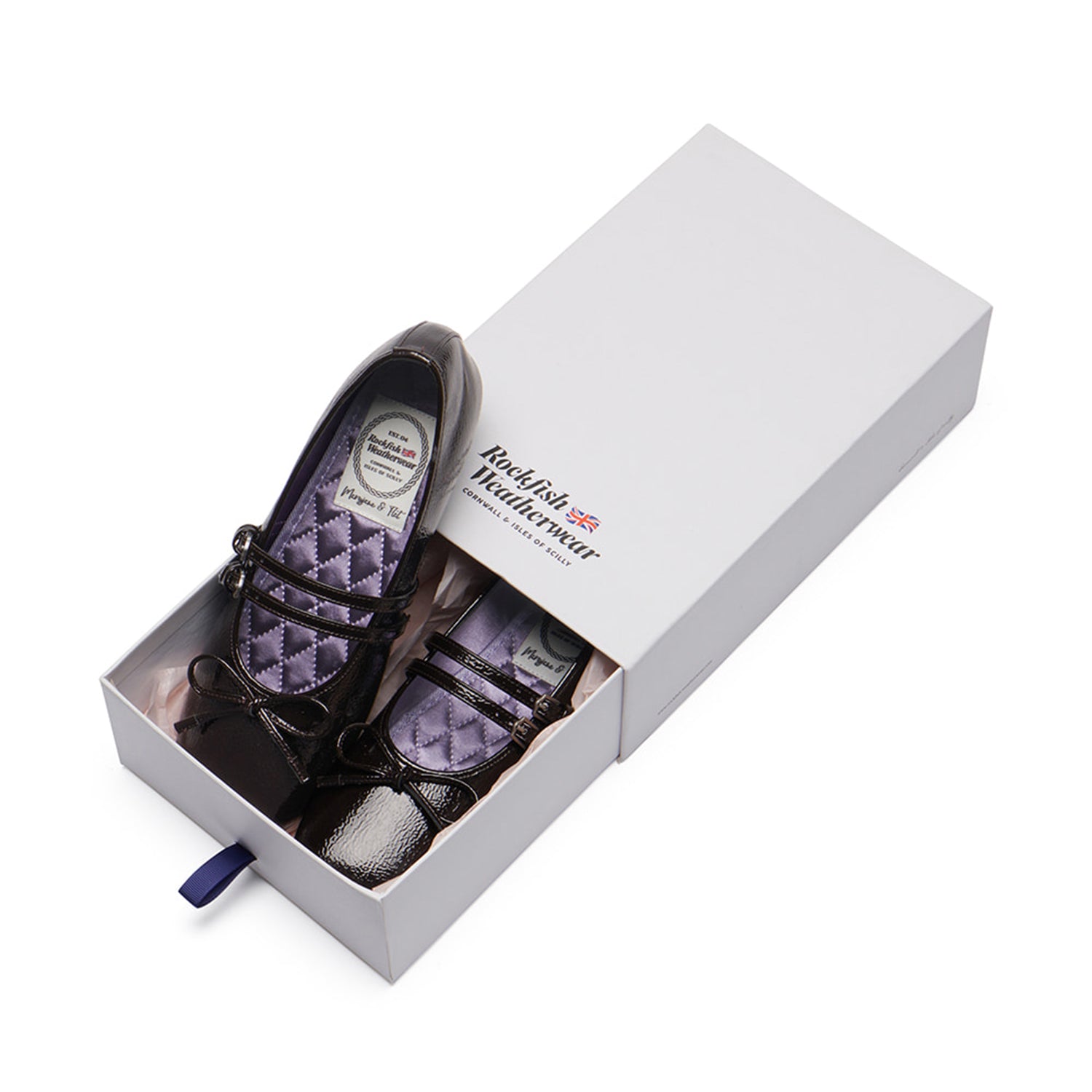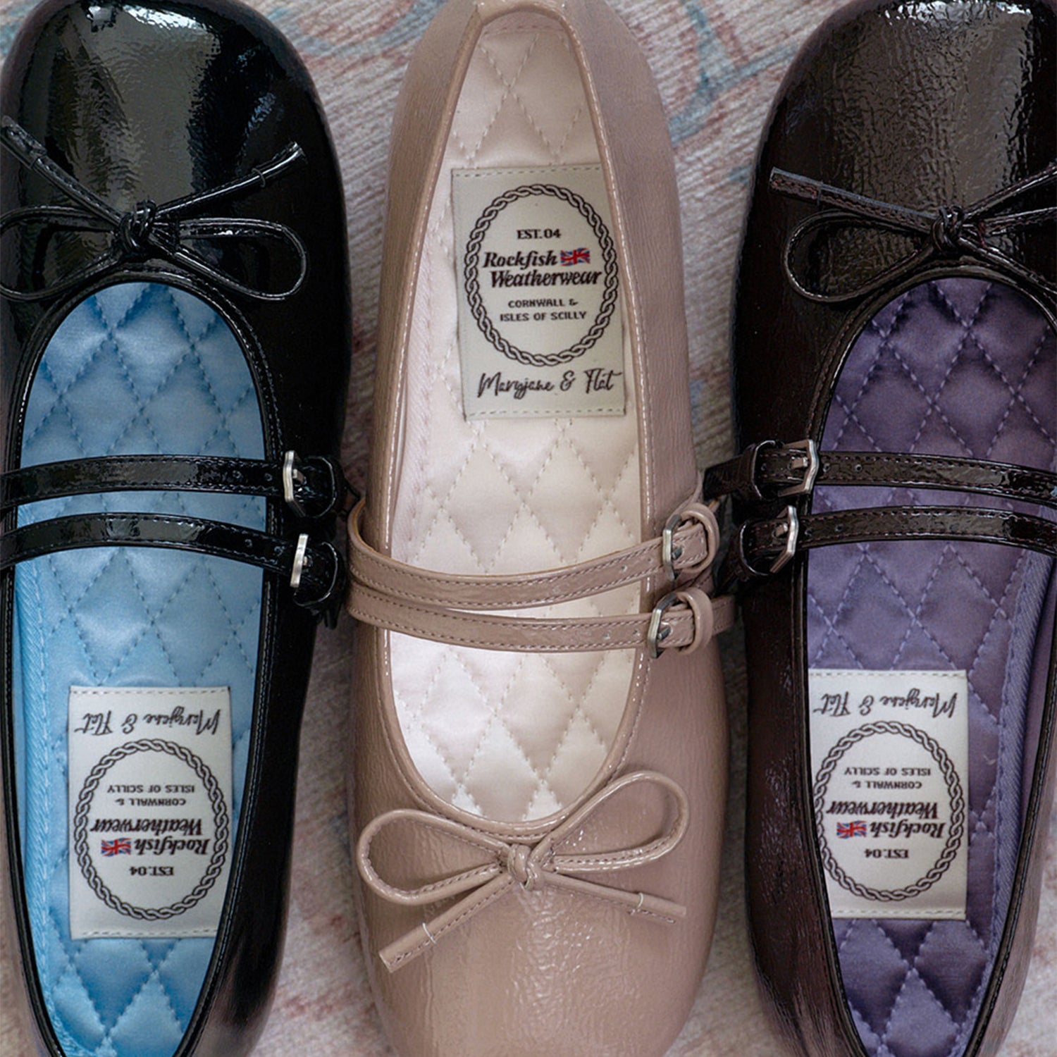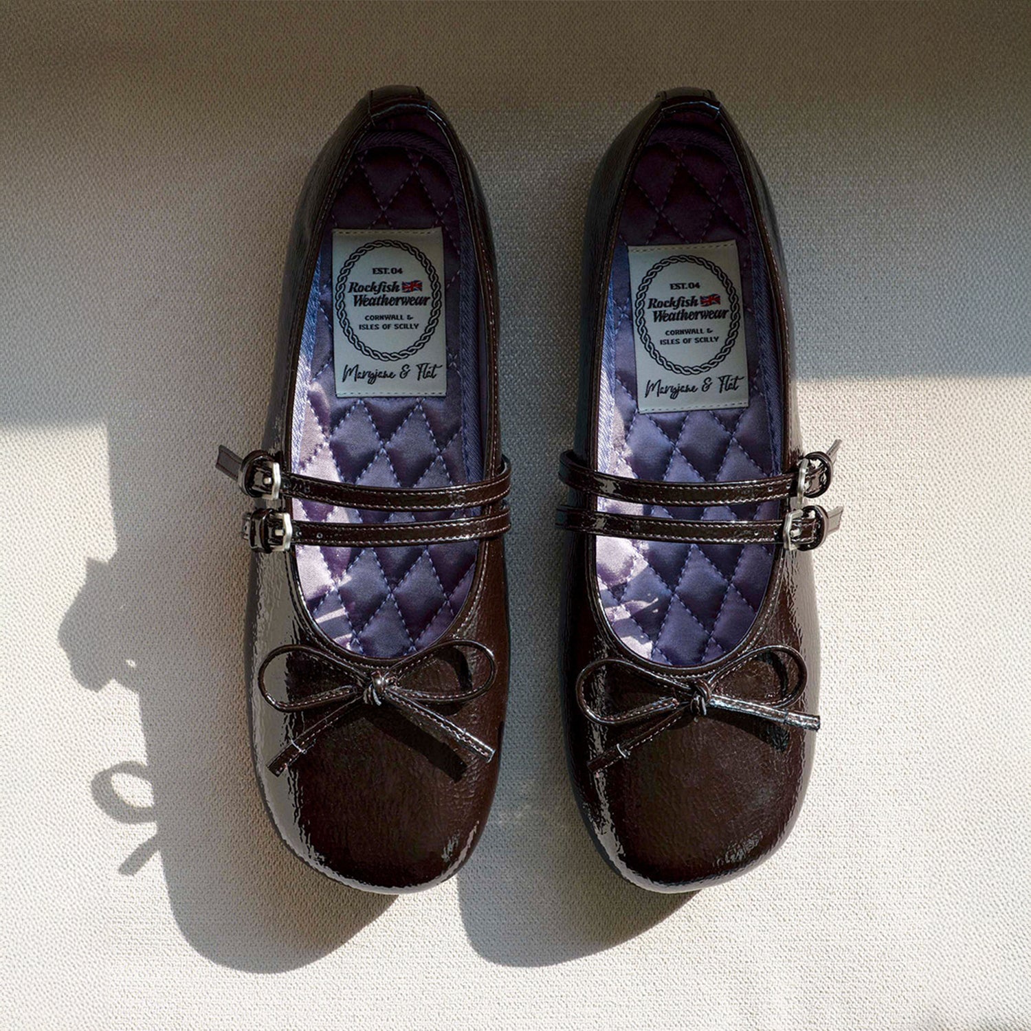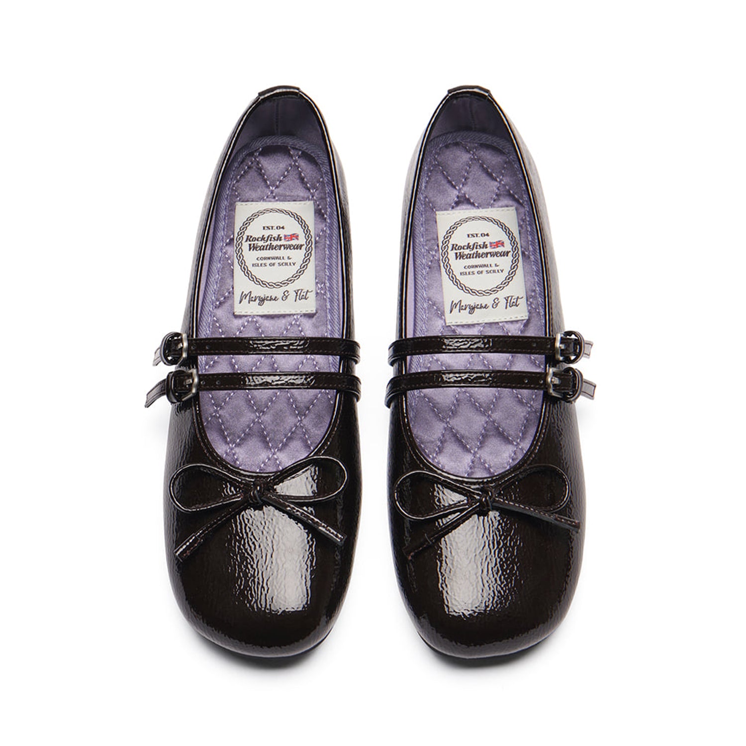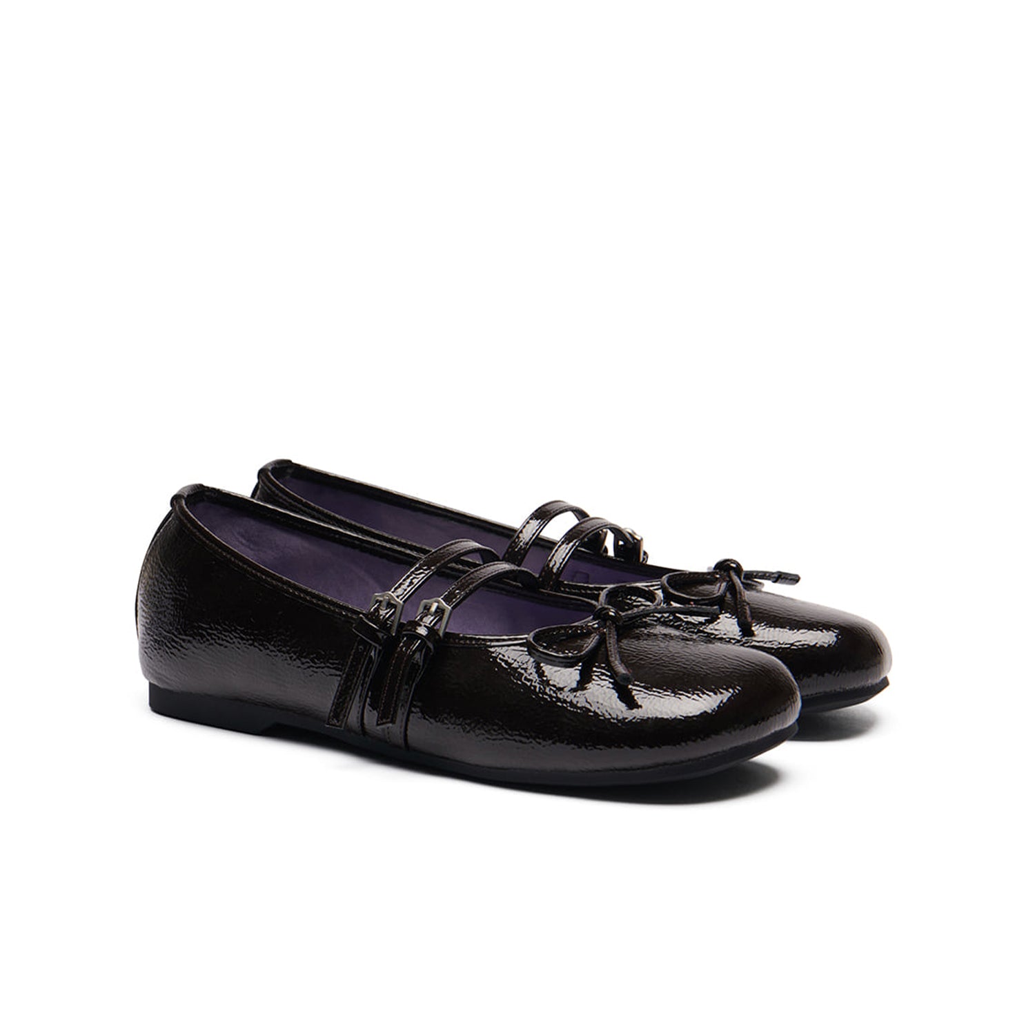 Mary Janes featuring a luxurious glossy enamel material and a square toe shape. The ribbon detail on the instep adds elegance and sophistication, and the slim two straps provide a comfortable and stable fit.