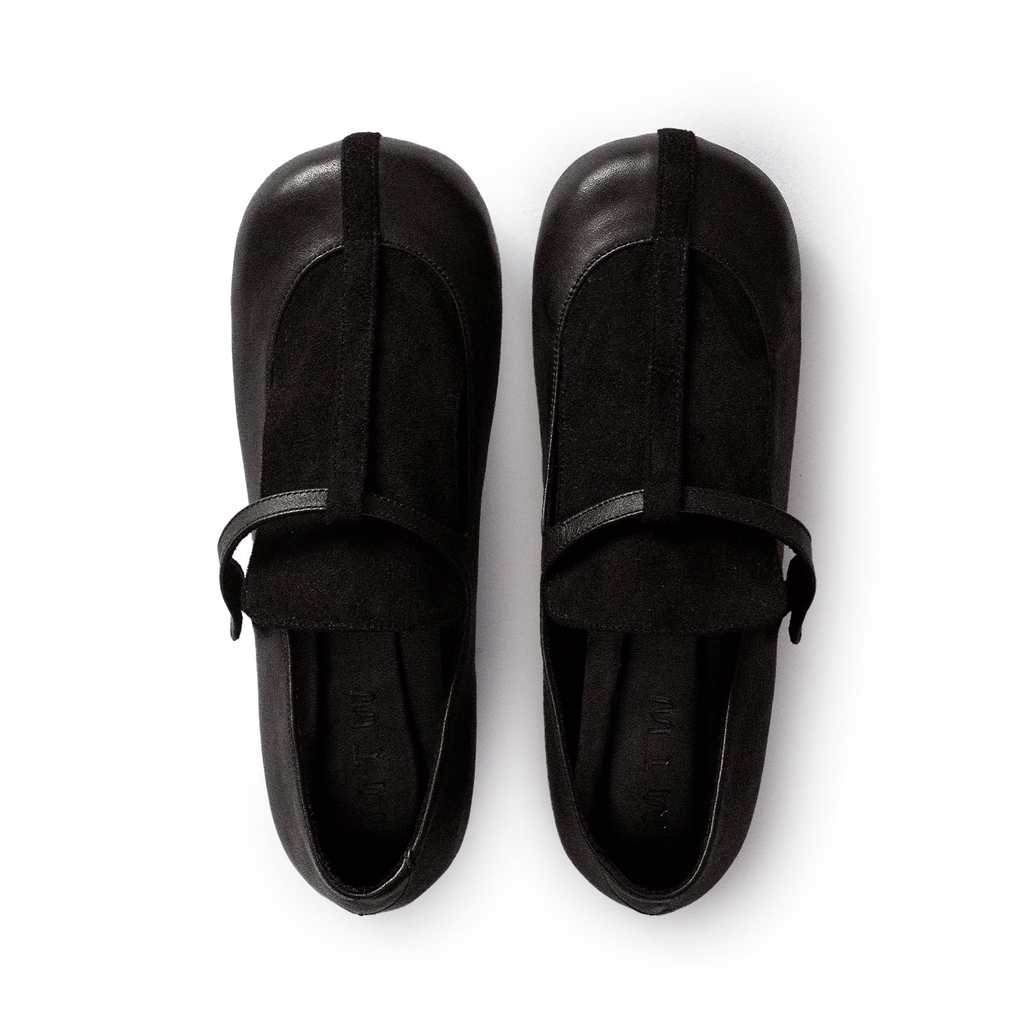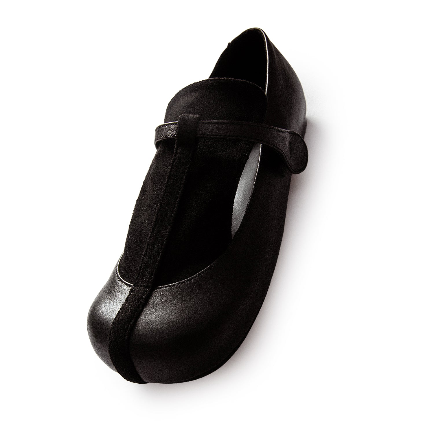 A rounded toe flat shoe crafted in genuine leather featuring a t-bar mary jane upper with a suede tongue.