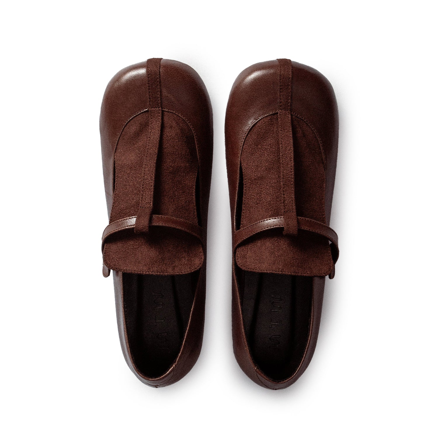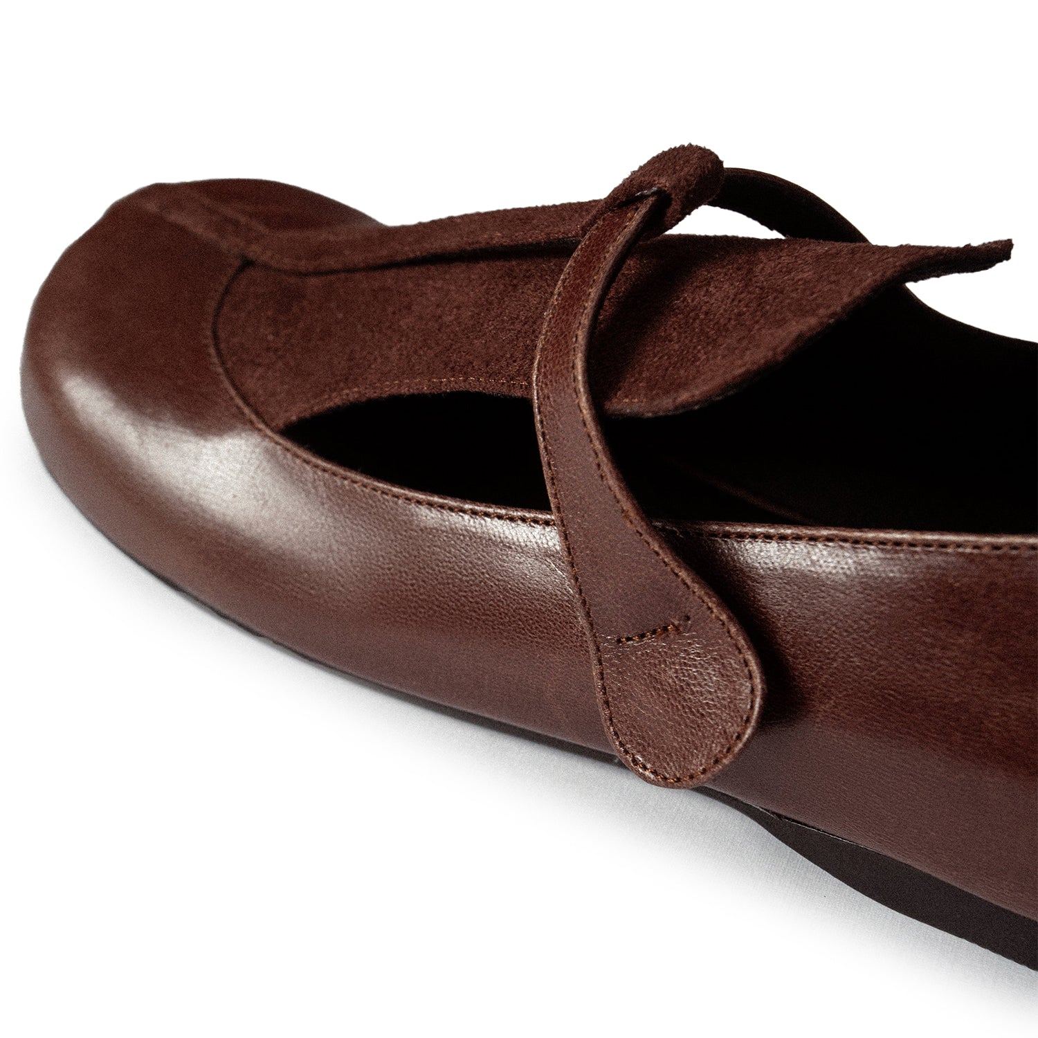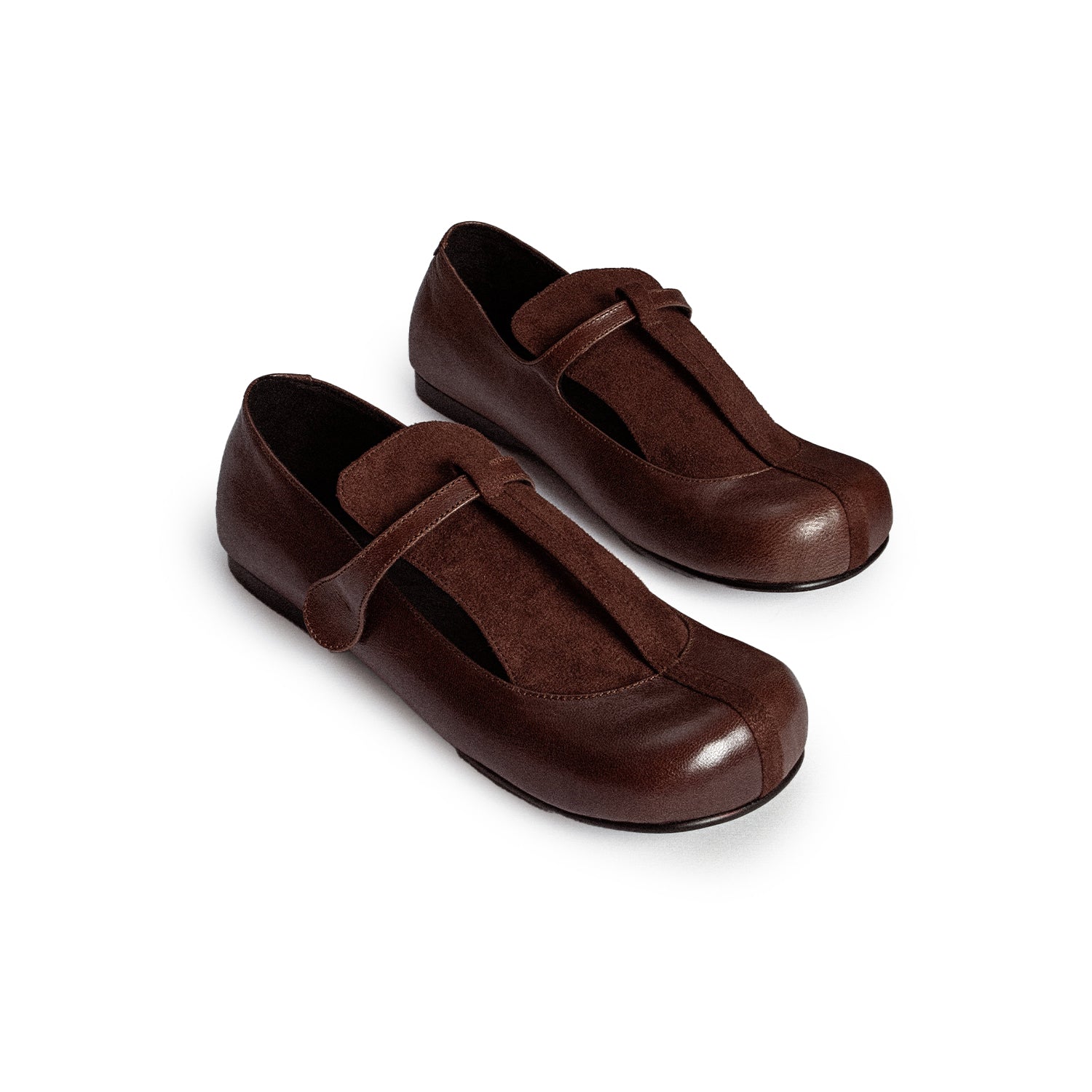 A rounded toe flat shoe crafted in genuine leather featuring a t-bar mary jane upper with a suede tongue.