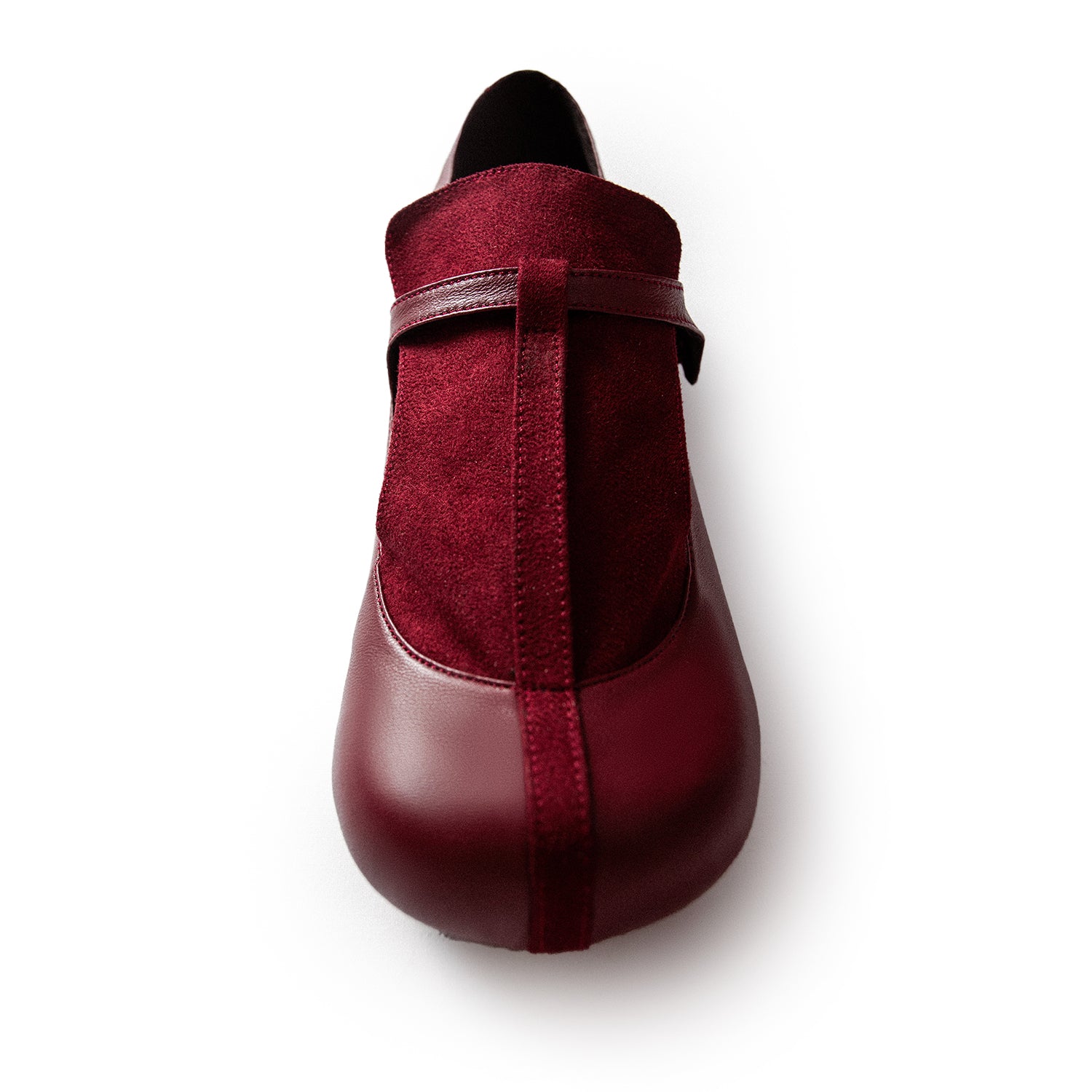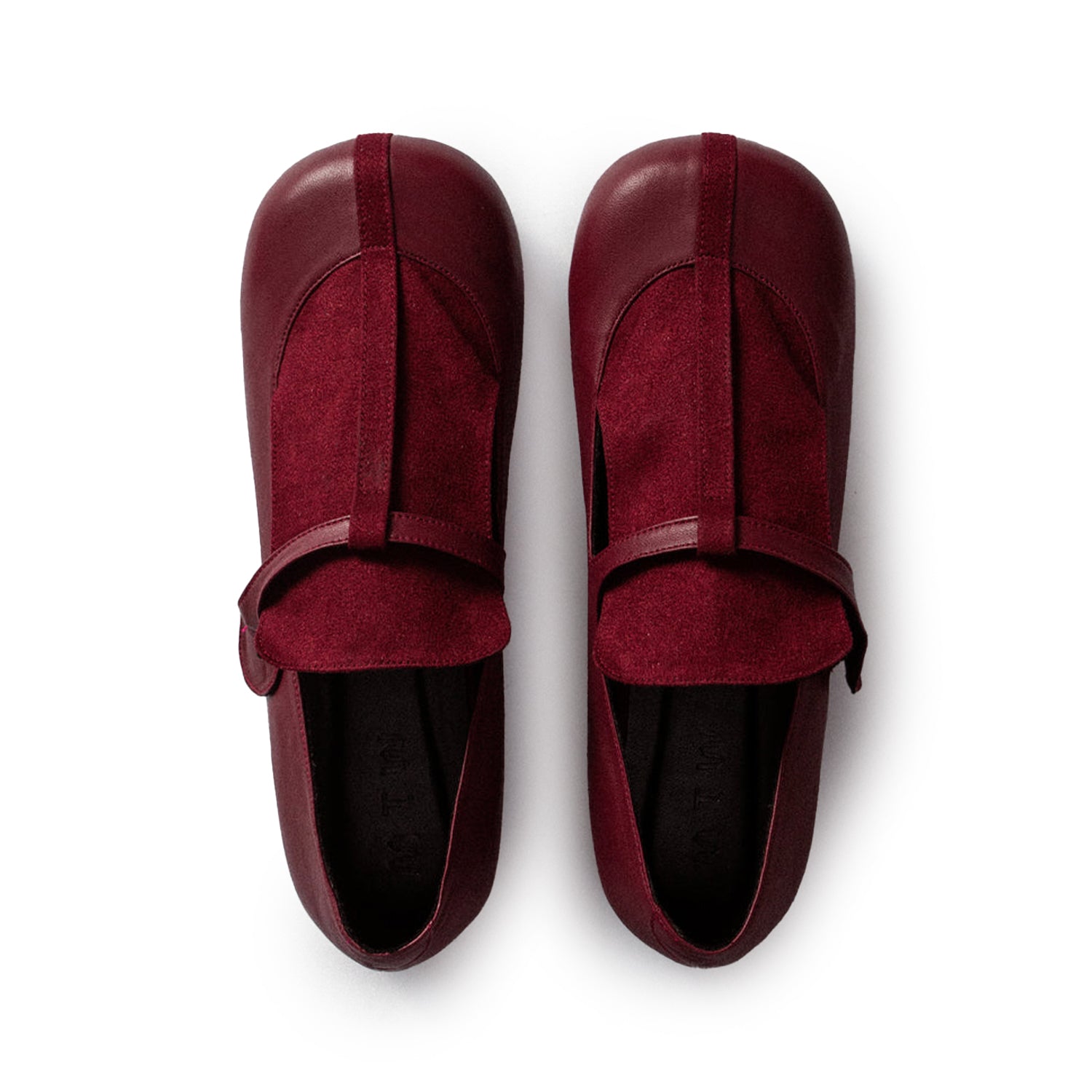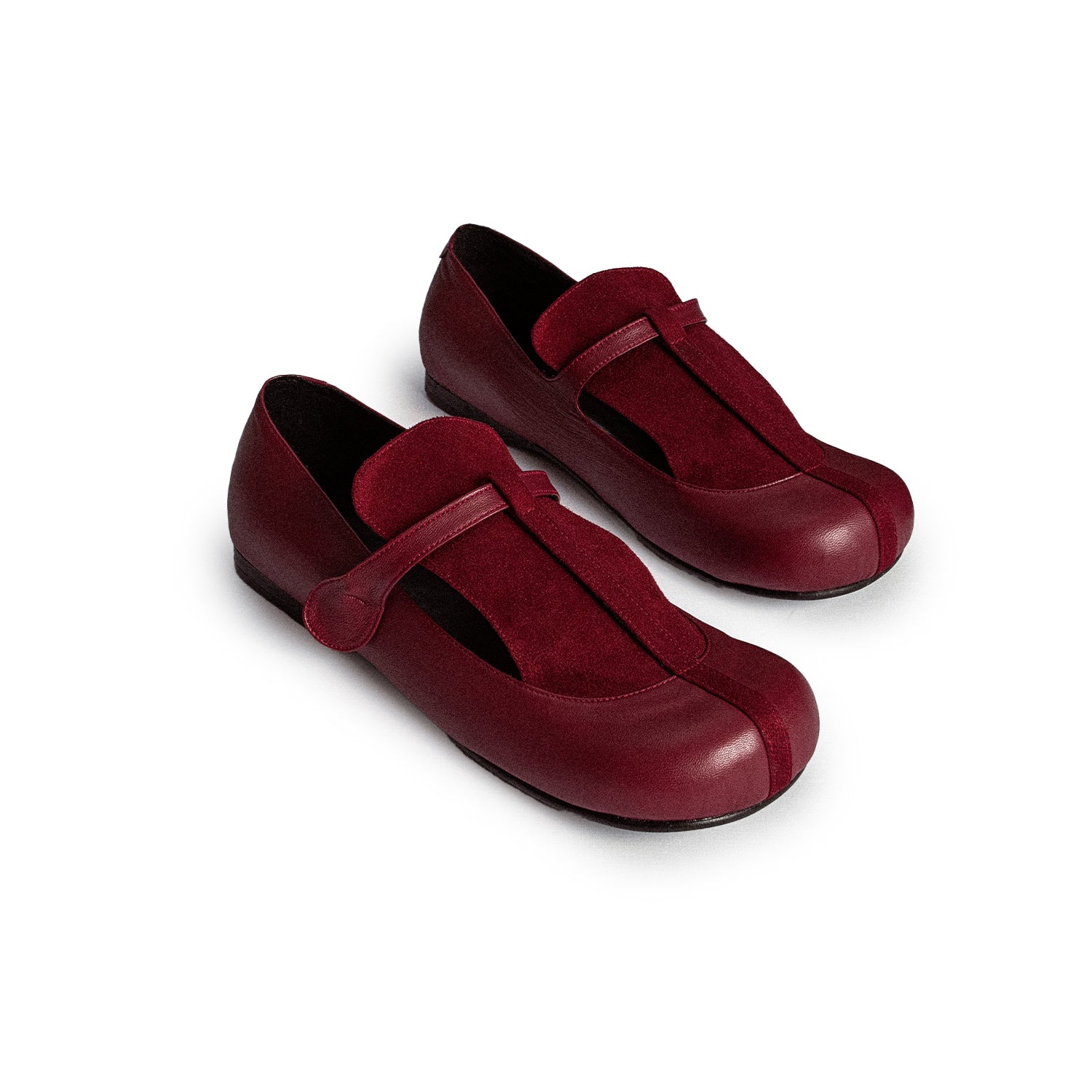 A rounded toe flat shoe crafted in genuine leather featuring a t-bar mary jane upper with a suede tongue.