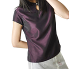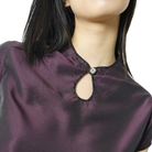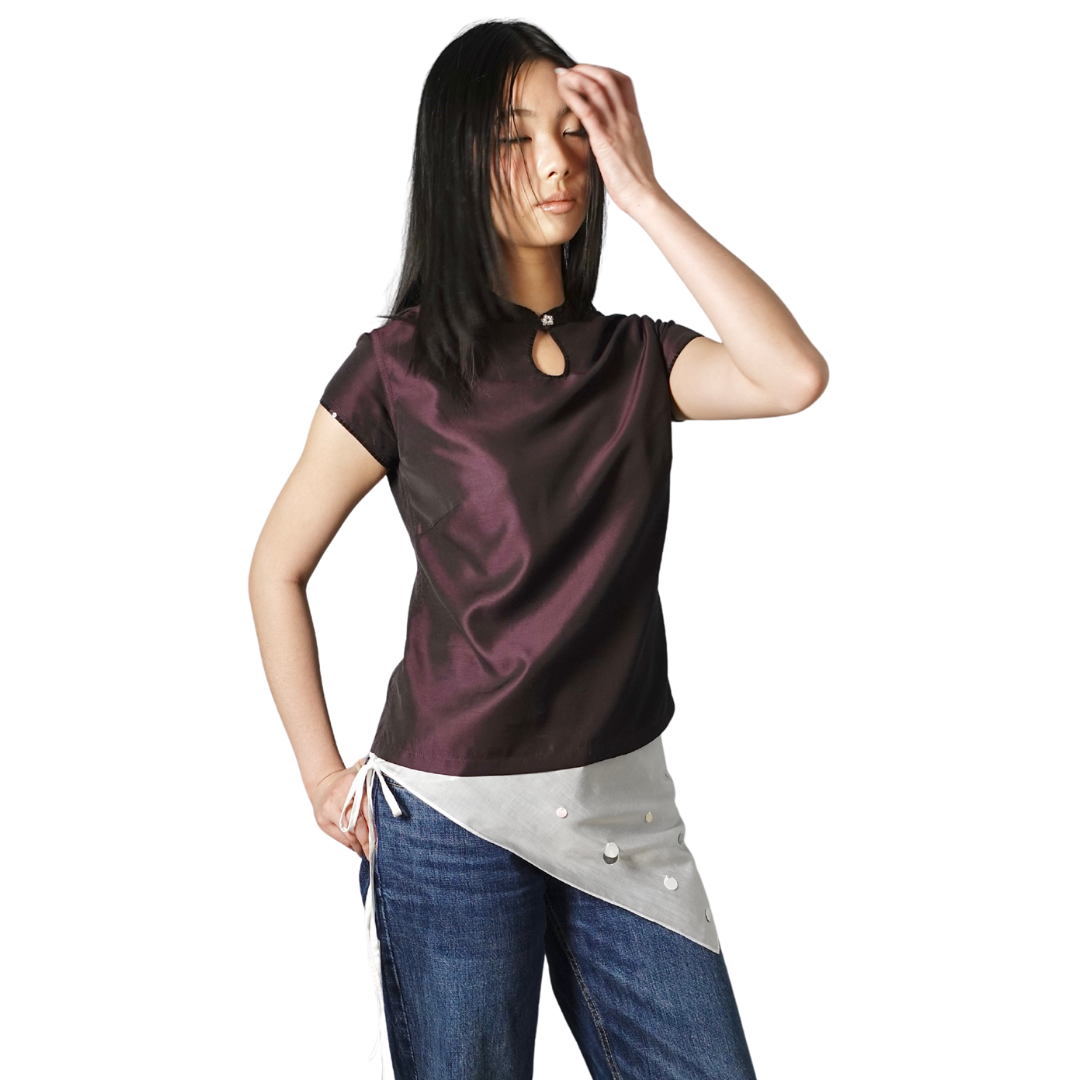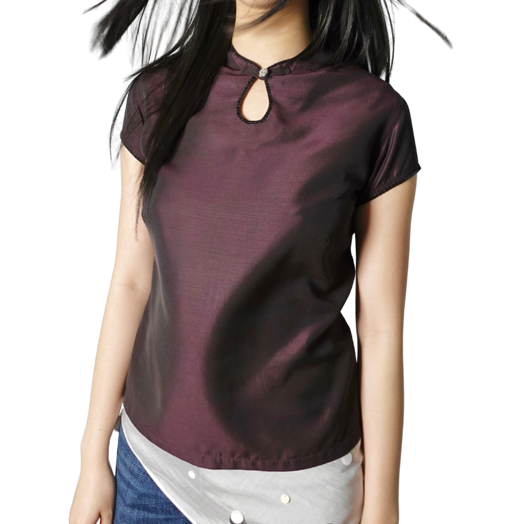 This lightweight fitted top features a modern cheongsam neckline detailing and hand- embellished trimmings and a beaded button ornament on the center front.