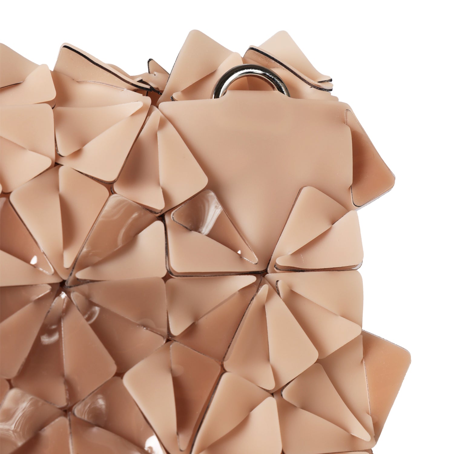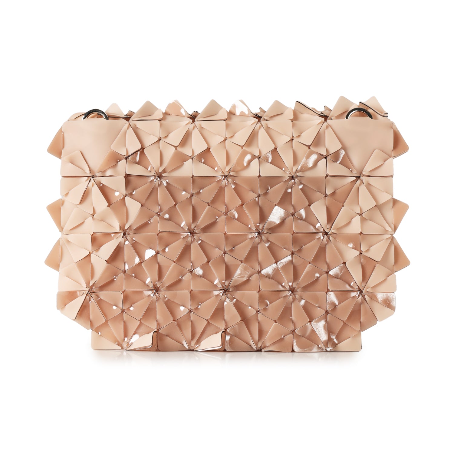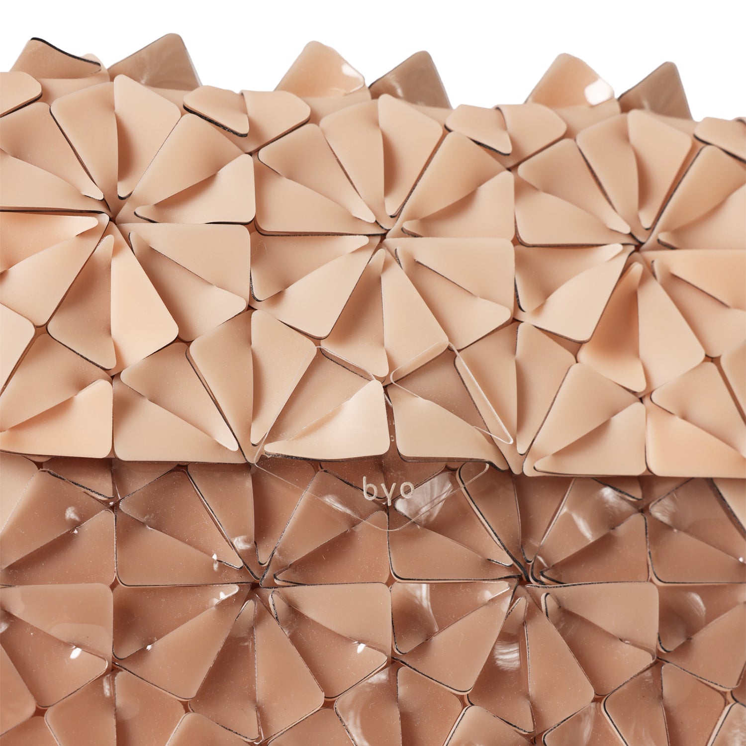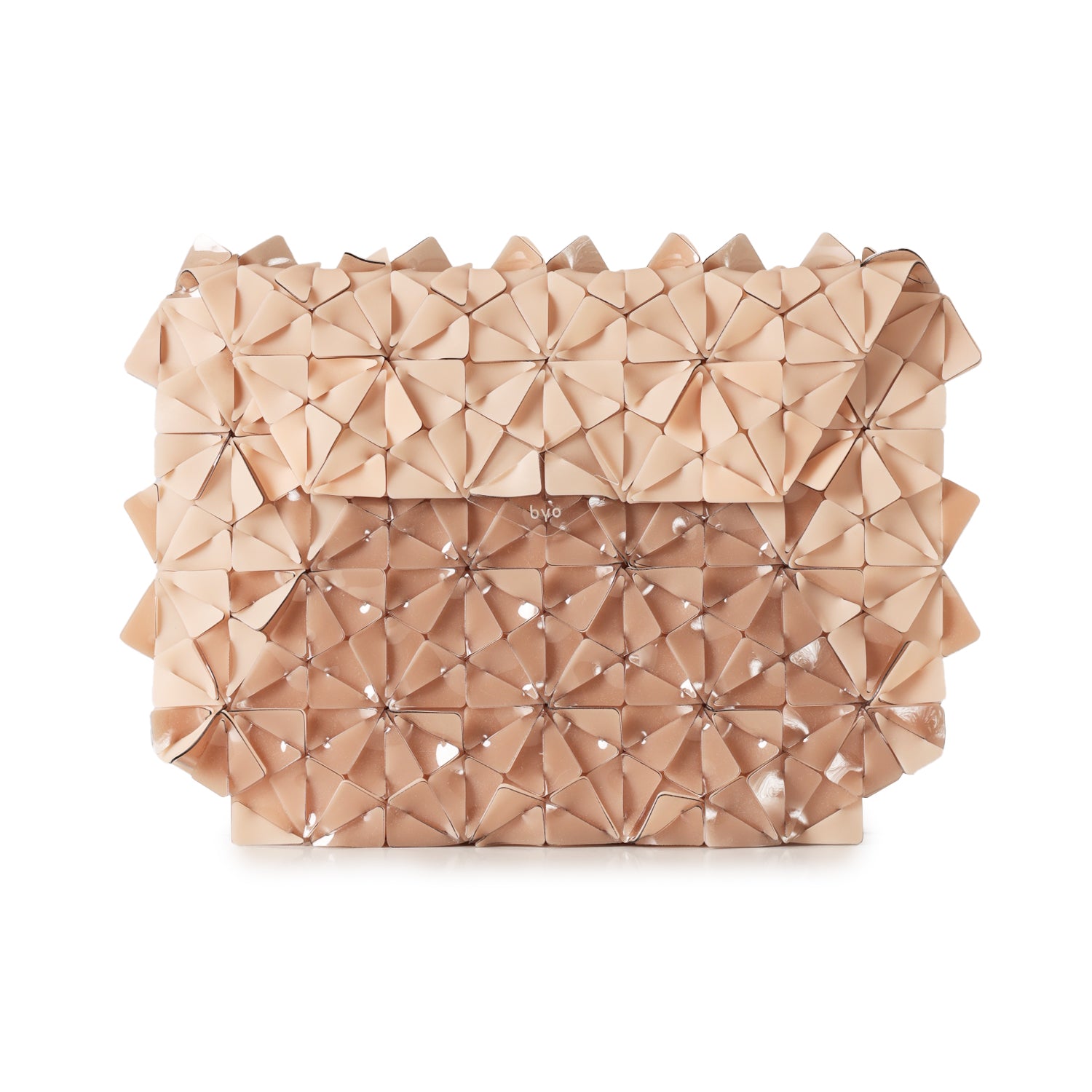 Machine-cut, Hand-woven geometric clutch held together by an interwoven right triangle shape. Soft and comfortable to hold 3D surface texture with rounded corners. Features a magnetic flap and a laser-cut acrylic label. Fits phones, keys, wallet, compact, or any of your everyday objects. D-rings are available for straps.